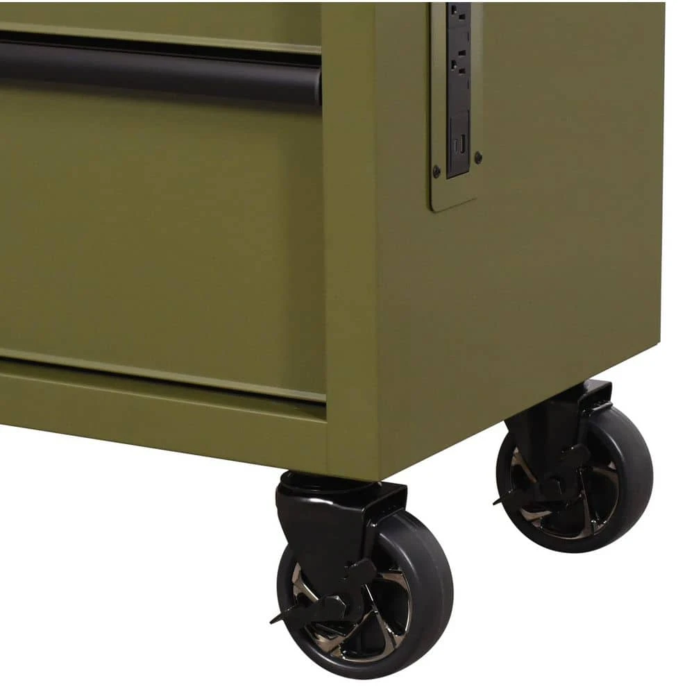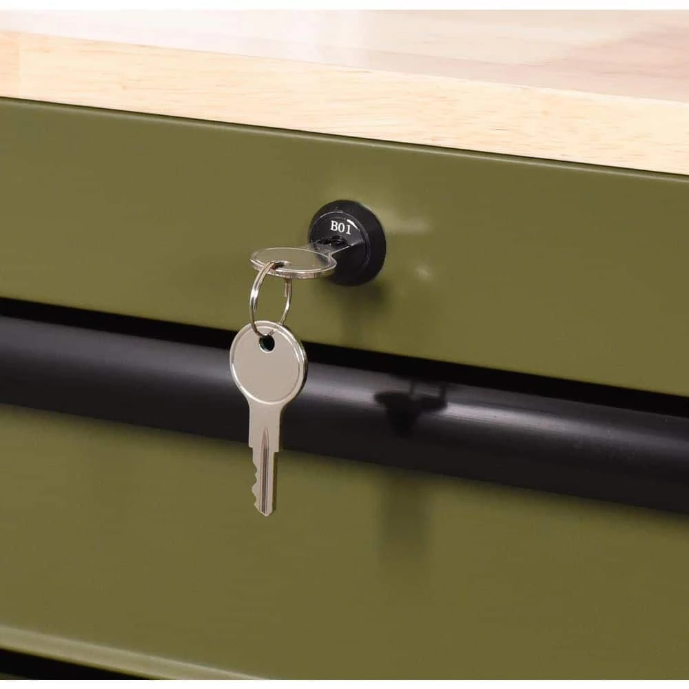 The all new Husky 46 in. W x 18 in. D 9-Drawer Mobile Workbench Cabinet has arrived. This workbench has a 21-Gauge steel frame finished with a gloss army green powder coat finish. There is a solid wood top that provides a 833 sq. in. work surface. On the right hand side is an integrated power strip providing 6 outlets and 2 USB ports to power and charge tools and batteries. Each of the drawers comes with a pre-cut liner and is supported by soft-closing ball-bearing slides that support up to 100 lbs. The deeper bottom drawers have a second set of slides to support heavier and bulkier items. A tubular side handle allows 1 to bring the workbench to wherever it is needed. 5 in. x 2 in. casters have a total load capacity of up to 1500 lbs.