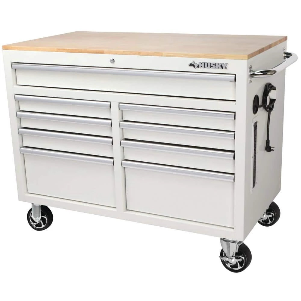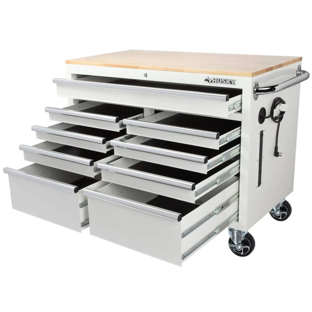 The all new Husky Extra-Deep 46 in. 9-Drawer Mobile Work Bench has arrived. This work bench is 24.5 in. D, which creates 36% more storage capacity than traditional 18 in. D units. The extra-depth also means there is a much larger solid wood top to use as a work surface for all your projects. An integrated power strip on the side of the work bench provides easy access to 6 outlets and 2 USB Ports, so your tools and other electronic devices can always be charged up and ready to go. There is plenty of storage options within the work bench inside the 9 lockable 21.7 in. D drawers. Each drawer glides easily on 100 lbs. rated ball-bearing soft-closing drawer slides and the large bottom drawers have an extra-set of slides to accommodate heavier items up to 200 lbs. Each drawer also has a premium pre-cut drawer liner that will protect both your tools and drawers. Finally, the entire work bench can easily move around your work space with four 5 in. x 2 in. casters and large ergonomic push handle.