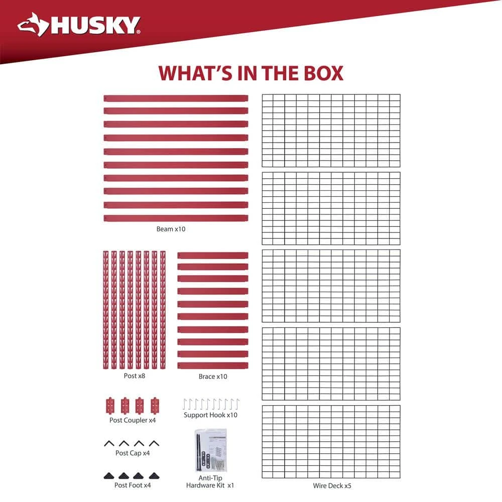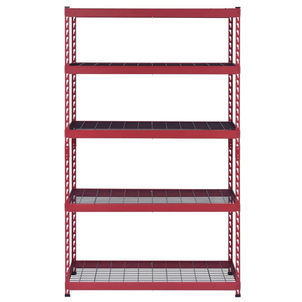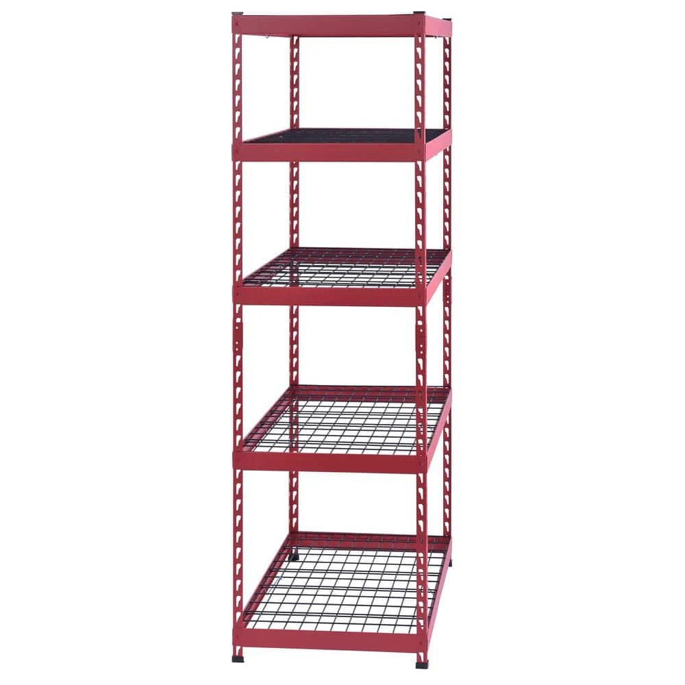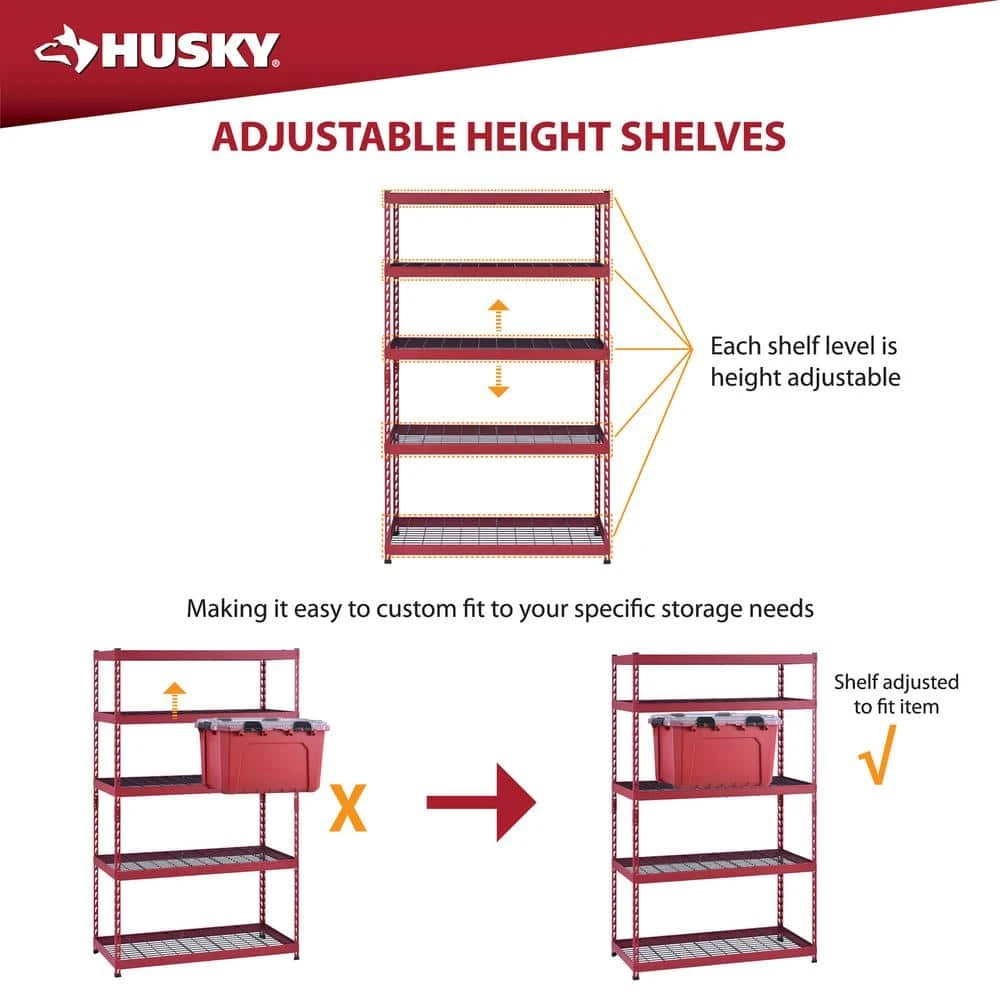 This Husky 5-shelf heavy-duty steel shelving unit can be assembled vertically as a 78 in. H unit or as 2 individual 39 in. H units. Its features all steel frame in Red with Black wire decking. You can adjust this multipurpose unit’s shelves in 2 in. increments to fit any storage need. It features a boltless design for easy assembly. This durable black wire decking provides better visibility, air flow and less dust accumulation.