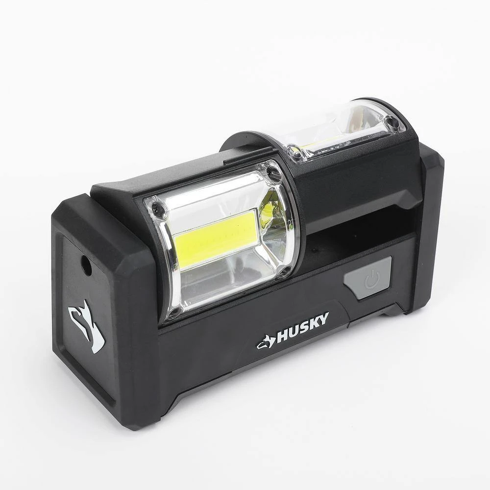 Husky 500 Lumens LED Utility is with dual-panel light. Durable rubber-covered to withstand 10 ft. drop resistant. 2 panel light is with 180° pivoting for different usage Reversed the light to turn off easily when complete the work. 2 panel light can reach 500 Lumens, 5-hours run time and 20 m throw. Built-in magnet and hook for different application.