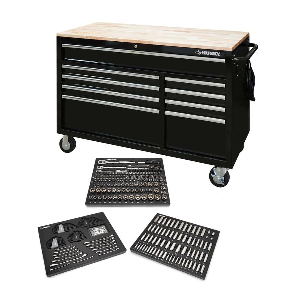 Built for its functional work space and large storage capacity the Husky 52 in. 9-Drawer 24.5 in. D mobile workbench is the perfect combination for your tool storage system. The Husky 290-piece 1/4 in., 3/8 in. and 1/2 in. drive mechanics tool set offers a comprehensive selection of tools for the professional or DIY mechanics workshop.This mobile work center has large, 5 in. x 2 in. casters and a steel tubular side handle, which allow you to easily move it, even when fully loaded. Each drawer is equipped with 100 lbs. rated ball bearing slides. The top long drawer and 2 deep bottom drawers have double sets of 100 lbs. rated soft closing slides to enable you to store your heavier bulk items. It is constructed with heavy 21-Gauge steel and is strong enough to support 1,200 lbs. and has 23,362 cu. in. storage capacity. The 1 in. thick solid wood top is sealed with a protective coating to protect it from the elements. The wide variety of standard and deep sockets along with the assortment of combination wrenches and bit sockets will allow you to tackle any fastening or repair project. This Husky 290-piece tool set will provide the novice or professional with a huge assortment of durable and reliable tools to get the job done. This set comes packed into portable EVA foam storage trays to keep your tools organized inside your toolbox.