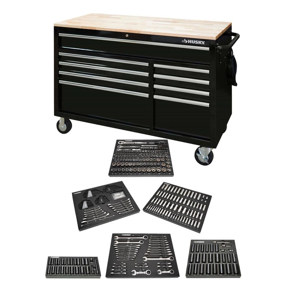 Pairing seamlessly with the 52 in. 9-Drawer Mobile Workbench, in Gloss Black, the 370-piece 1/4 in., 3/8 in. and 1/2 in. drive mechanics tool set is ideal for both professionals and DIY enthusiasts alike. This comprehensive set includes standard and deep sockets, combination wrenches, stubby wrenches, bit sockets and impact sockets to handle any fastening or repair project. The 12-point design of the Husky Ratcheting Wrenches prevents fastener damage and increases torque, while the polished chrome finish ensures corrosion resistance for a lifetime of use. The alloy steel construction guarantees long-lasting performance and the box-end design provides additional leverage to prevent slipping on hard-to-remove fasteners. With a ratcheting box-end requiring only a 5° arc to turn a fastener, even hard-to-reach areas become accessible. All 370 pieces are neatly organized in portable EVA foam storage trays, keeping your tools organized inside your toolbox. This Husky tool set is a reliable companion for both novice and professional users, offering a vast assortment of durable tools to tackle any job with ease.