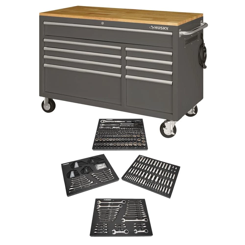 Pairing seamlessly with the 52 in. 9-Drawer Mobile Workbench, in Gloss Gray, the 320-piece 1/4 in., 3/8 in. and 1/2 in. drive mechanics tool set is ideal for both professionals and DIY enthusiasts alike. This comprehensive set includes standard and deep sockets, combination wrenches, stubby wrenches and bit sockets to handle any fastening or repair project. The 12-point design of the Husky Ratcheting Wrenches prevents fastener damage and increases torque, while the polished chrome finish ensures corrosion resistance for a lifetime of use. The alloy steel construction guarantees long-lasting performance and the box-end design provides additional leverage to prevent slipping on hard-to-remove fasteners. With a ratcheting box-end requiring only a 5° arc to turn a fastener, even hard-to-reach areas become accessible. All 370-pieces are neatly organized in portable EVA foam storage trays, keeping your tools organized inside your toolbox. This Husky tool set is a reliable companion for both novice and professional users, offering a vast assortment of durable tools to tackle any job with ease.