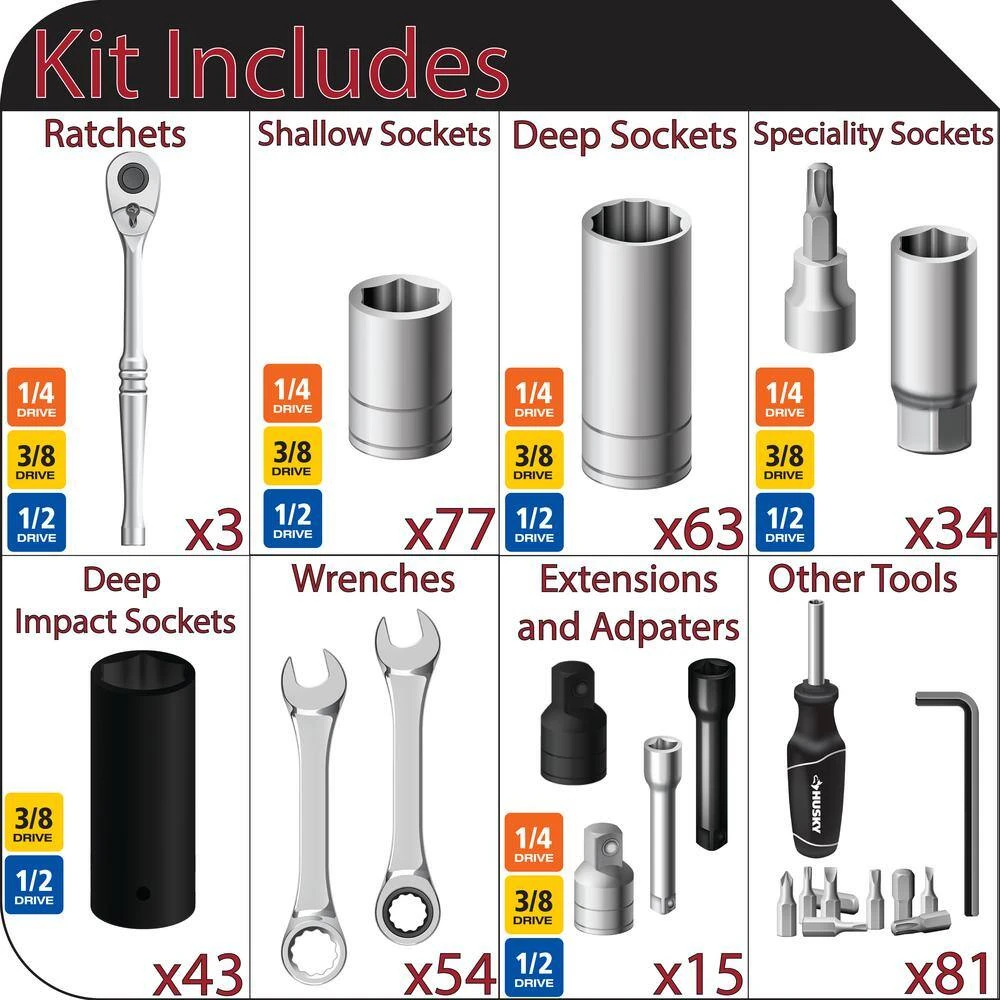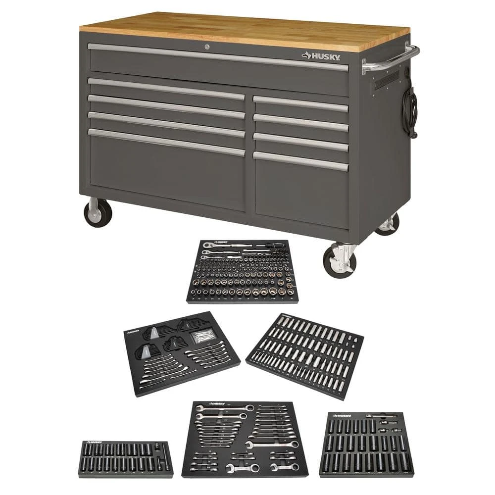 Pairing seamlessly with the 52 in. 9-Drawer Mobile Workbench, in Gloss Gray, the 370-piece 1/4 in., 3/8 in. and 1/2 in. drive mechanics tool set is ideal for both professionals and DIY enthusiasts alike. This comprehensive set includes standard and deep sockets, combination wrenches, stubby wrenches, bit sockets and impact sockets to handle any fastening or repair project. The 12-point design of the Husky Ratcheting Wrenches prevents fastener damage and increases torque, while the polished chrome finish ensures corrosion resistance for a lifetime of use. The alloy steel construction guarantees long-lasting performance and the box-end design provides additional leverage to prevent slipping on hard-to-remove fasteners. With a ratcheting box-end requiring only a 5° arc to turn a fastener, even hard-to-reach areas become accessible. All 370 pieces are neatly organized in portable EVA foam storage trays, keeping your tools organized inside your toolbox. This Husky tool set is a reliable companion for both novice and professional users, offering a vast assortment of durable tools to tackle any job with ease.