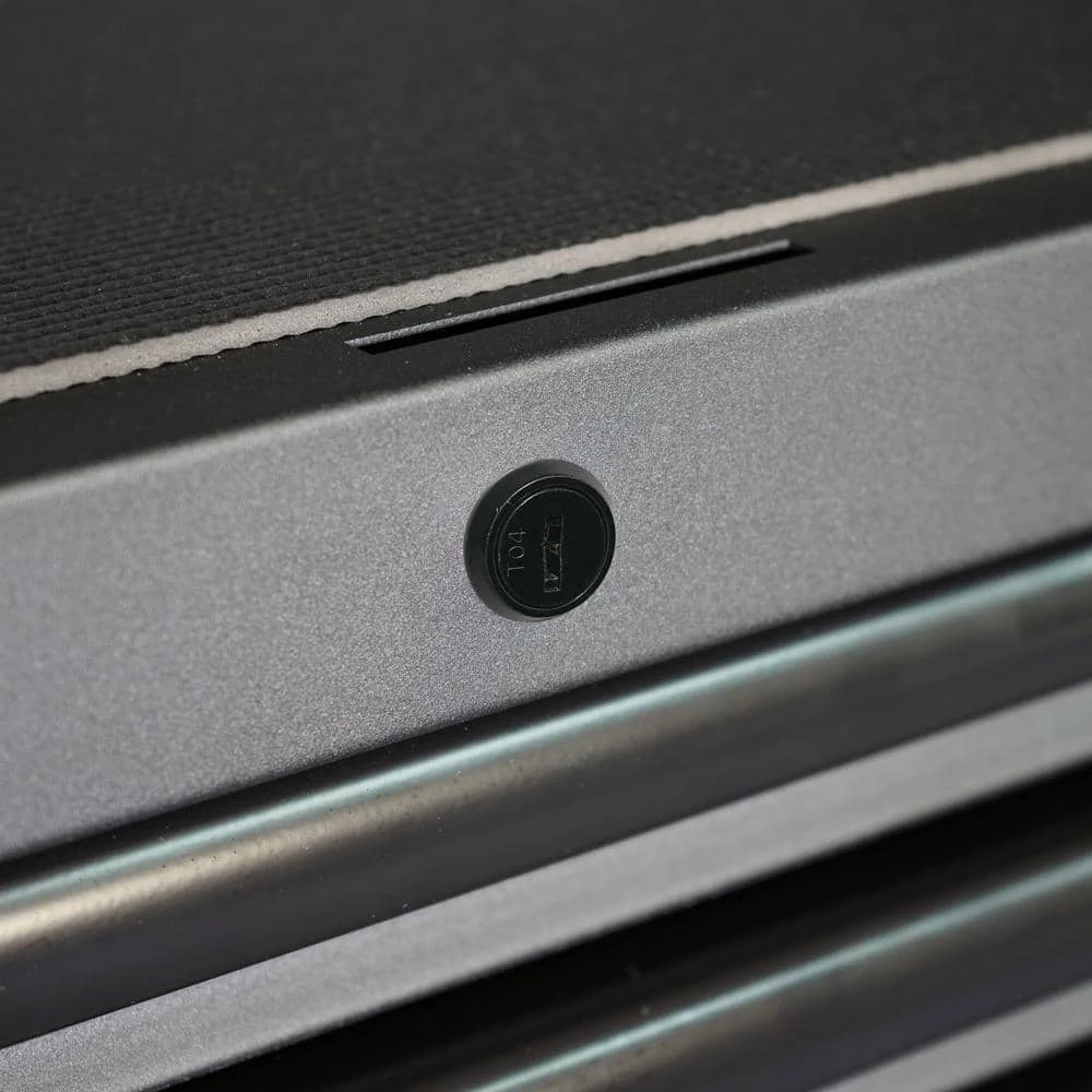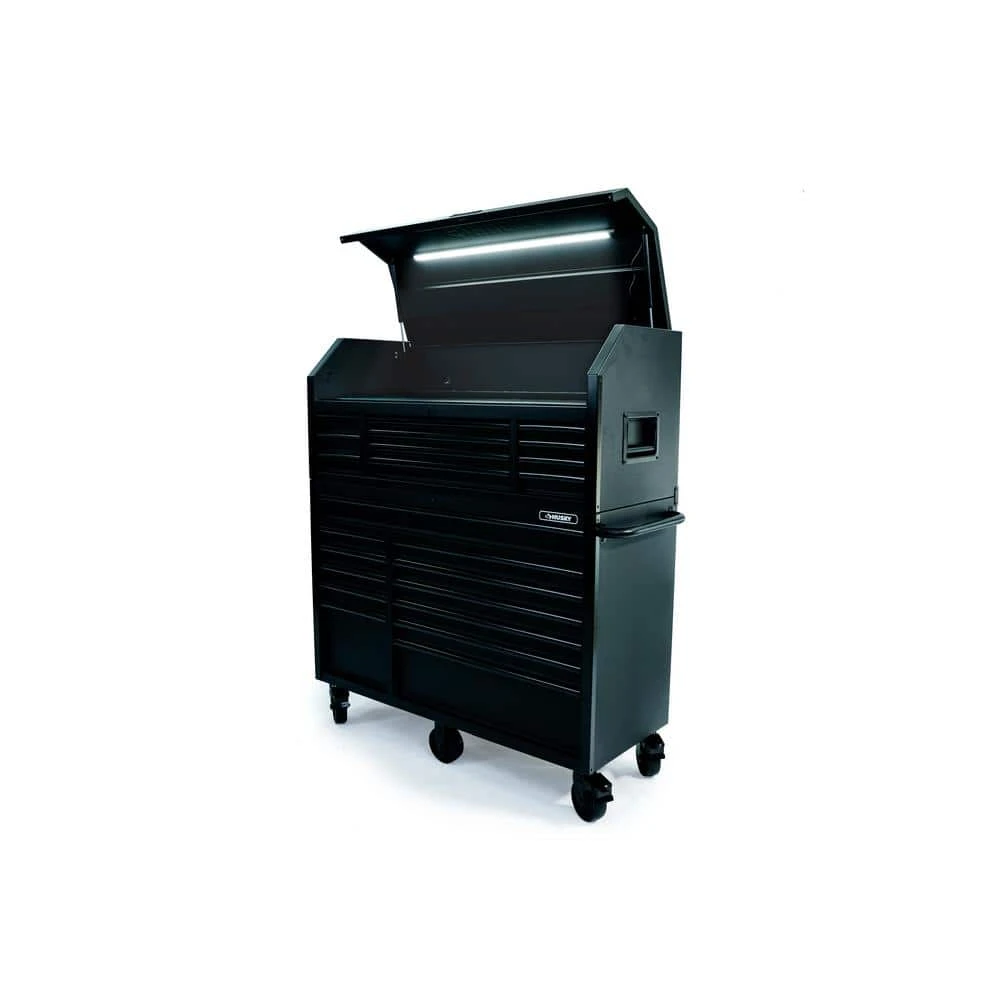 The Husky 56 in. W, 22 in. D with 23 drawers Tool Chest and Cabinet Set is a heavy duty, 18-Gauge steel, tool storage unit that is rated for 3,000 lb. loading capacity. This matte black tool chest and cabinet set with 23 drawers provide 42,930 cu. in. of storage. The heavy duty drawers on the combo tool chest are rated to 120 lbs. each. The extra deep bottom drawers on this Husky 56 inch tool box have double 120 lb. glides. The full length drawer provides convenient storage for longer items, and the small drawers keep smaller items in a confined space. Drawer liners are included to protect and keep your tools in place. The built in full length power strip on this matte black tool chest includes 8 outlets and 2 USB ports, making it easy to keep all of your tools charged. For added security, both the chest and cabinet are fitted with a key and lock system. This 56 inch toolbox weighs in at 542 lbs. so the 6 in. x 2 in. heavy duty industrial grade glides with easy locking pedals are needed to smoothly role this unit around your work area. This combo tool chest is perfect for your garage or workstation.