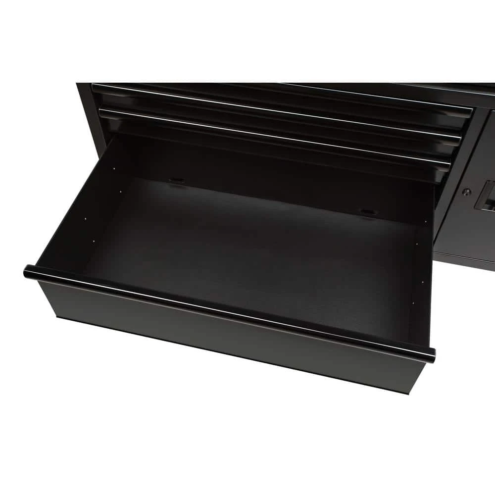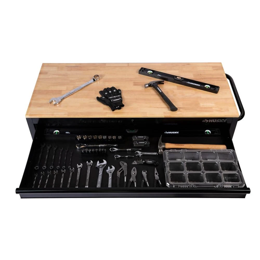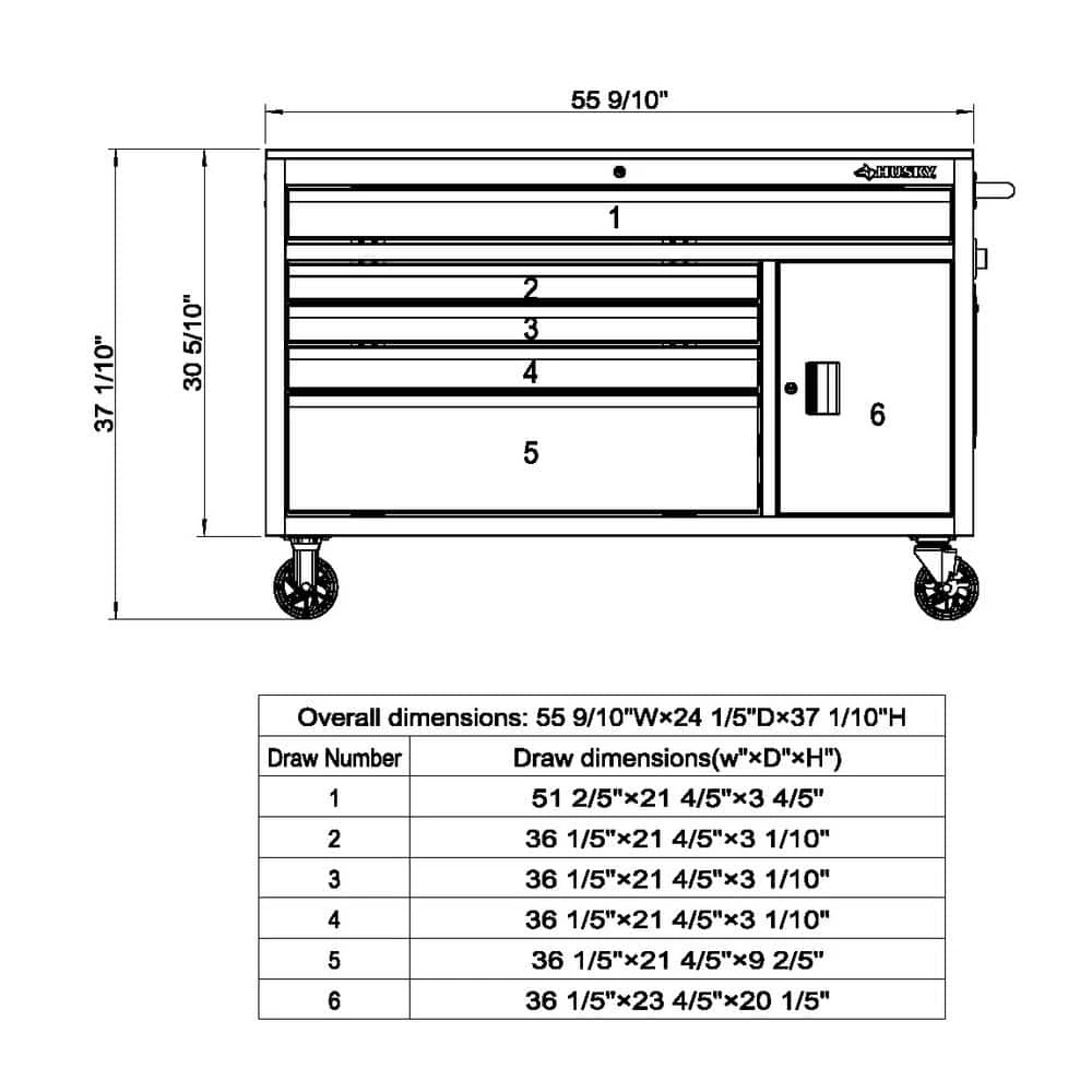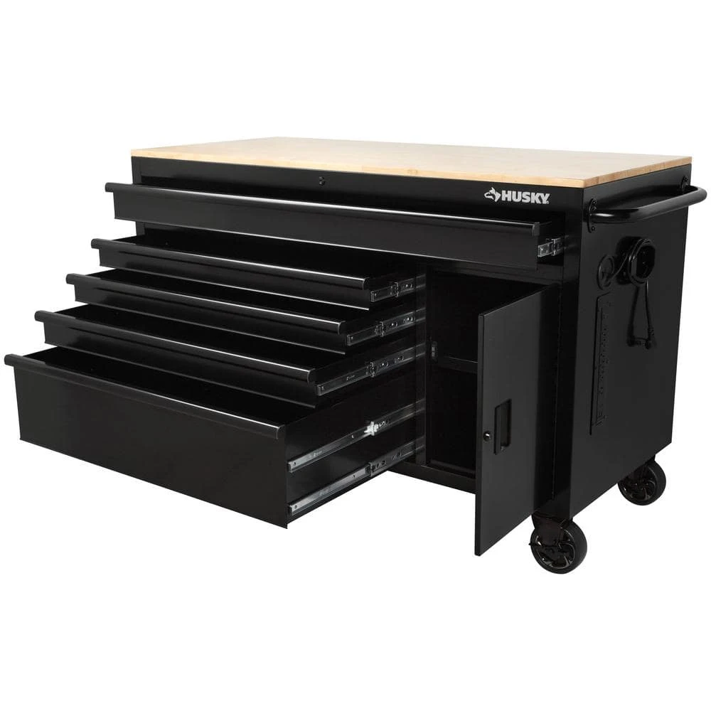 The Husky 56 in. W x 24.5 in. D 5-Drawer Mobile Workbench with Solid Wood Top is a new and exciting configuration in the Husky mobile workbench lineup. This workbench has an all-welded steel construction and is available in a variety of powder coat finishes. This unit has a solid wood top that creates an expansive 1,372 sq. in. to work on any project. Each drawer opens and closes easily on ball-bearing slides that are rated for up to 120 lbs. and features a soft-closing retention system that prevents the drawers from slamming closed and ensures they stayed closed. The bottom drawer has 2 sets of slides to accommodate even heavier tools and supplies. All drawers have pre-cut liners included to protect your tools. On the right-hand side of the workbench is a bulk storage area that provides 6,430 cu. in. of storage space and an adjustable shelf rated for 130 lbs. The right-hand exterior side of the workbench has an integrated power strip with 6 power outlets and 2 USB ports that allows you to keep your tools and electronic accessories always powered up. Making this workbench mobile are four 5 in. x 2 in. casters with stylish hubcaps that can support up 1200 lbs. and an ergonomic tubular push handle. Finally, have-piece of mind knowing your tools are secured with the internal locking system.