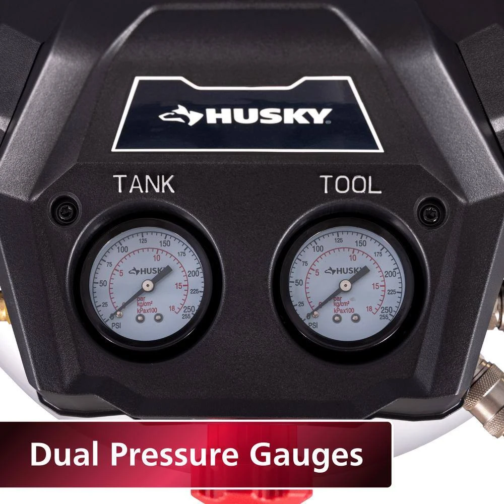 The Husky 6 Gal. 150 PSI Portable Air Compressor is engineered for reliable performance across pneumatic tasks. Its 6-gallon aluminum tank and 1.3 horsepower induction motor deliver consistent power, reaching a maximum 150 PSI to tackle demanding applications with ease. Operating at just 65 decibels, it ensures quiet performance, ideal for workshops or noise-sensitive job sites without sacrificing strength. Dual gauges provide precise monitoring of air and tool pressure, keeping you in control. Designed for convenience, it features an integrated carry handle for easy portability and rubber feet to enhance stability and reduce vibrations. With two quick couplers and an air tank drain valve, it offers versatile operation and simplified maintenance. Weighing 40.12 pounds, this compressor is built for durability, with its lightweight aluminum tank and robust construction supporting a 1000-hour lifecycle at a 50% duty cycle, ensuring long-term reliability for professional and DIY projects. Compact, powerful, and quiet, this Husky compressor is a dependable addition to any toolkit for consistent, high-quality results.