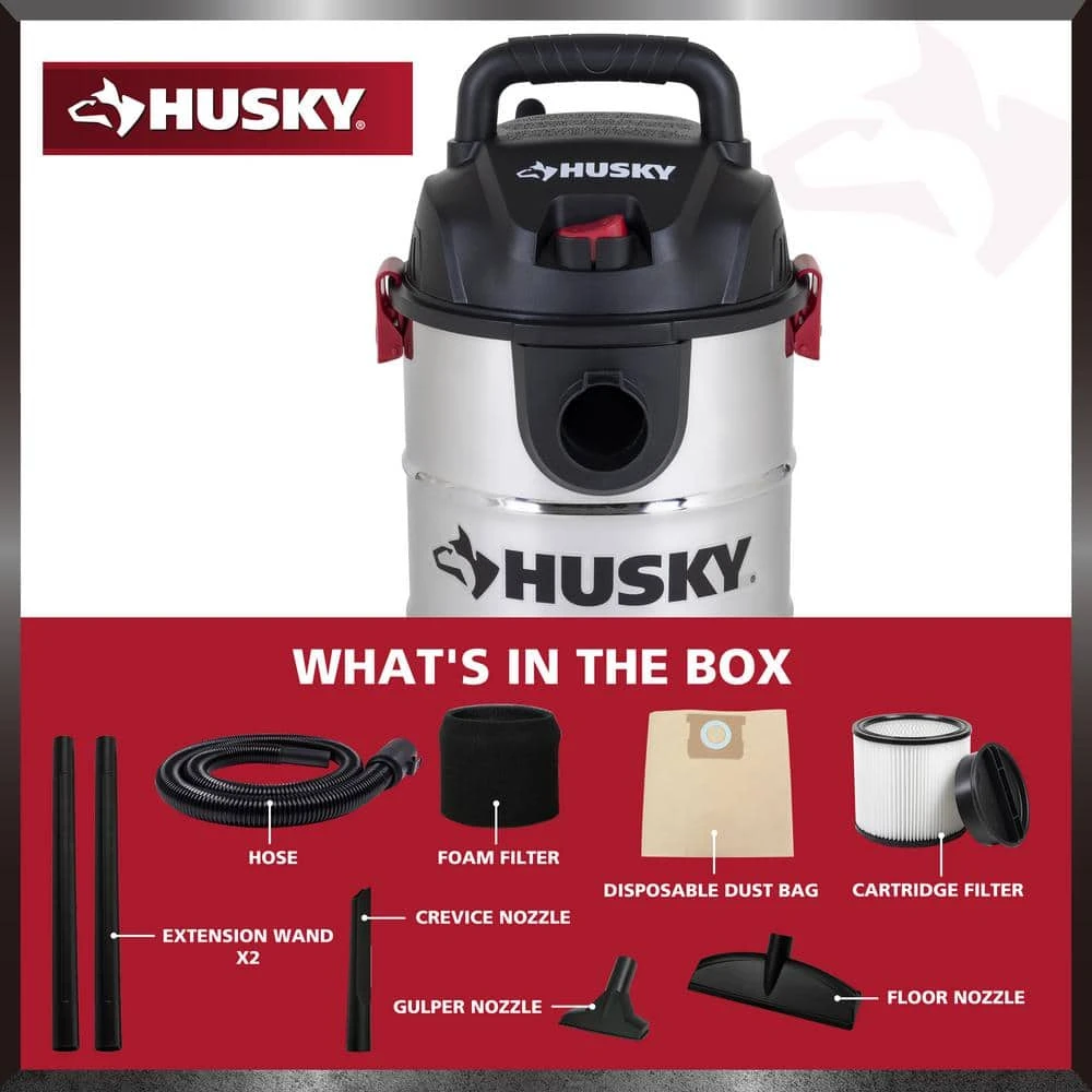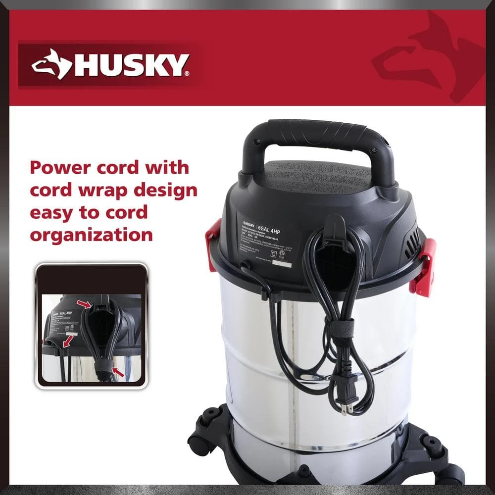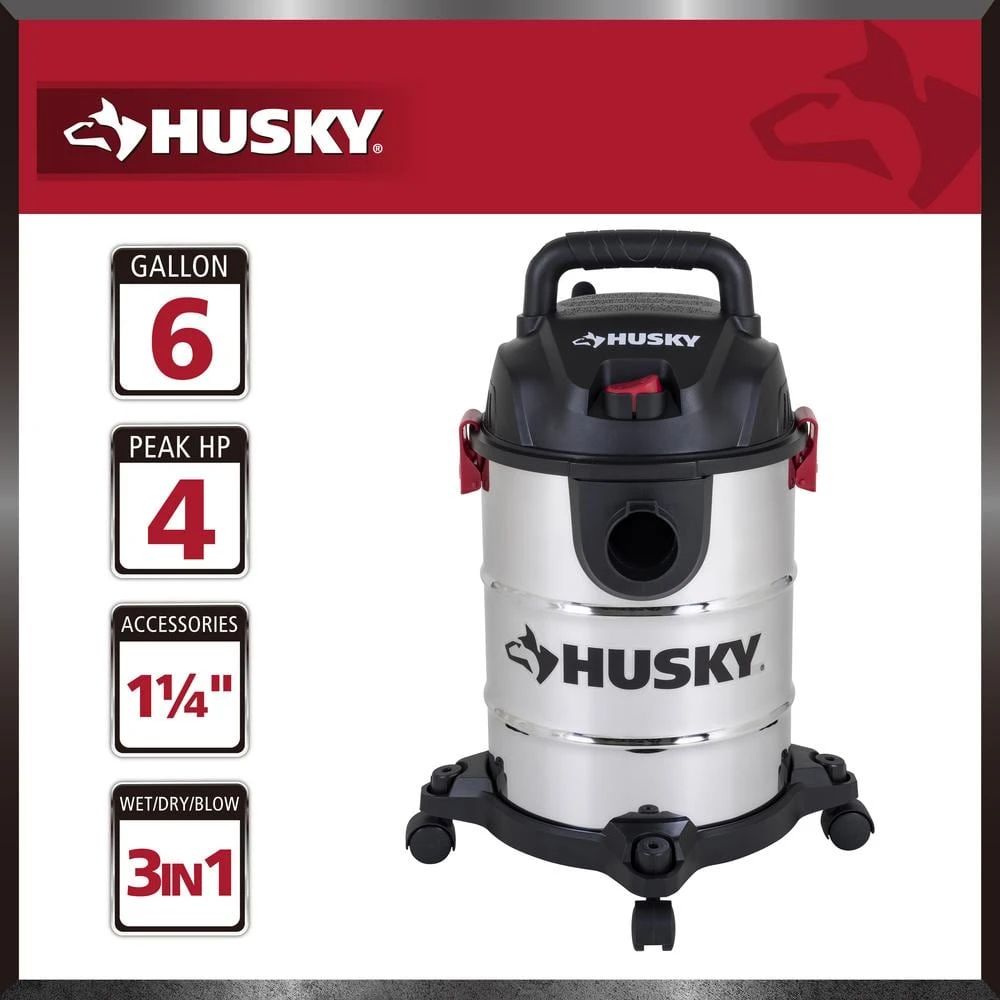 The Husky 6 Gal.* Stainless Steel Wet/Dry Vac features a strong handle for easy portability. Its large on/off switch and swiveling casters provide ease of use no matter the chore. Whether you need to tackle a wet or dry mess, let this vac help you make short work of any job. *Tank capacity refers to actual tank volume and does not reflect capacity available during operation.**Peak Horsepower