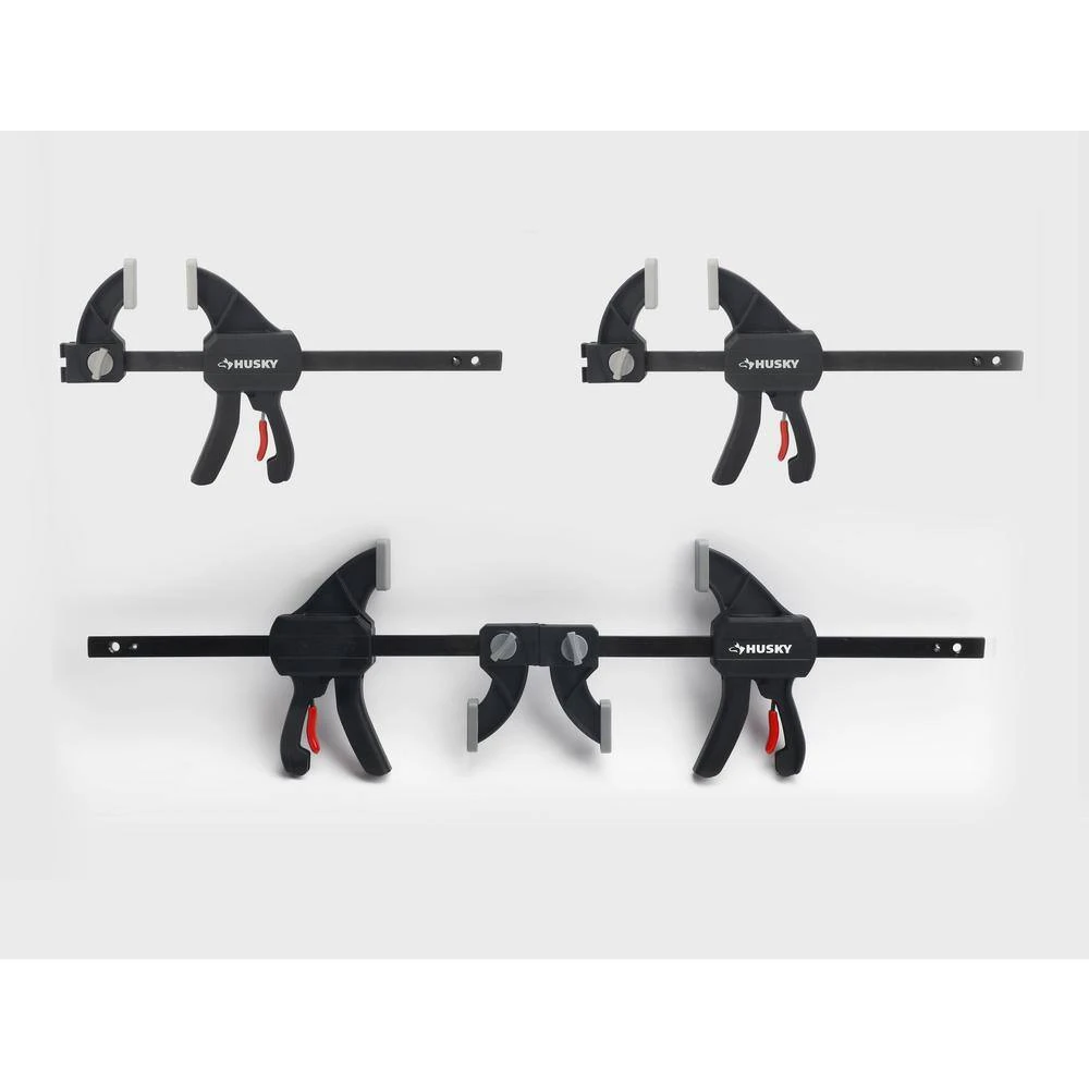 This 6-Piece Trigger Clamp Set includes a 4-piece 6 in. trigger clamp and 2-piece 4.5 in. trigger clamp for increased clamping pressure. For models over 6 in., the new expandable feature allows for two clamps to be combined into one single clamp of double the length for expanded uses. For example: turn two 6