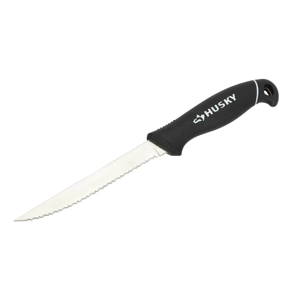 The Husky Serrated Blade Insulation Knife is designed for optimal edge retention and durability. The stainless steel blade is engineered to stay sharper longer when cutting HVAC insulation. The serrated blade delivers extended life. A full metal tang provides durability for tough cuts. The ergonomic handle offers good user experience.