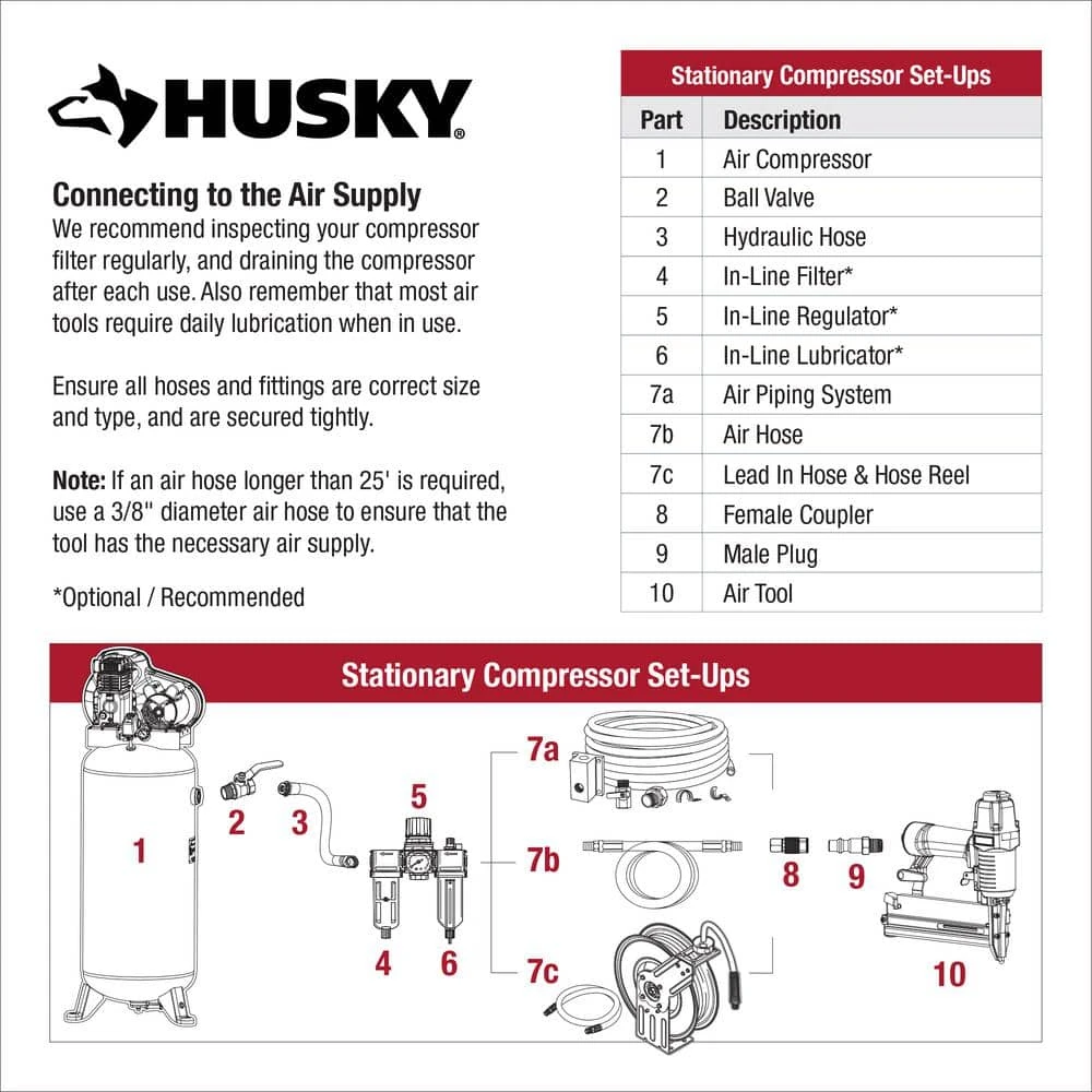 The Husky 60 Gal. oil lubed belt drive air compressor is industry leading with 2-stage performance in a single stage pump. This air compressor provides 92% longer air tool runtime compared to 60 Gal. 2 Stage compressors with 175 maximum psi and 7.9 SCFM at 90 psi. The heavy-duty, cast-iron, 2-cylinder pump is oil lubricated for a long life and delivers 11.5 CFM at 90 psi which provides 45% higher SCFM air delivery versus typical 60 Gal. 2 Stage 175 psi compressor with 175 Maximum PSI and 7.9 SCFM at 90 psi. The poly-v pulley and drive belt provides smooth operation of the air compressor with less vibration. In addition, the high efficiency aluminum flywheel is engineered to provide maximum air flow and allows for an efficient and smooth start-up. The Husky 60 Gal. 175 psi air compressor is perfect for a small shop, automotive enthusiast or serious DIY user. This unit features a 208-Volt to 230-Volt electric motor. It should be connected to a power supply that is 230-Volt, 60 Hz, AC only. Please consult your local codes and a certified electrician before wiring this compressor for power. This compressor does not include a power cord.