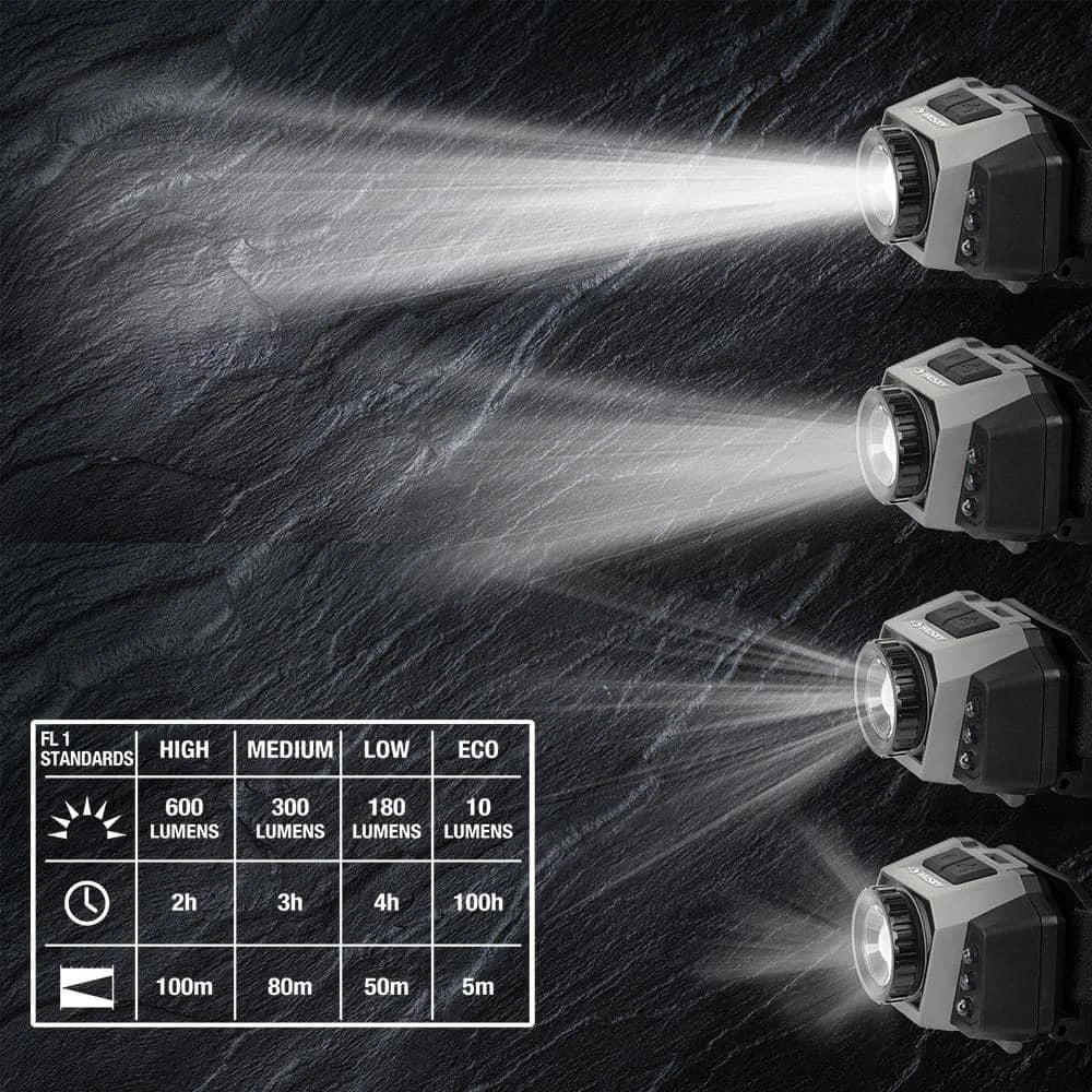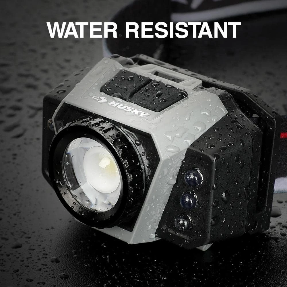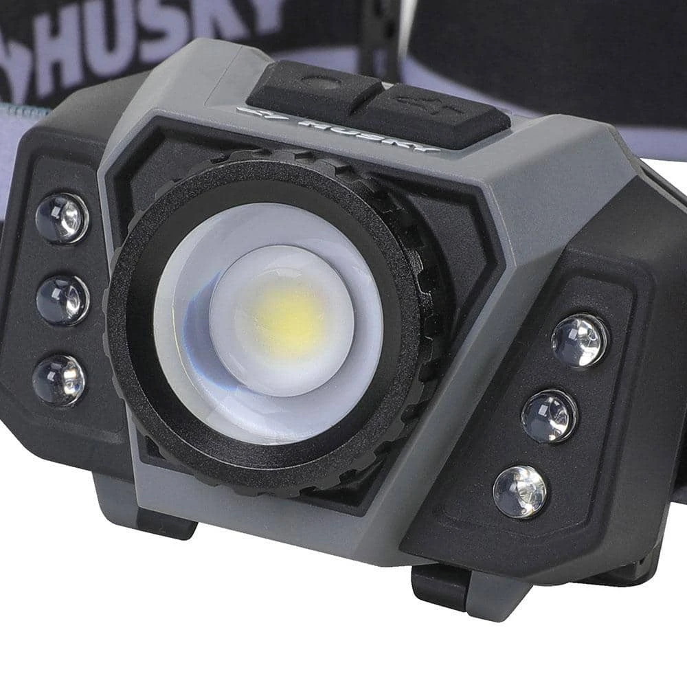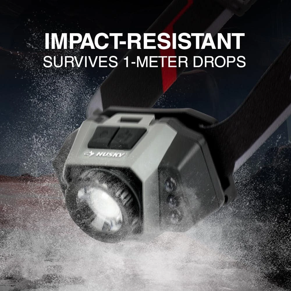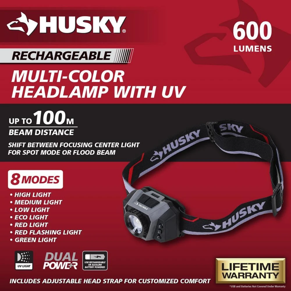 This Husky 600-Lumens Dual Power Focusing Multi-Color Rechargeable headlight with durable construction withstands up to a 3m drop. Multi-setting is great for different applications indoor or outdoors, lighting your way, hands free. This headlight has a total of 8 beam modes. High, medium, low, ECO, red, red strobe, green and UV. High, medium, and low modes provide the right amount of light for your projects, while strobe light helps you stay safe in an emergency. Red and green lights are great for night vision and avoiding eye strain. Features an adjustable elastic head strap and an adjustable headlight to point your beam where you need it. Quickly shift from the focusing center light for spot to a flood light. Powered by either the Rechargeable Li-Ion Rechargeable Battery or (3) AAA Batteries in case of emergency (3AAA Battery not included). Replacement Battery SKU# 1012327538