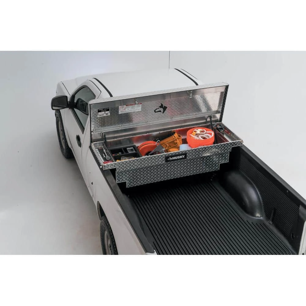 The Husky Aluminum Low Profile Saddle Box for compact trucks provides protection for your tools and equipment from the elements and break-ins. The fully-welded aluminum construction and rubber weather seal protect your items from inclement weather. The easy-to-use, lockable push summarys and fully welded loop strikers help resist break-ins. Included with the box is a sliding plastic tray that allows you to organize and easily access your small tools and hardware. Included as well is the no-drill mounting kit that attaches the truck box to the truck bed easily.