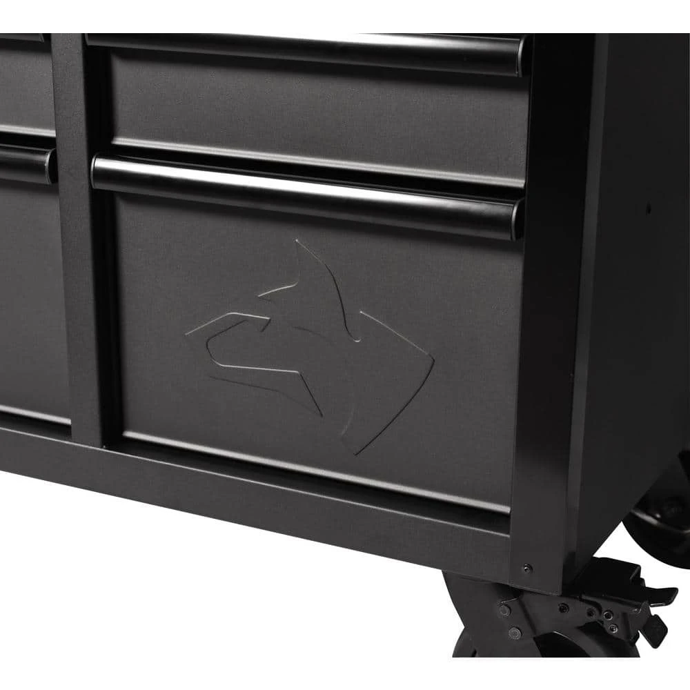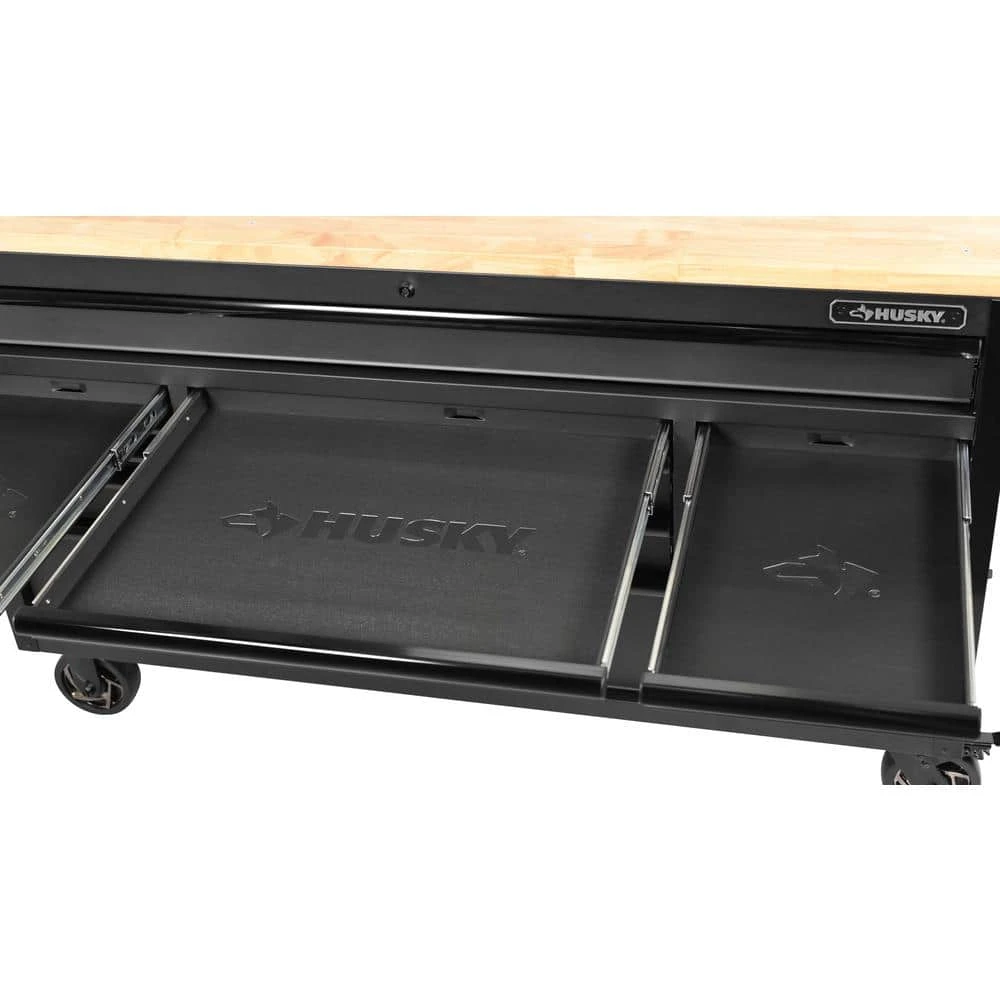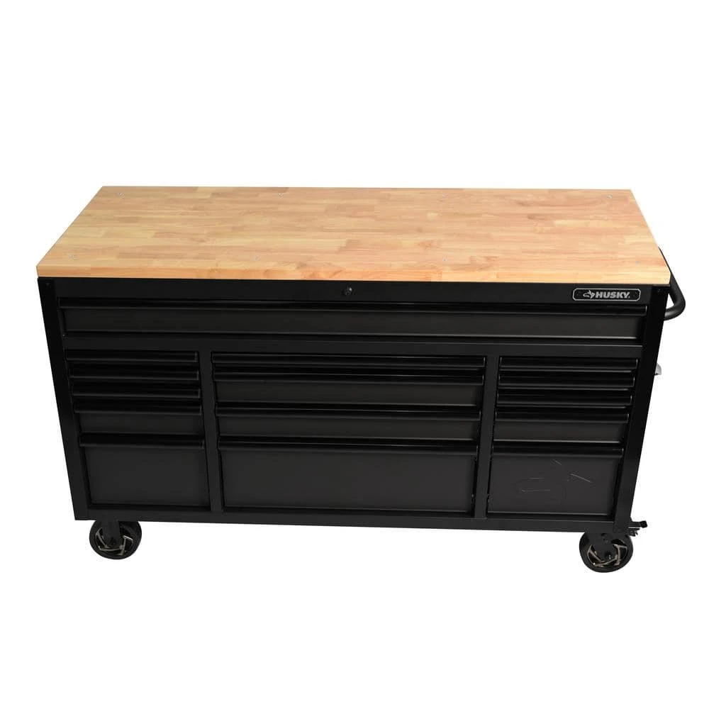 The all new Husky Heavy Duty 61 in. 15-Drawer Mobile Workbench with solid wood top will be a great addition to any garage or workspace. Built to withstand the demands of any workplace setting, this unit is solidly constructed with all-welded 19-Gauge steel. There are also aluminum corner guards fastened in place for further protection against dings and dents. The solid wood top is over 1 in. thick and provides 1,403 sq. in. of workspace. If the need should ever arise, this wood top is sealed on all sides and can also be flipped over. Underneath the work surface are 15-drawers of varying sizes that create 24,187 cu in. of storage space. Each drawer comes equipped with a pre-cut liner, embossed with the Husky logo, to protect and organize all your tools and supplies. All drawers glide effortlessly on 120 lbs. rated ball-bearing slides and feature soft-closing mechanisms to prevent slamming. The full-width drawer and 9 in. D bottom drawers all have a double set of slides to accommodate heavier items. On the right-hand side of the workbench is an integrated power strip with 6 outlets and 2 USB ports that will allow you to charge tools, batteries and other electronic devices. Next to the power strip are cord storage hooks and a bottle opener. Finally, this workbench can be easily moved around the workspace with the large ergonomic handle and heavy-duty 6 in. x 2 in. casters.