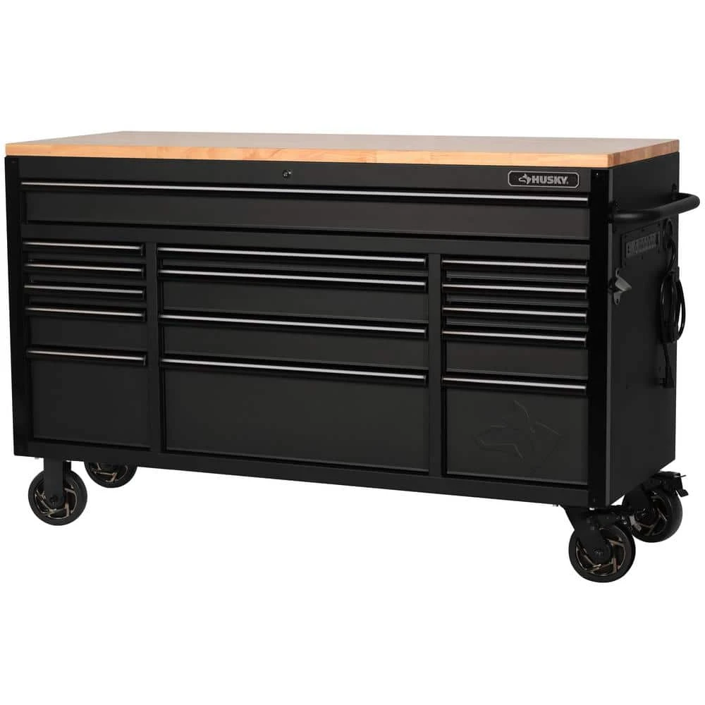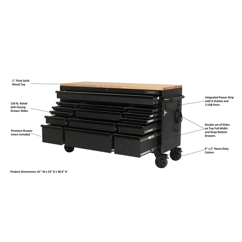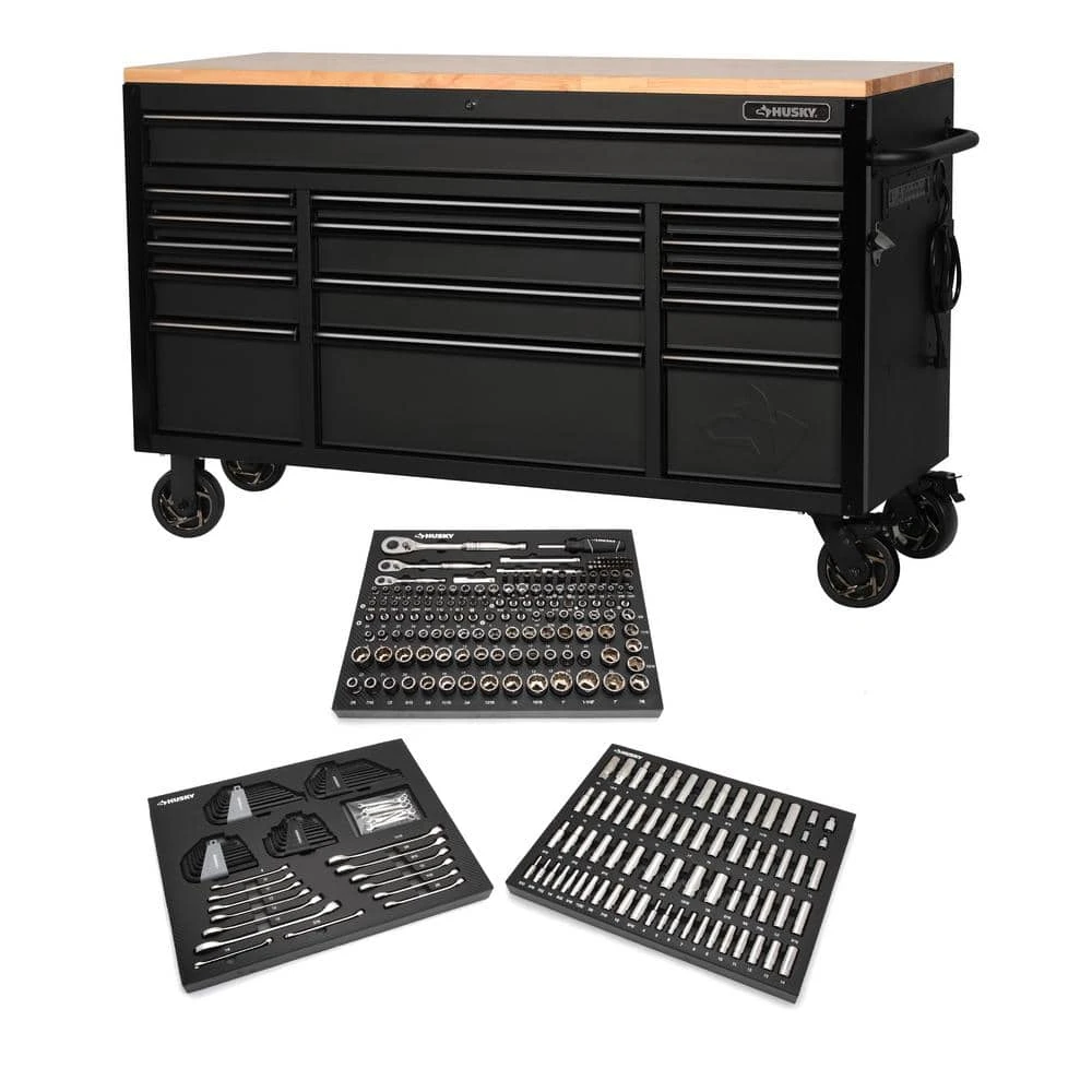 Built for its functional workspace and large storage capacity, the Husky 61 in. W/24 in. D 15-drawer mobile workbench is the perfect combination for your tool storage system. The Husky 290-piece 1/4 in., 3/8 in. and 1/2 in. drive mechanics tool set offers a comprehensive selection of tools for the professional or DIY mechanics workshop. This mobile work center has large, 6 in. x 2 in. casters and a steel tubular side handle, which allow you to easily move it, even when fully loaded. Each drawer is equipped with 120 lbs. rated ball bearing slides. The top long drawer and 2 deep bottom drawers have double sets of 100 lbs. rated soft closing slides to enable you to store your heavier bulk items. It is constructed with heavy 19-gauge steel and is strong enough to support 3800 lbs. with 24,187 cu. in. storage capacity. The 1 in. thick solid wood top is sealed with a protective coating to protect it from the elements. The wide variety of standard and deep sockets along with the assortment of combination wrenches and bit sockets will allow you to tackle any fastening or repair project. This Husky 290-piece tool set will provide the novice or professional with a huge assortment of durable and reliable tools to get the job done. This set comes packed into portable EVA foam storage trays to keep your tools organized inside your toolbox.