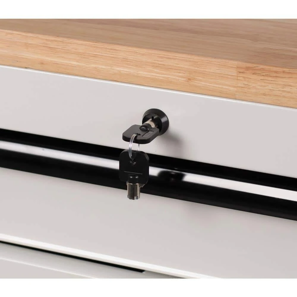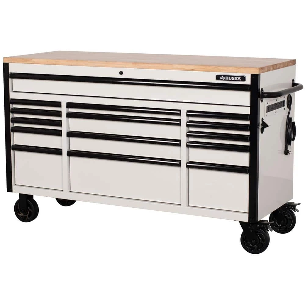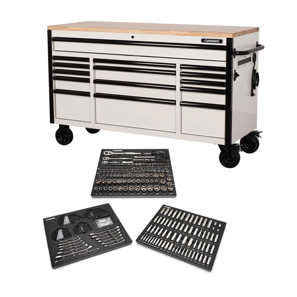 Built for its functional workspace and large storage capacity, the Husky 61 in. W/24 in. D 15-drawer mobile workbench is the perfect combination for your tool storage system. The Husky 290-piece 1/4 in., 3/8 in. and 1/2 in. drive mechanics tool set offers a comprehensive selection of tools for the professional or DIY mechanics workshop. This mobile work center has large, 6 in. x 2 in. casters and a steel tubular side handle, which allow you to easily move it, even when fully loaded. Each drawer is equipped with 120 lbs. rated ball bearing slides. The top long drawer and 2 deep bottom drawers have double sets of 100 lbs. rated soft closing slides to enable you to store your heavier bulk items. It is constructed with heavy 19-gauge steel and is strong enough to support 3800 lbs. and has 24,187 cu. in. storage capacity. The 1 in. thick solid wood top is sealed with a protective coating to protect it from the elements. The wide variety of standard and deep sockets along with the assortment of combination wrenches and bit sockets will allow you to tackle any fastening or repair project. This Husky 290-piece tool set will provide the novice or professional with a huge assortment of durable and reliable tools to get the job done. This set comes packed into portable EVA foam storage trays to keep your tools organized inside your toolbox.