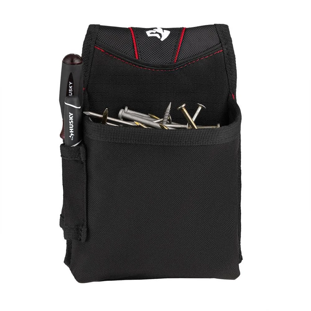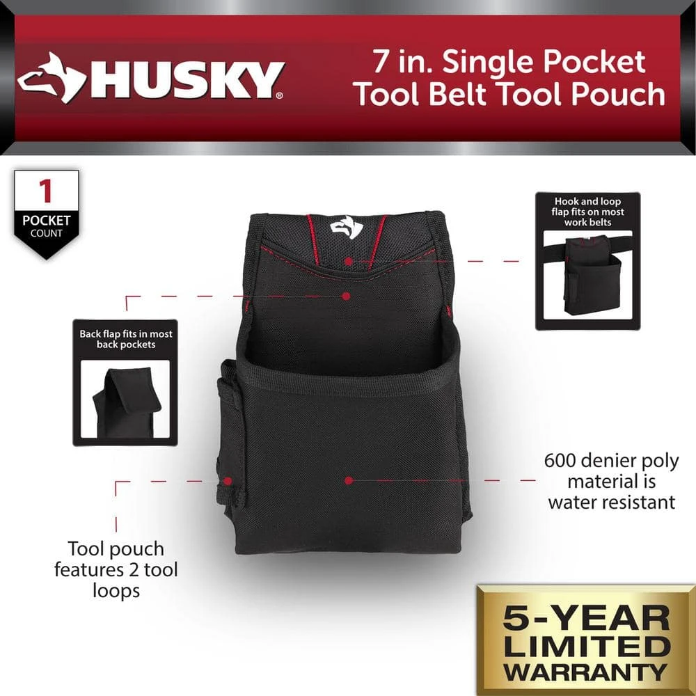 The Husky Single Pocket Pouch is useful for holding small hand tools while working on a project. There are two exterior tool loops to hold screwdrivers or other similar items. The flap on the back of the tool pouch will fit comfortably in most pants pockets. The flap has a hook and loop closure so it can be used on a work belt, such as the Husky 2 in. Standard poly work belt. This tool storage pouch is great for the DIY’er, Weekend Warrior, or handyman.