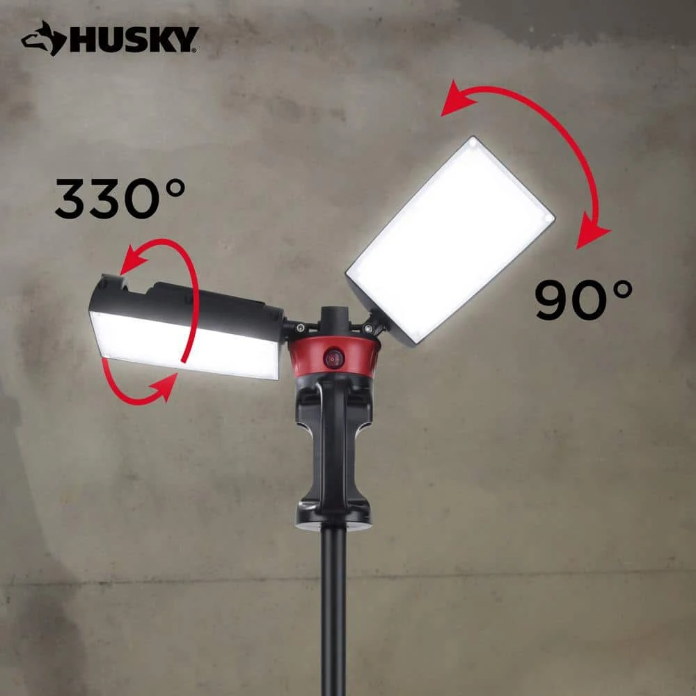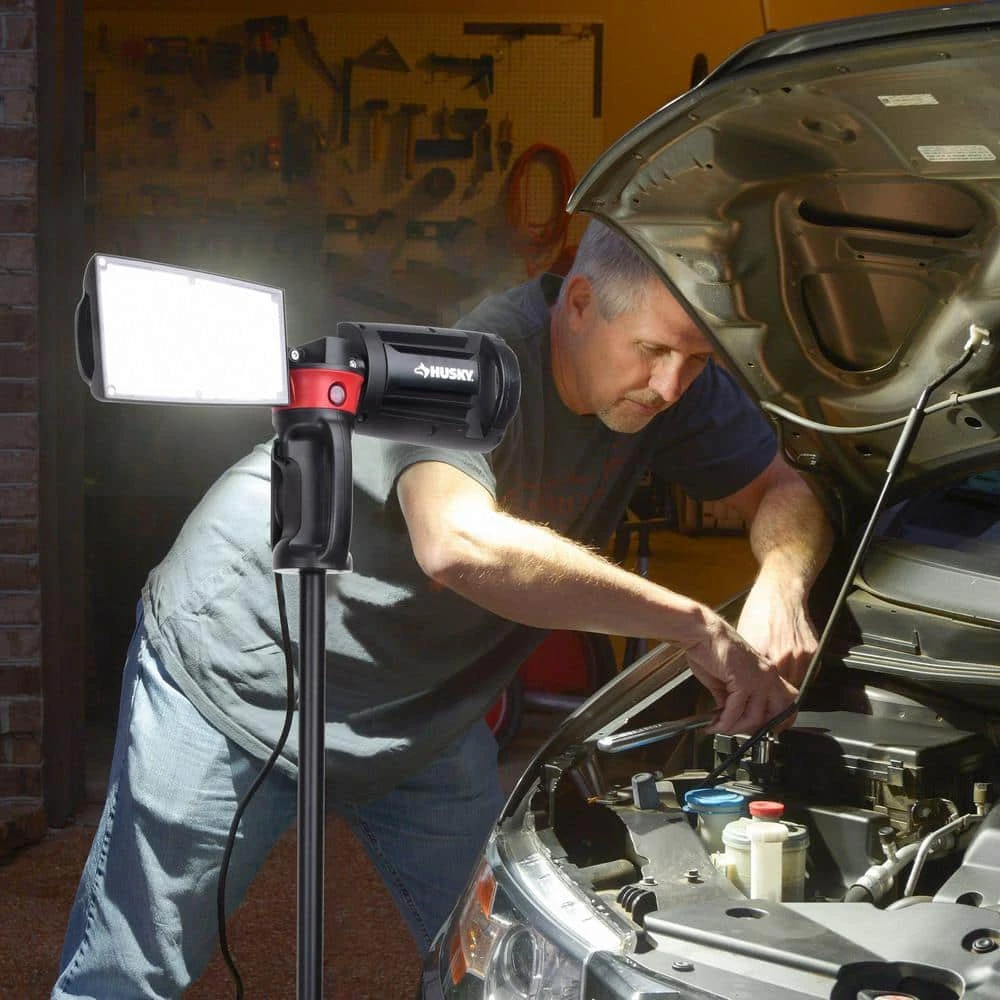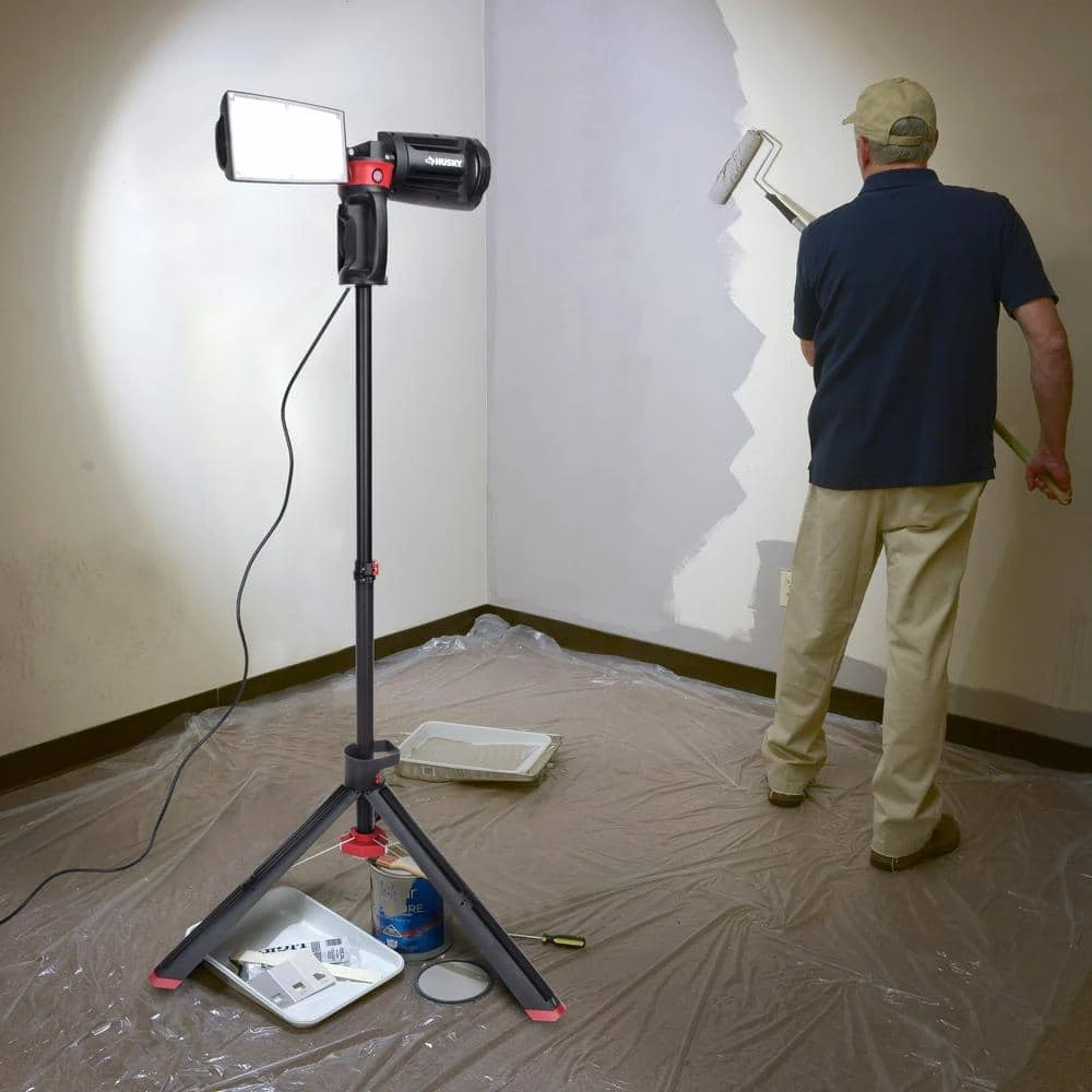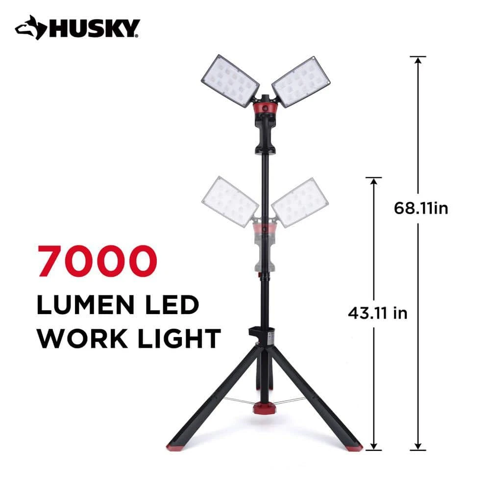 The Husky LED portable corded work light has the high output of 7000 Lumens. It is perfect for any home or job site project. With it’s heavy-duty professional grade die-cast aluminum housing, tripod stand and rotating heads it makes any job easier. When the job is finished, just fold up, wrap the cord up using the built-in cord wrap system and easily fold up.