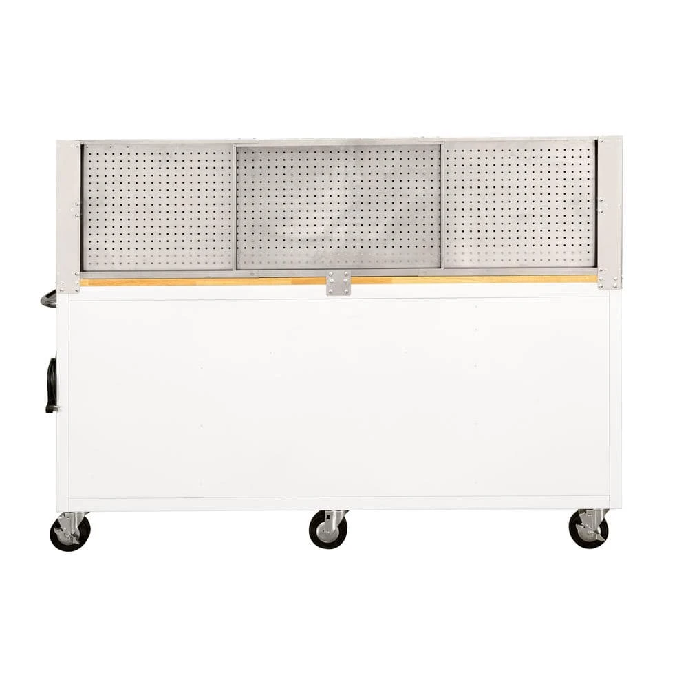 The Husky 72 in. 18-Drawer Mobile Workbench with Stainless Steel Pegboard included is a tool cabinet that combines the perfect blend of drawer storage capacity and functional work surface area for the tool enthusiast. It is constructed with heavier, 21-Gauge steel. This workbench is 24 in. D, which is 6 in. deeper than most standard rolling tool cabinets, providing more usable storage space that is strong enough to support 1,800 lbs. and has 33,545 cu. in. capacity. The 1 in. thick solid wood top is sealed with a protective polyurethane coating to protect it from the elements. The workstation is equipped with a power center with 6 outlets and 2 USB ports. Premium drawer liners are included to help keep tools from moving around. Each drawer is equipped with 100 lbs. rated soft closing ball bearing slides. The top long drawer and 3 bottom drawers are equipped, with double 100 lbs. drawer slides for increased weight capacity up to 200 lbs. which enables you to store heavier bulk items. This mobile work center has 6 large, 5 in. x 2 in. all swivel casters and a steel tubular side handle, which allow you to easily move around, even when fully loaded. The Mobile Work Center also has an internal keyed locking system, with 2 keys provided, for added security. The SS Pegboard has peg holes spaced 1 in. on center and accommodates most standard size 1/4 in. and 1/8 in. peg hooks and has 150 lbs. weight capacity.