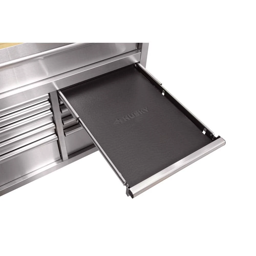 Fill your tool chest to the brim and get the job done, the comprehensive Husky Master Mechanics Tool Set contains 1, 025-pieces. The set has all the tools you need – 500 standard deep, bit, and impact sockets covering a wide range of drive-inch sizes. It also includes 200 different wrenches- standard combination, stubby, ratcheting, stubby ratcheting, flex head ratcheting, reversible ratcheting, and specialty. Also included is the Husky 72 in. 18-Drawer Mobile Workbench with Adjustable-Height Top. The workbench allows you to adjust the height of the solid surface. A removable crank handle raises and lowers the top between 38 in. to 48 in. to allow a better ergonomic standing position. Made with heavy-duty 21-Gauge steel, this workbench is 24 in. D, providing more usable storage space, can support up to 1, 800 lbs. and has 33, 545 cu. in. capacity. The 1.2 in. thick, solid wood top is coated with polyurethane for utility and durability. Charge your power tools with the built-in, 6-outlet, 2 USB power center. The 100 lbs. rated, soft-close drawer slides keep the drawers from accidentally opening or from slamming shut. Premium drawer liners are also included. The top and bottom drawers are equipped with double 120 lbs. soft closing drawer slides for increased weight capacity up to 240 lbs. for added security, this unit is fitted with a barrel key and lock system.