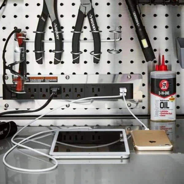 - Dual integrated power strip with 6-outlets and 2 USB ports to power tools and other electronic devices