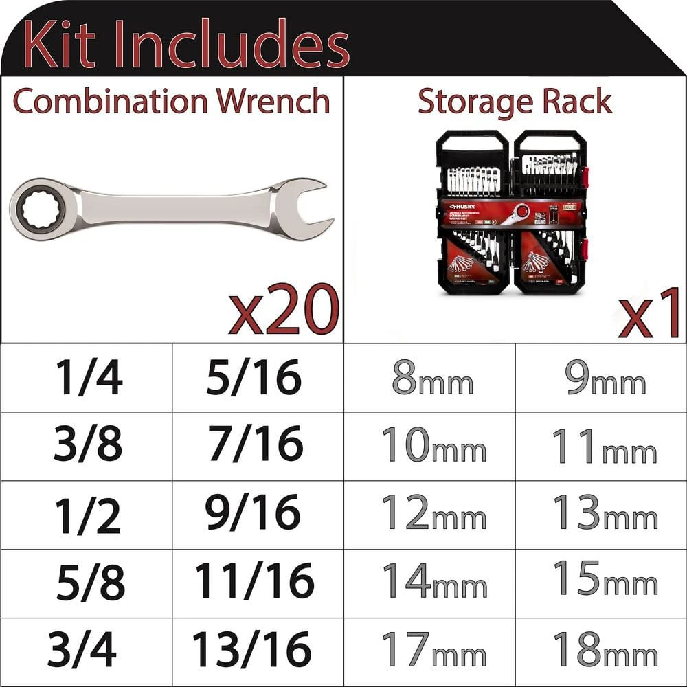 - 20-piece set includes SAE sizes 1/4