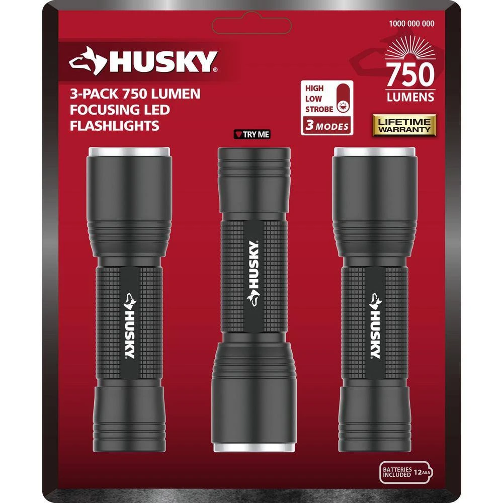 The Husky 750 Lumens Water and Impact Resistant Aluminum Focusing Flashlight is sold complete with 12 AAA batteries, ready for instant use. Its slide focus quickly allows you to zoom from a spot to a wide flood light beam in a matter of seconds. Rugged durability with a comfortable hand grip makes this a flashlight ready for all your lighting needs. Great for household or outdoor use.