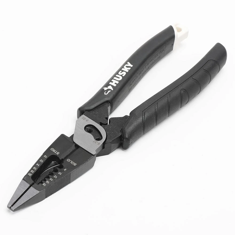 The 8 in. 6-In-1 Multi-function Pliers are ideal for working in tight spaces. They feature a long nose design for good performance as long nose, but also as a Spanner socket opening for gripping nuts and bolds. Non-slip gripping power and heat-treated side-cutting knives for strength. Stripping function strips 8-AWG to 18-AWG solid and 10-AWG to 2- AWG stranded copper wire. Perfect for the home, workshop or jobsite.