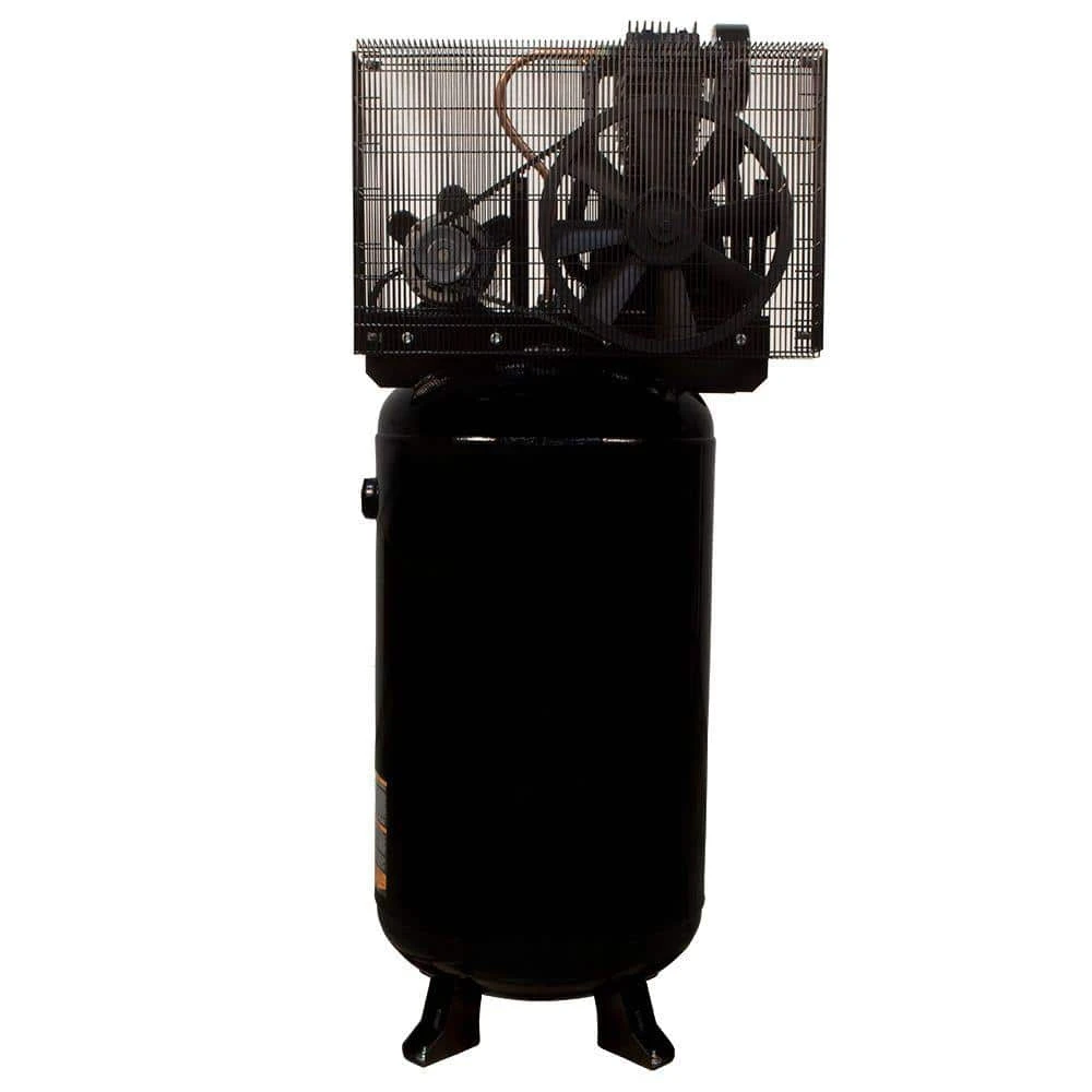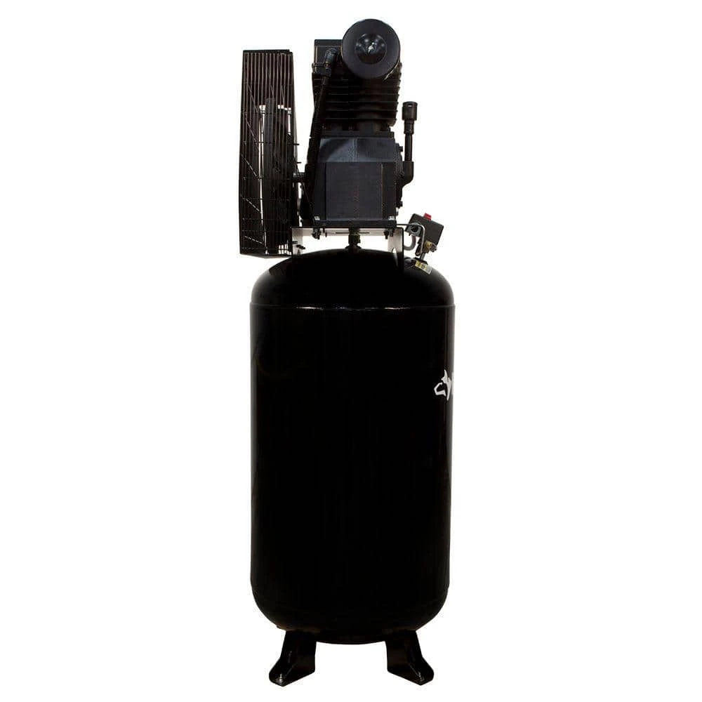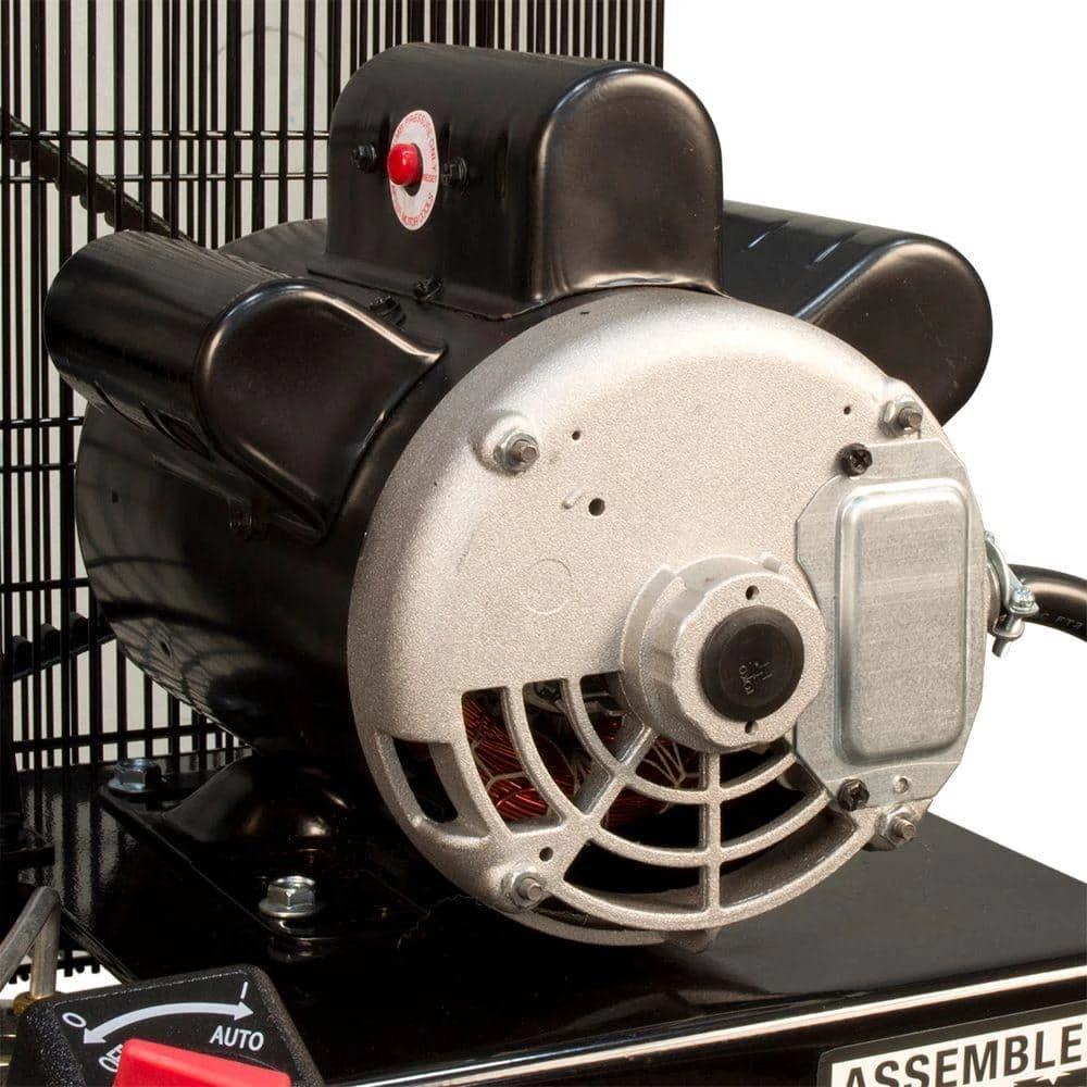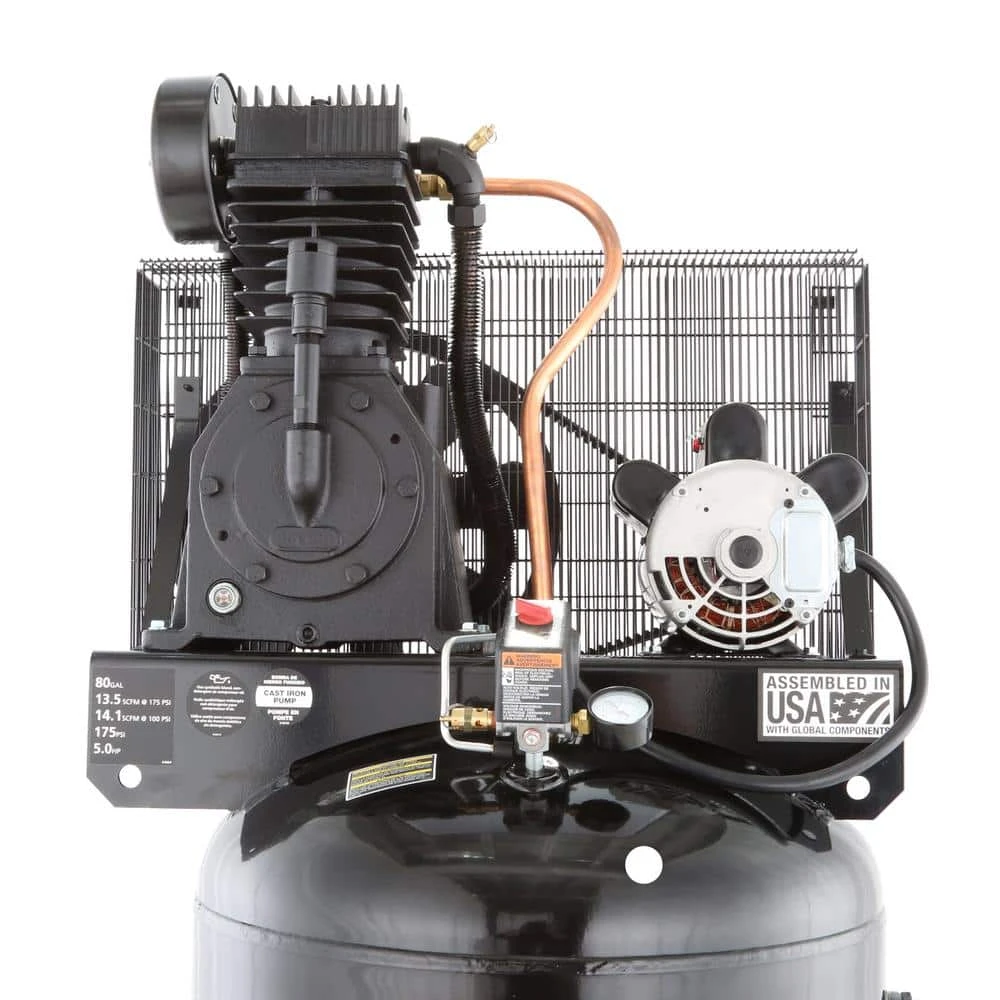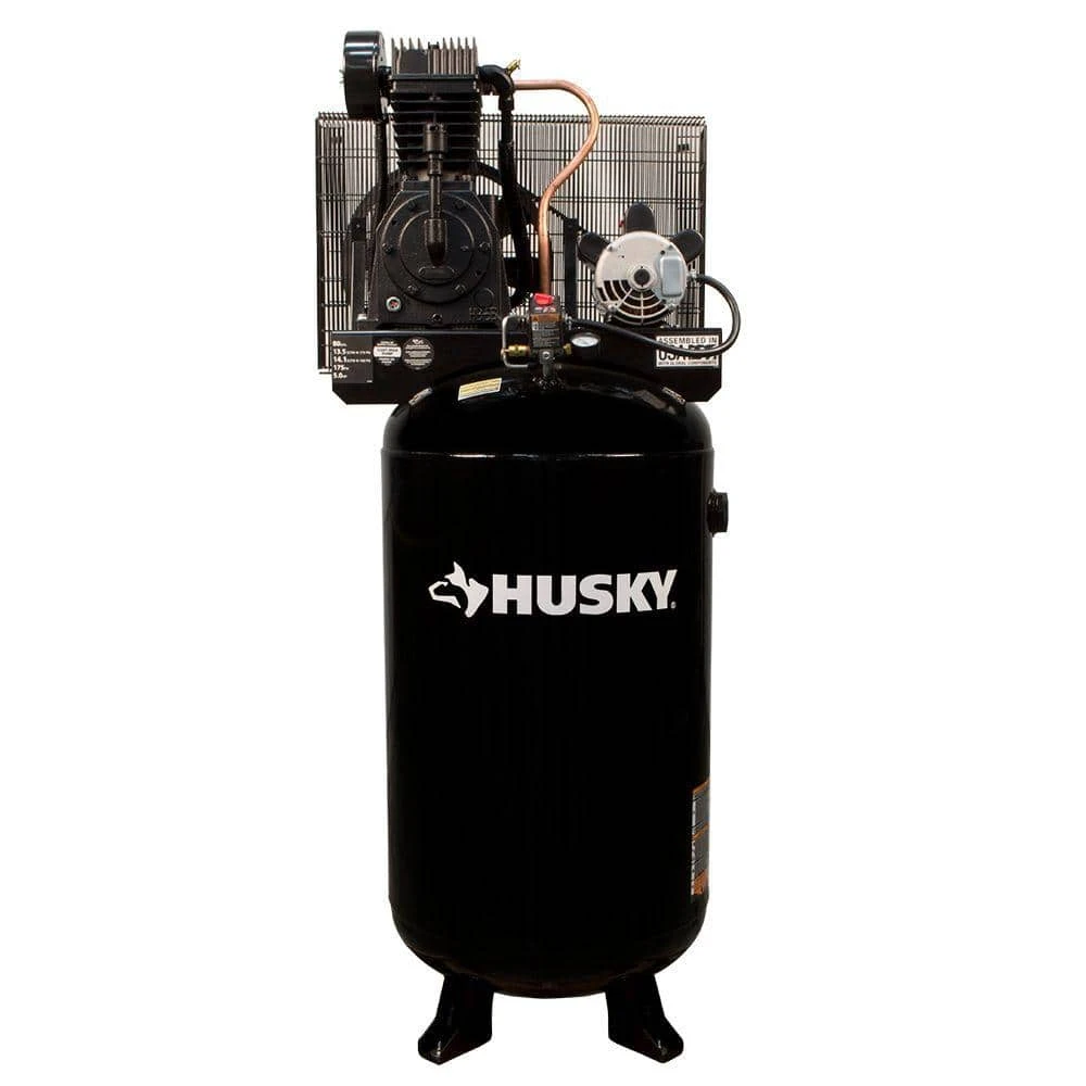 Husky 80 Gal. 2 stage air compressor uses a powerful 5 horse power, 230 volt 22 amp, induction motor to deliver a steady 13.5 SCFM at 175 lbs. per sq. in. of pressure. With a capacity for serious work, this machine has the endurance to keep pneumatic tools big and small running. This machine is ready for any job. Install this powerhouse into your work area, wire it up and get to work. This air compressor motor, designed with thermal overload protection, requires no magnetic starter. Please consult your local codes and a certified electrician before wiring this compressor for power. (This unit requires a 30 amp double pole breaker for proper installation)