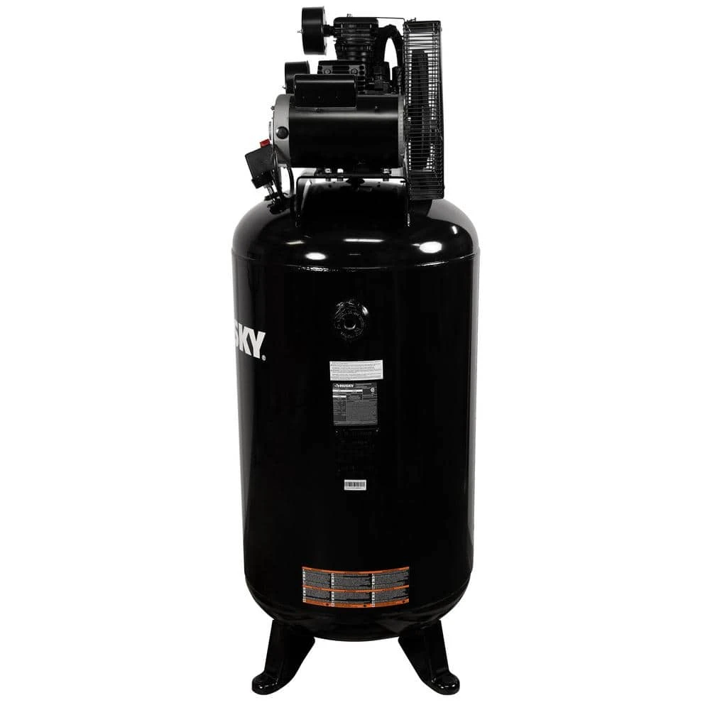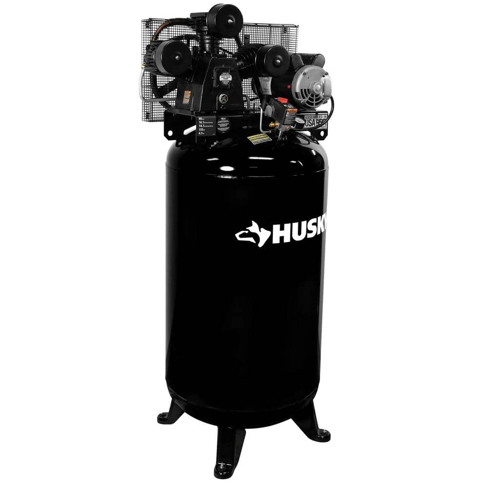 Husky 80 Gal. single stage air compressor provides high air flow with has 14 SCFM at 90 PSI and 155 PSI max working pressure giving the user optimum tool performance. The compressor features an oil-lubricated pump with three cast iron cylinders, a 1-piece cast iron crankcase, and 12 in cast iron flywheel. The pump also features durable Swedish stainless-steel valves, oil level sight glass, large metal air intake filter/silencers with replaceable filter elements, and superior graphite gaskets for the most reliable, long lasting seals.