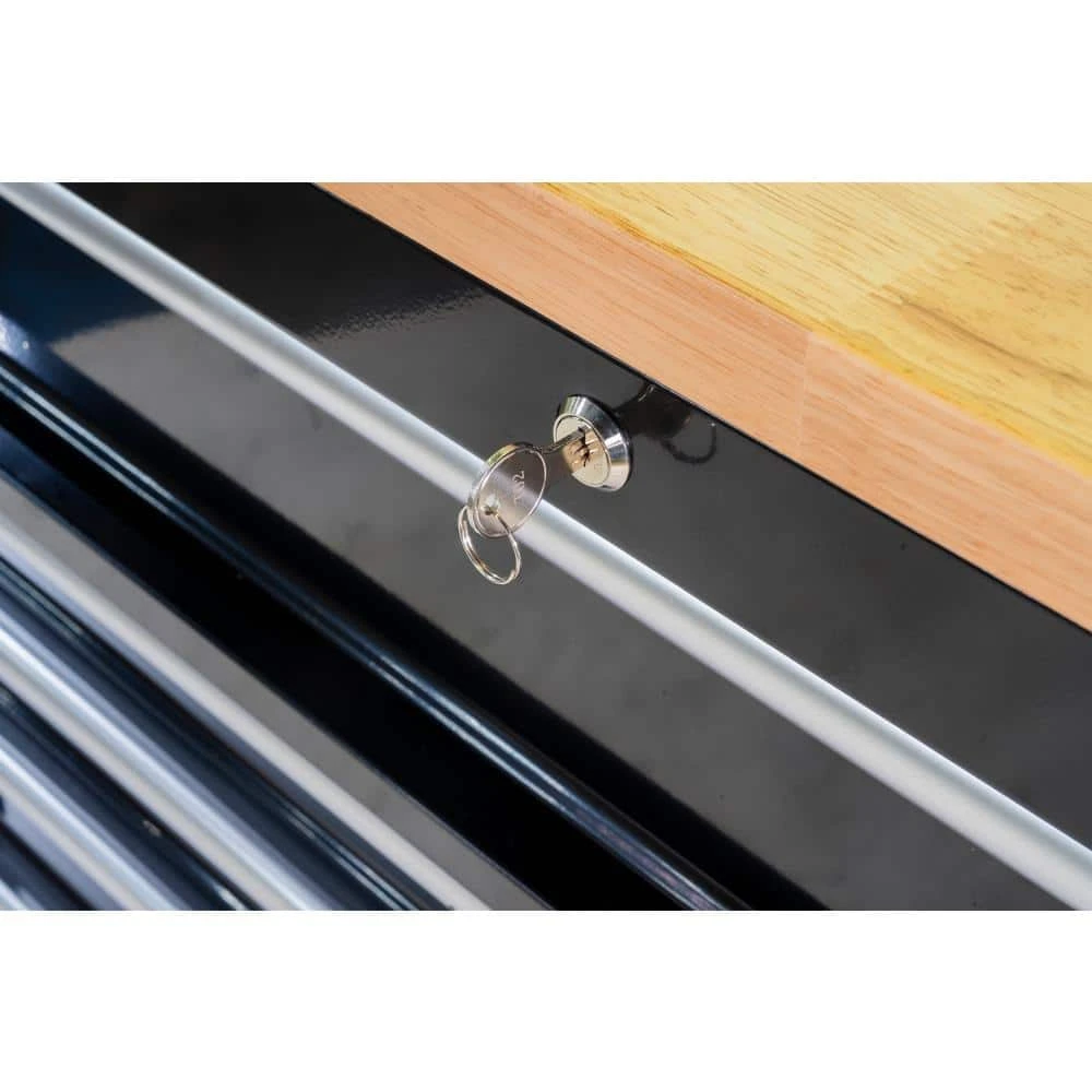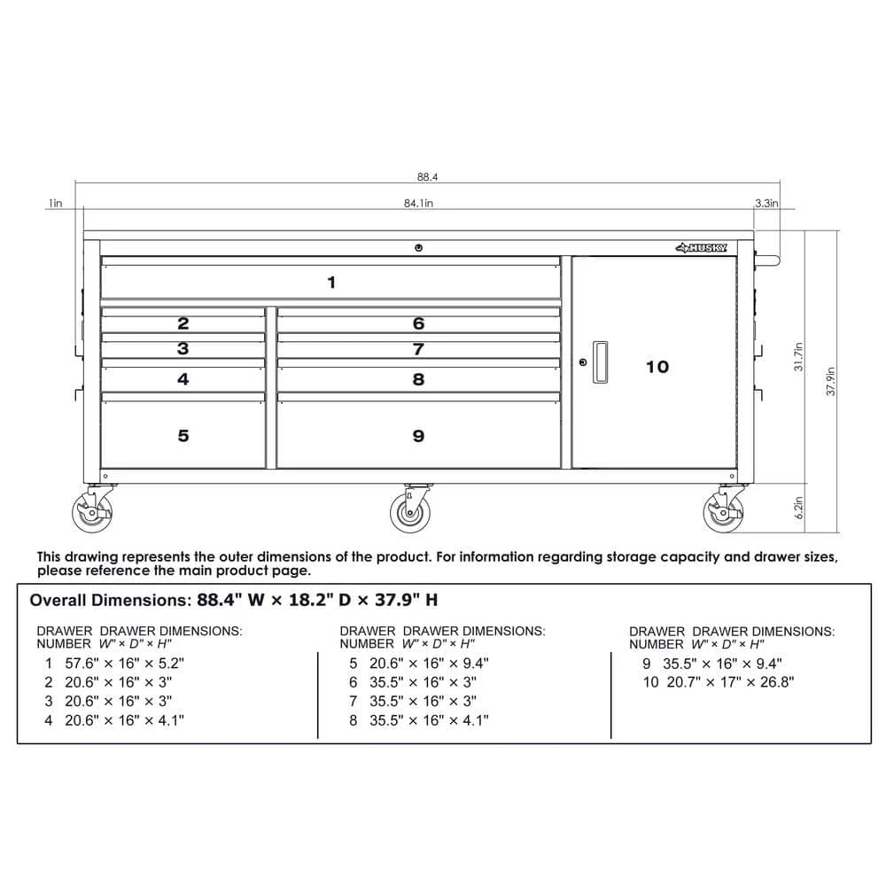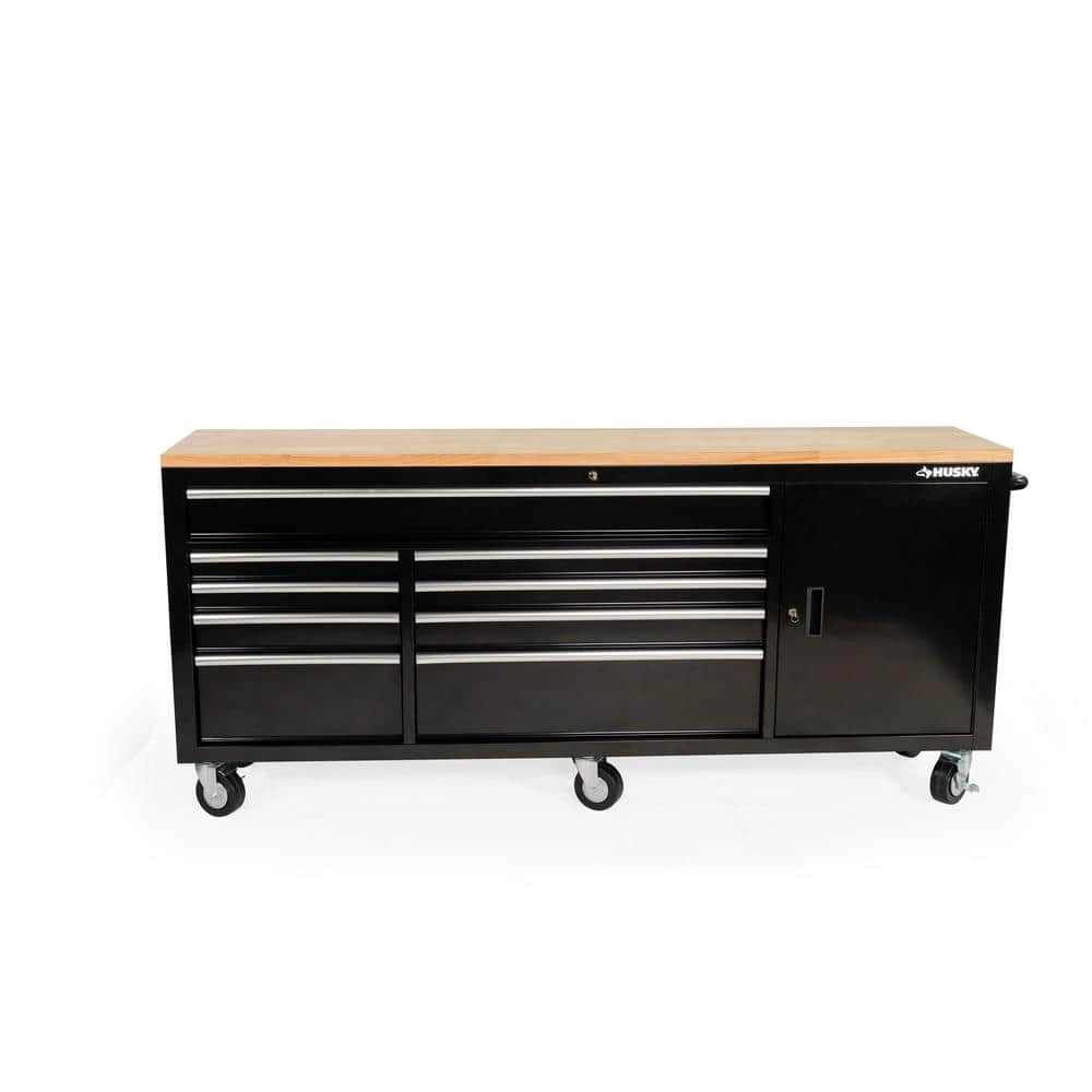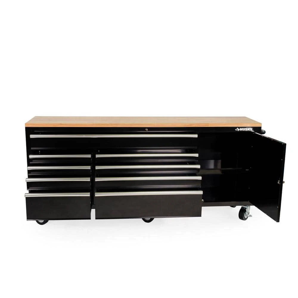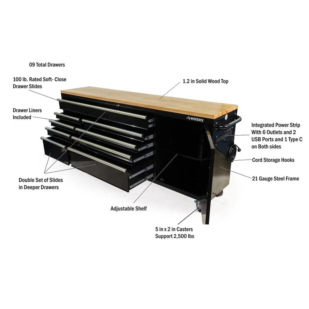 The Husky 84 in. 9-Drawer Mobile Workbench with solid wood work top is a tool cabinet that combines the perfect blend of drawer storage capacity and functional work surface area for the tool enthusiast. This rolling tool cabinet has 21-Gauge steel. This workbench is 18 in. D and strong enough to support 2,500 lbs. and has 29,932 cu. in. capacity. Charge your power tools with the 2 built-in, 6-outlet, 2 USB and 1 USB-C power centers at both ends of this workbench. The 100 lbs. rated, soft-close drawer slides keep the drawers from accidentally opening or from slamming shut. This unit has a locker with one adjustable shelf to larger items. Drawer liners are included to protect and keep your tools in place. This mobile work center has 6 large, 5 in. x 2 in. all swivel casters and a steel tubular side handle, which allow you to easily move around, even when fully loaded. This unit comes with pre-installed casters.