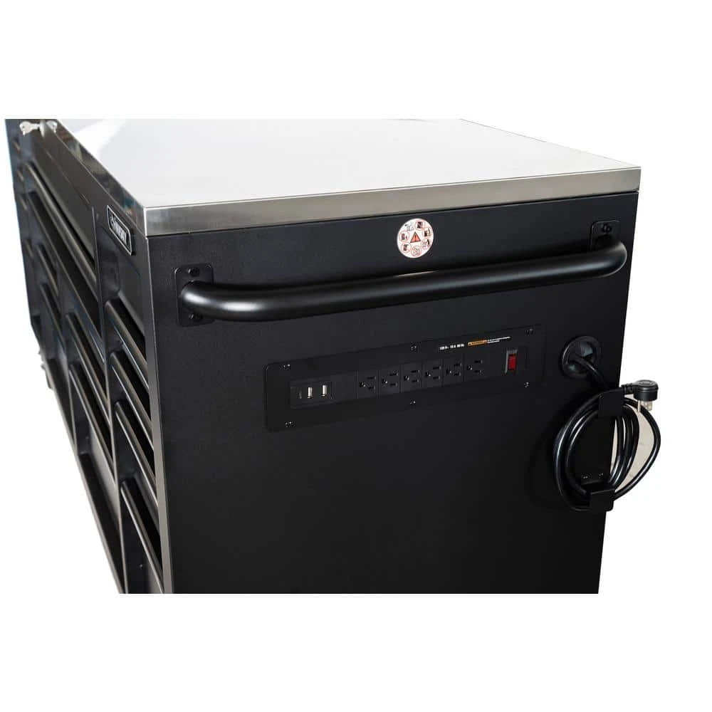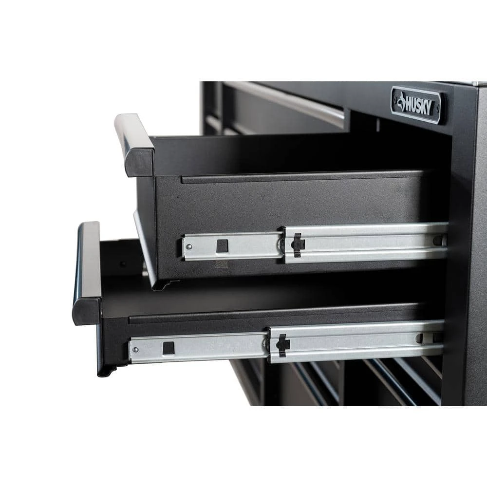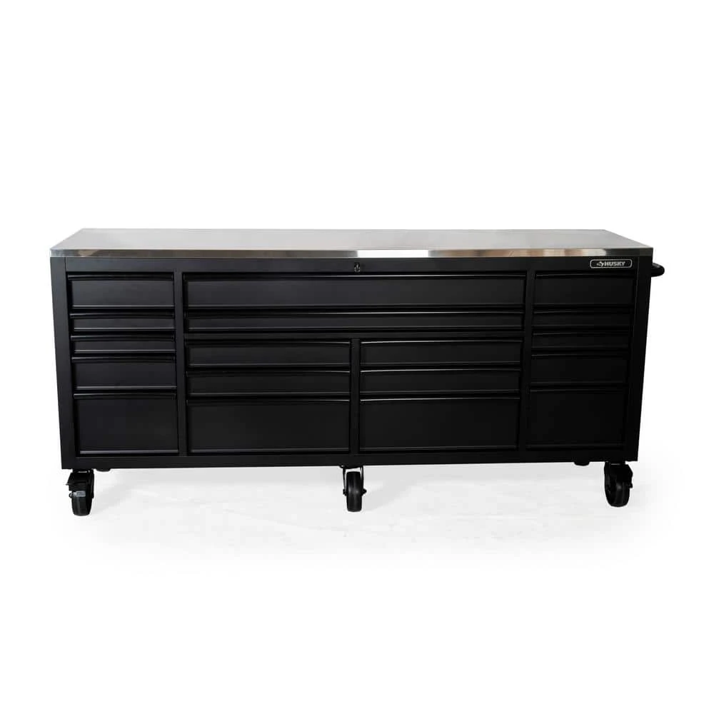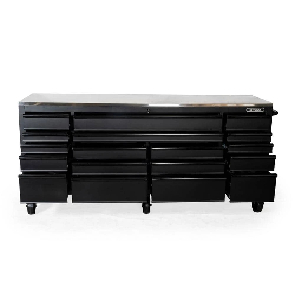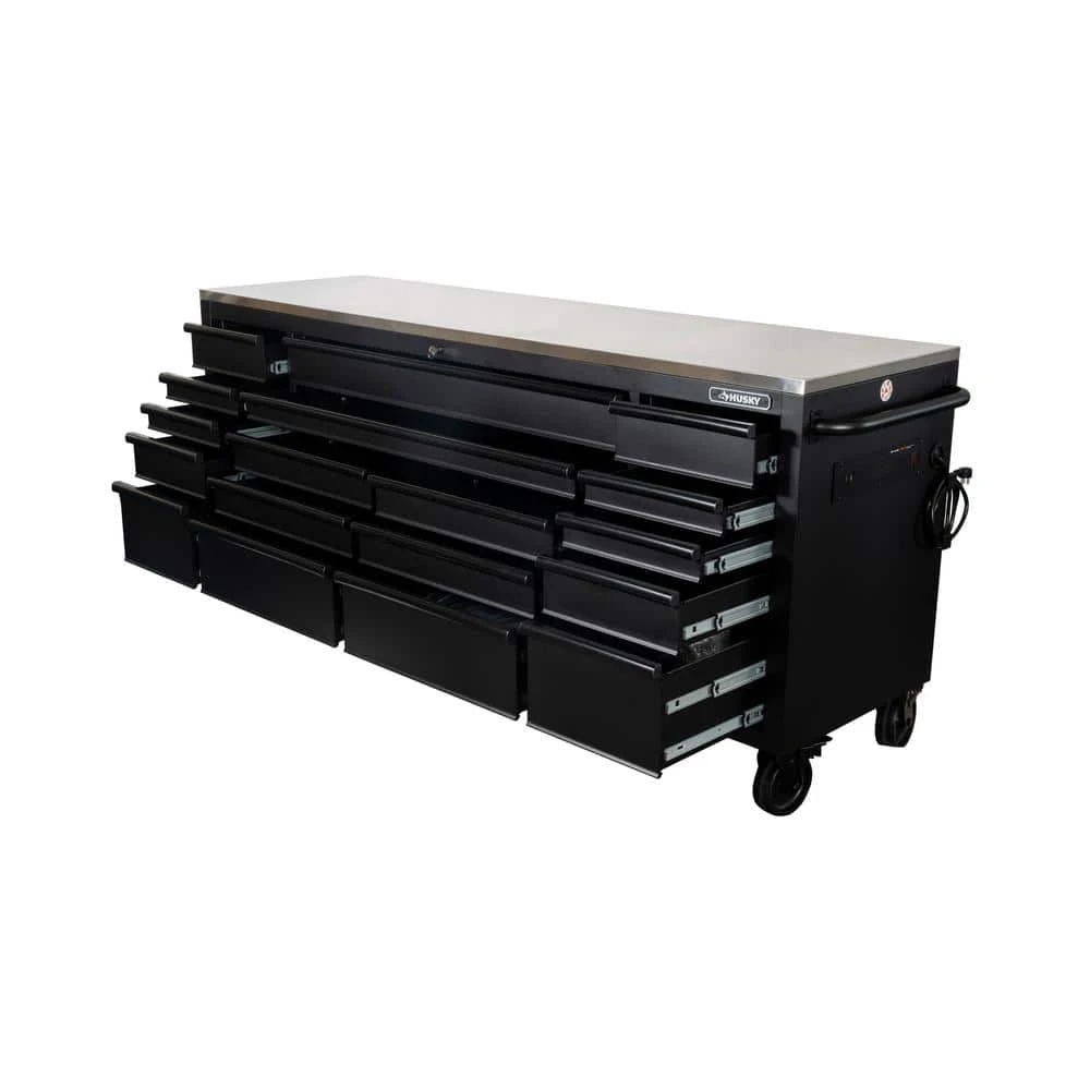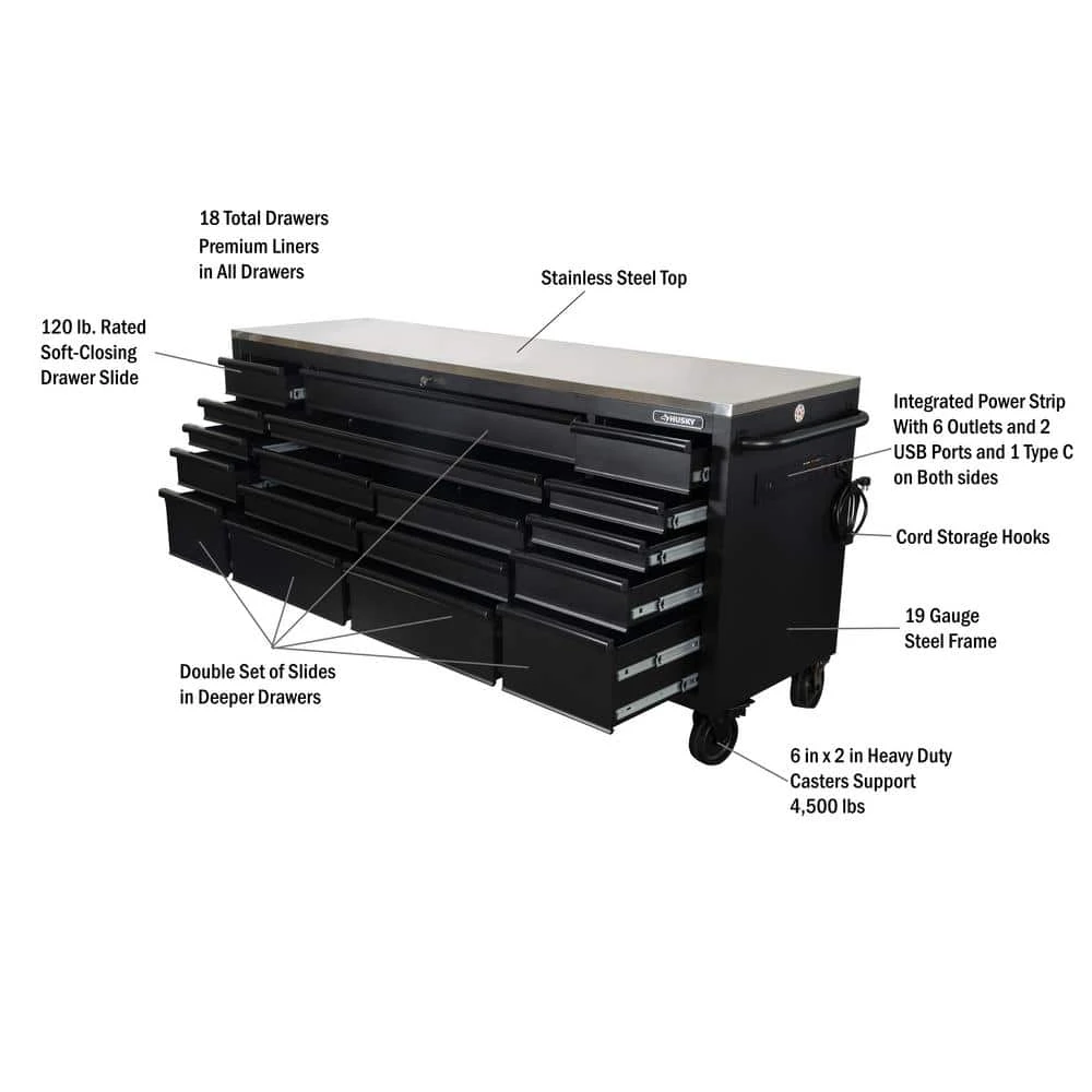 The Husky Heavy-Duty 84 in. 18-Drawer Mobile Workbench with Stainless Steel Work Top is a tool cabinet that combines the perfect blend of drawer storage capacity and functional work surface area for the tool enthusiast. This rolling tool cabinet has heavier 19-Gauge steel. This workbench is 24 in. D, which is 6 in. deeper than most standard rolling tool cabinets, providing more usable storage space that is strong enough to support 4,500 lbs. and has 37,522 cu. in. capacity. Charge your power tools with the 2 built-in, 6-outlet, 2 USB plus 1 USB-C power centers. The 120 lbs. rated, soft-close drawer slides keep the drawers from accidentally opening or from slamming shut. Drawer liners are included to protect and keep your tools in place. This mobile work center has 6 large, 6 in. x 2 in. all swivel casters and a steel tubular side handle, which allow you to easily move around, even when fully loaded. This unit comes with pre-installed casters.
