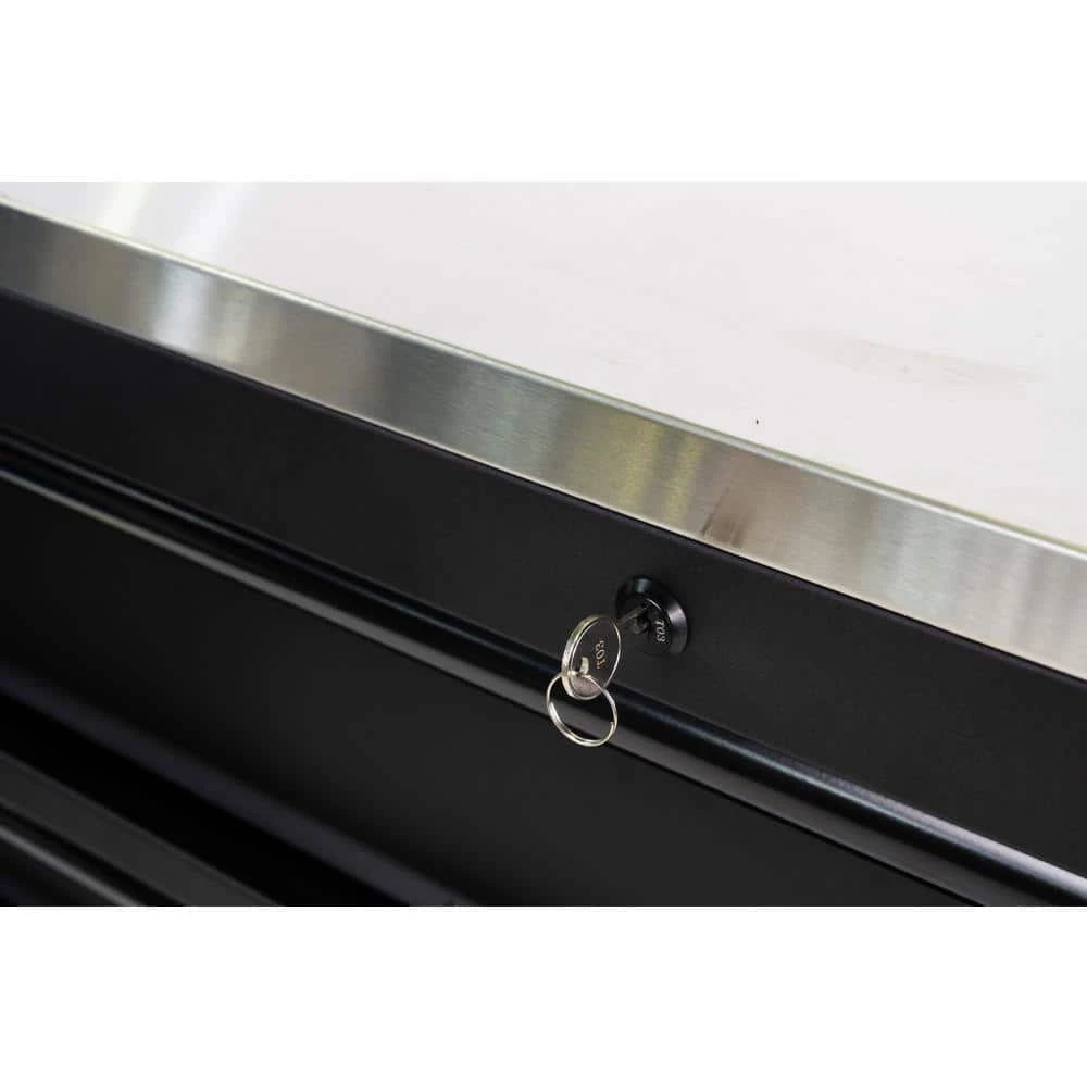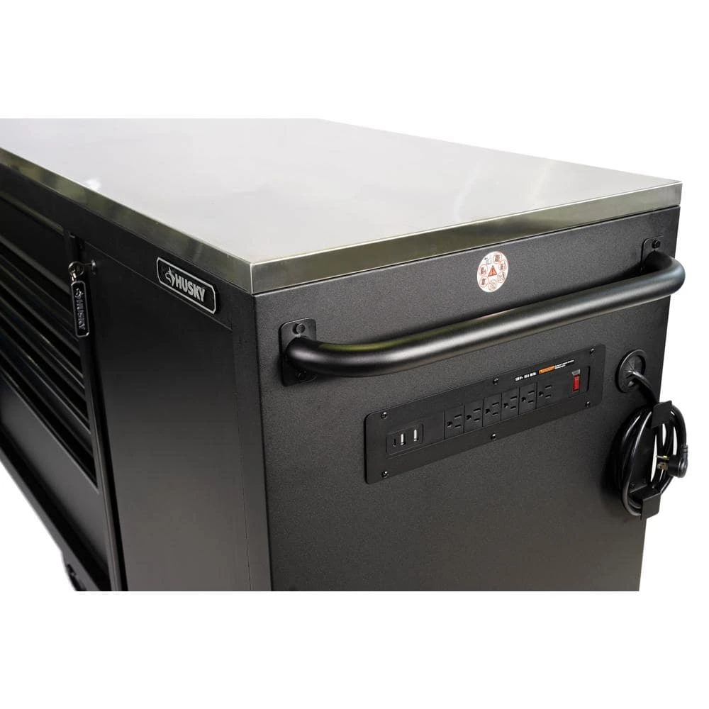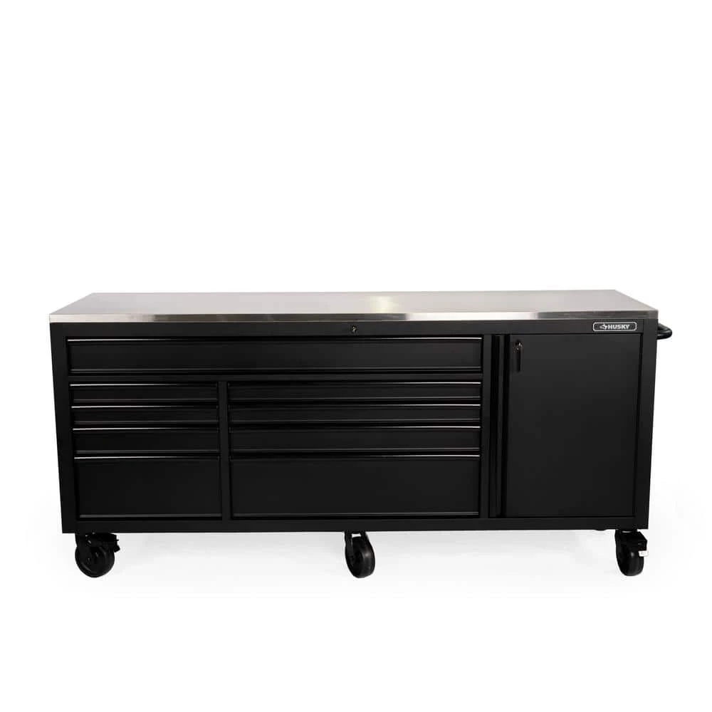 The Husky Heavy-Duty 84 in. 9-Drawer and locker Mobile Workbench with Stainless Steel Work Top is a tool cabinet that combines the perfect blend of drawer storage capacity and functional work surface area for the tool enthusiast. This rolling tool cabinet has heavier 19-Gauge steel. This workbench is 24 in. D, which is 6 in. deeper than most standard rolling tool cabinets, providing more usable storage space that is strong enough to support 4,500 lbs. and has 40,693 cu. in. capacity. Charge your power tools with the 2 built-in, 6-outlet, 2 USB and 1 USB-C power centers one both ends. This unit has a locker that has 1 adjustable shelf for larger items. The 120 lbs. rated, soft-close drawer slides keep the drawers from accidentally opening or from slamming shut. Drawer liners are included to protect and keep your tools in place. This mobile work center has 6 large, 6 in. x 2 in. heavy-duty casters and a steel tubular side handle, which allow you to easily move around, even when fully loaded. This unit comes with pre-installed casters.