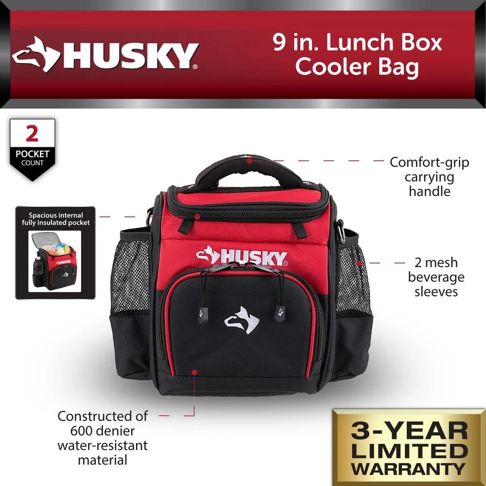 The Husky 9 in. Lunch Cooler box bag is easy to clean and features leak-proof lining with high density thermal insulation. This jobsit meal Cooler box bag will keep your items both hot and cold with the fully insulated internal compartment and external pocket. This Husky cooler box bag features an additional external utensil pocket on the back. Great for carry on luggage, outdoor festivals, races, concerts, camping and keeping your items fresh on the go. Pairs well with our Husky Tool Bags for on-the-job meals. This product carries a 3-year limited warranty.