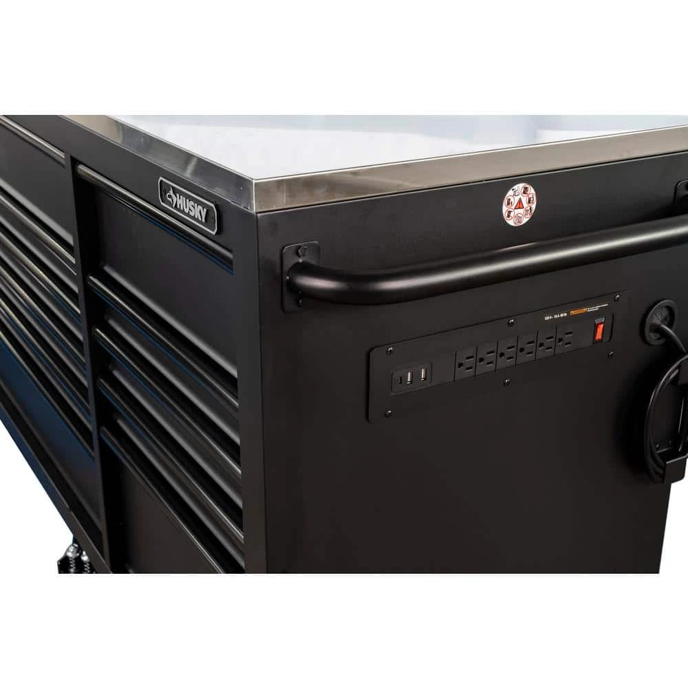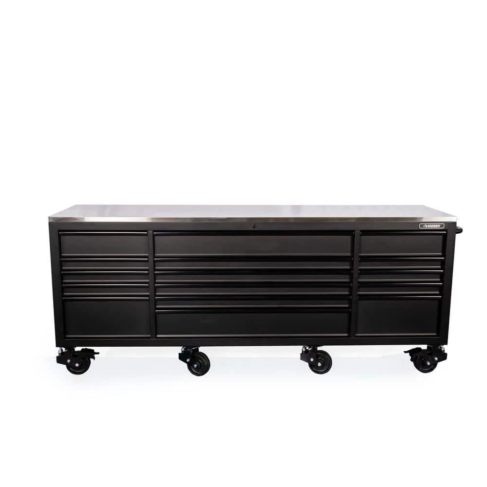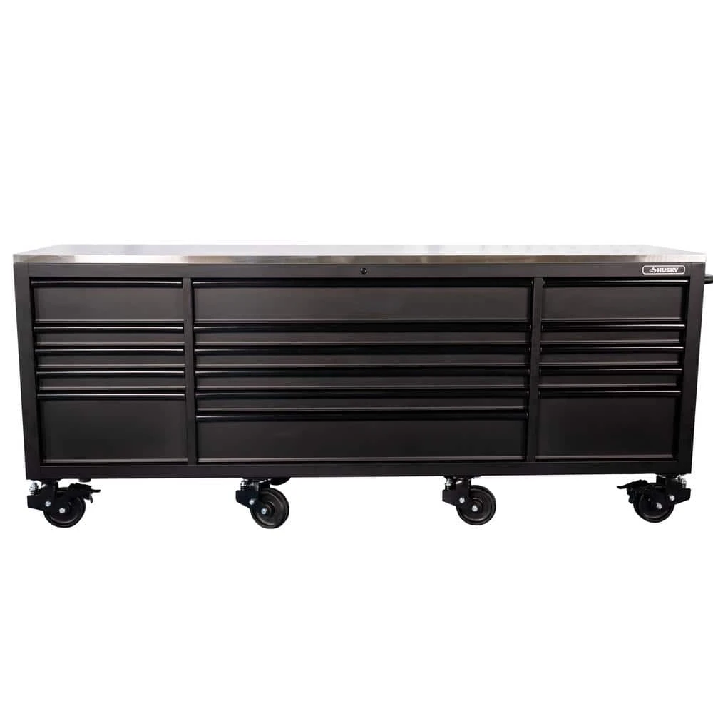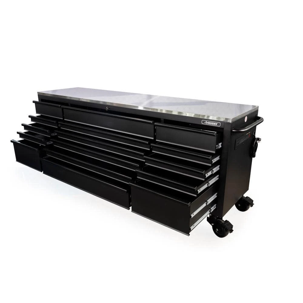 The Husky Heavy-Duty 96 in. 16-Drawer Mobile Workbench with Stainless Steel Work Top is a tool cabinet that combines the perfect blend of drawer storage capacity and functional work surface area for the tool enthusiast. This rolling tool cabinet has heavier 19-Gauge steel. This workbench is 24 in. D, which is 6 in. deeper than most standard rolling tool cabinets, providing more usable storage space that is strong enough to support 4,500 lbs. and has 45,598 cu. in. capacity. Charge your power tools with the 2 built-in, 6-outlet, 2 USB and 1 USB-C power centers. The 120 lbs. rated, soft-close drawer slides keep the drawers from accidentally opening or from slamming shut. Drawer liners are included to protect and keep your tools in place. This mobile work center has 8 large, 6 in. x 2 in. heavy-duty spring casters and a steel tubular side handle, which allow you to easily move around, even when fully loaded. This unit comes with pre-installed casters.