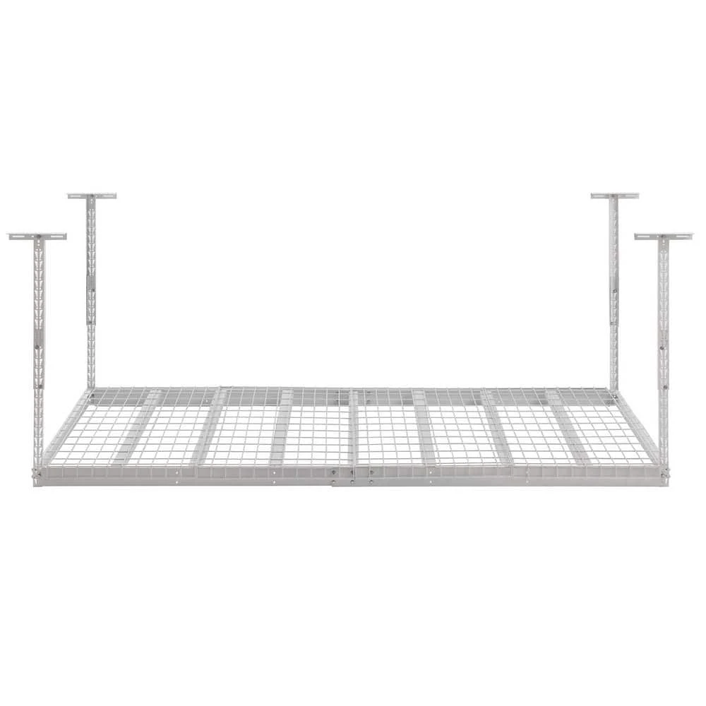Organize your space with this Adjustable Height Overhead Ceiling Mount Garage Rack in White (97.5 in. W x 43.75 in. H x 48 in. D). It helps keep items from cluttering your garage floor. It features an industrial steel design and can hold up to 600 lbs. Prepare for an easy installation process.