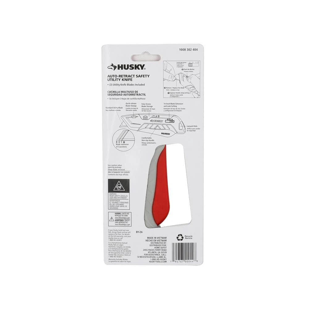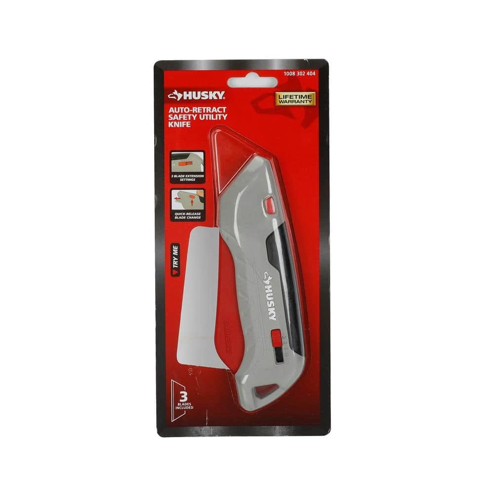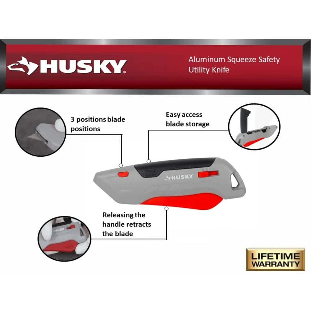Husky Aluminum Squeeze Safety Knife is very safe for workers, teachers, students and other professionals. Its safety lock design can make it fast and highly secure safety for cutting. It is also designed with comfortable and non-slip handle and rope hole for hanging. And there is 3-gear for adjusting the blade reaching out.