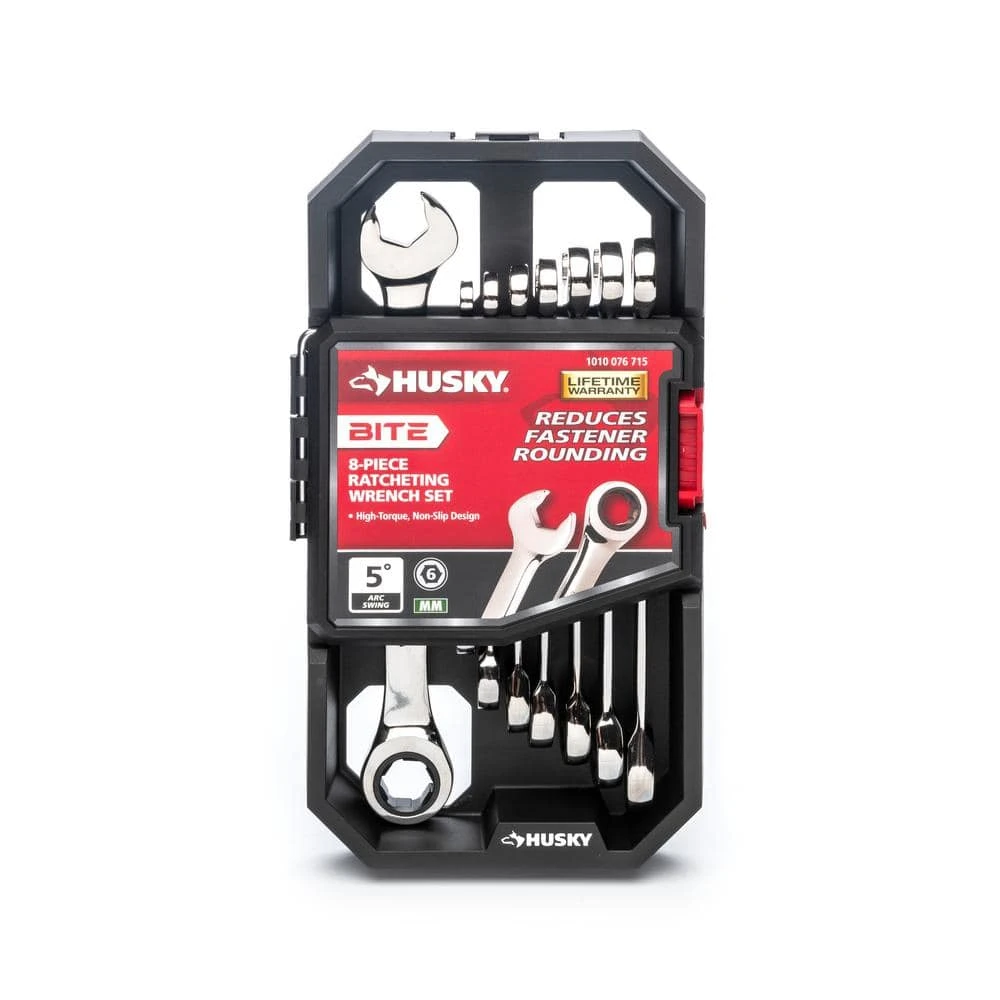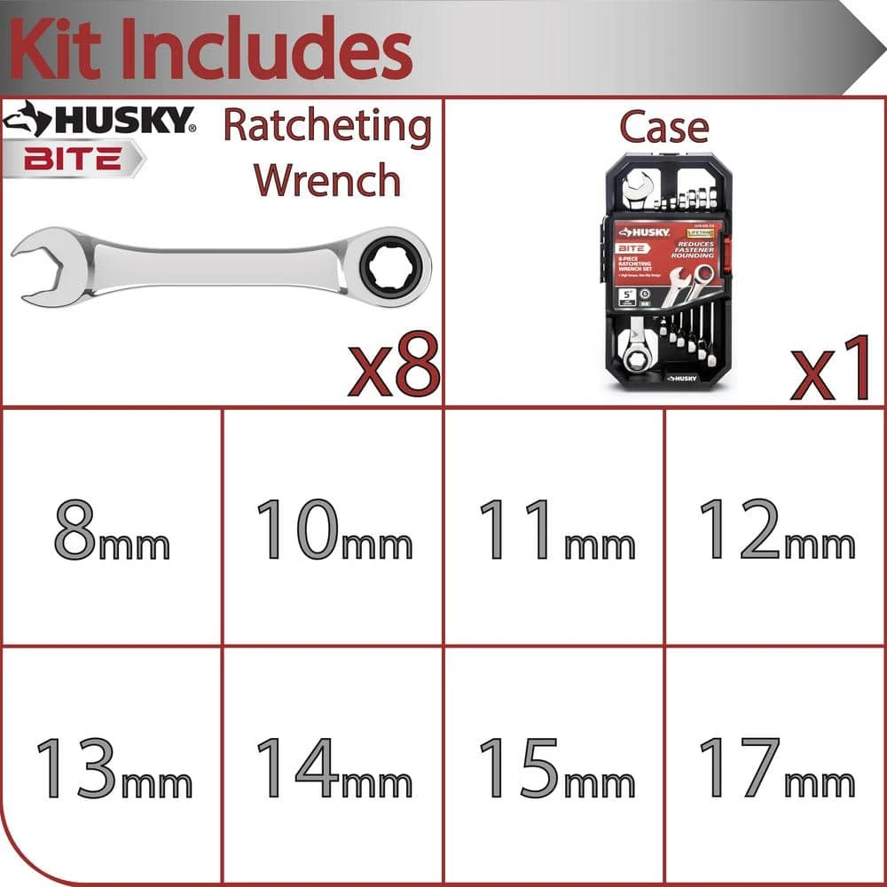 The new Husky BITE Metric Ratcheting Combination Wrenches with BITE technology allow you to get tough jobs done. These wrenches feature an innovative BITE design on both the open and box ends of the wrench. This improved design increases grip strength by focusing rotation force on the flats of the fastener rather than the corners to reduce rounding, allowing the user to apply 45% more torque before a fastener rounds vs. a standard wrench. Each long-pattern wrench is 10% longer than standard Husky wrenches, providing better access to hard-to-reach fasteners. The added length also gives the user greater leverage to remove stubborn nuts and bolts. Husky BITE wrenches offer increased grip on new and rounded fasteners, better access, more torque, and more leverage, making them a great addition to any toolbox.
