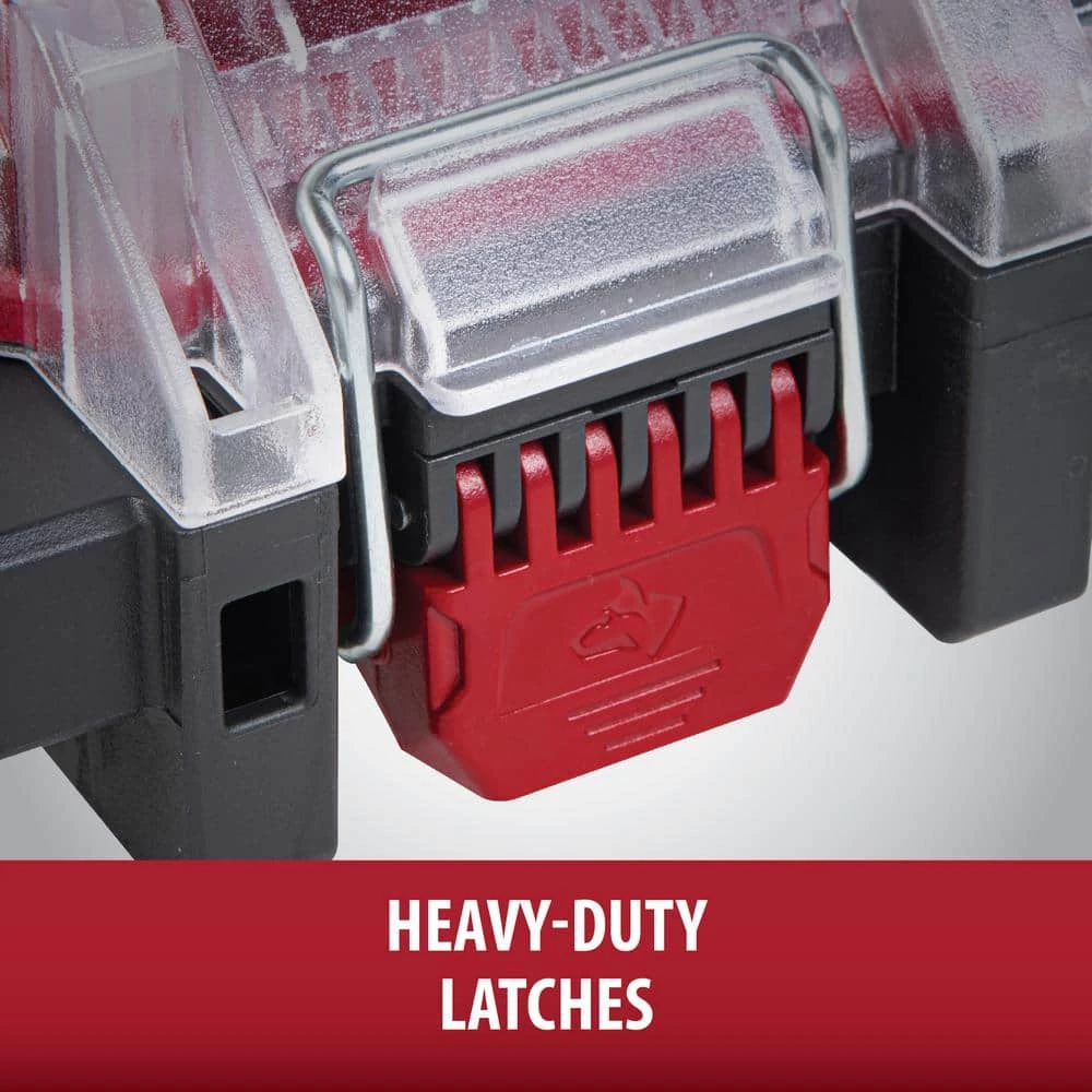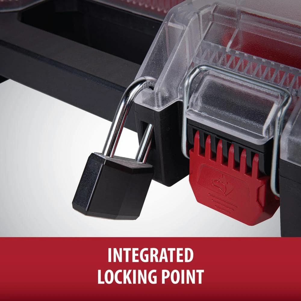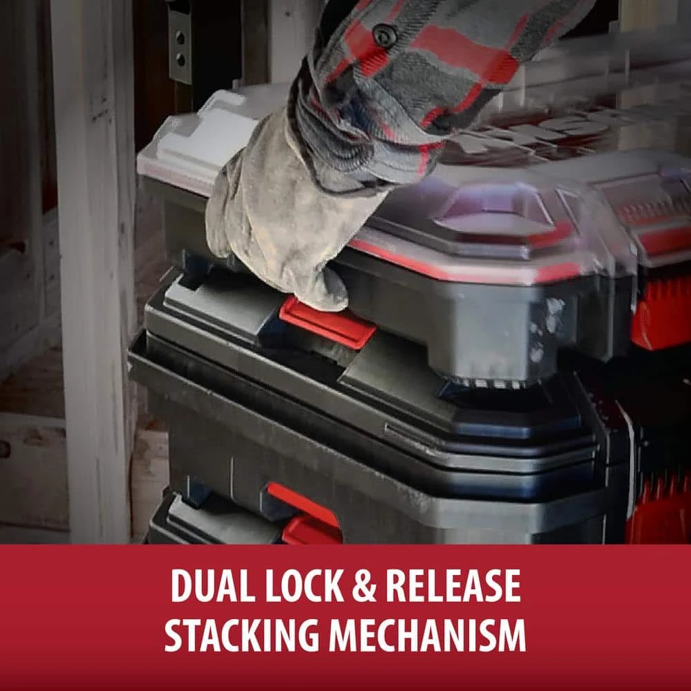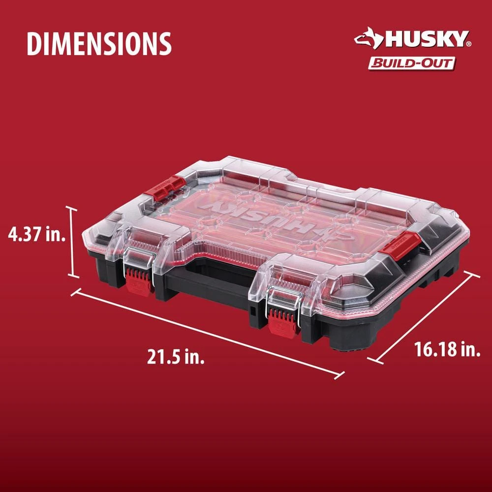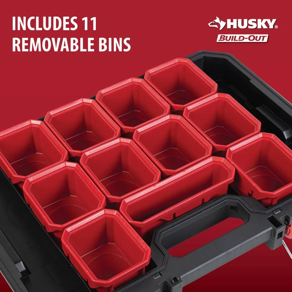 The Husky Build-Out Deep Organizer is a mid-size tool box built to keep all your small components organized for easy transport. Capable of supporting up to 50 lbs with an IP65 rating, this box is built for harsh jobsite environments. Inside, 11 removable bins are secured in place by the clear, impact resistant lid so contents don’t spill during transport. Hang the bins on the exterior accessory rail for quick access during your workday. The Husky Build-Out system creates customizable modular storage that gets you and your tools to the job site faster. The system includes tool boxes, organizers, crates, and accessories, all designed to seamlessly secure together in many different configurations.