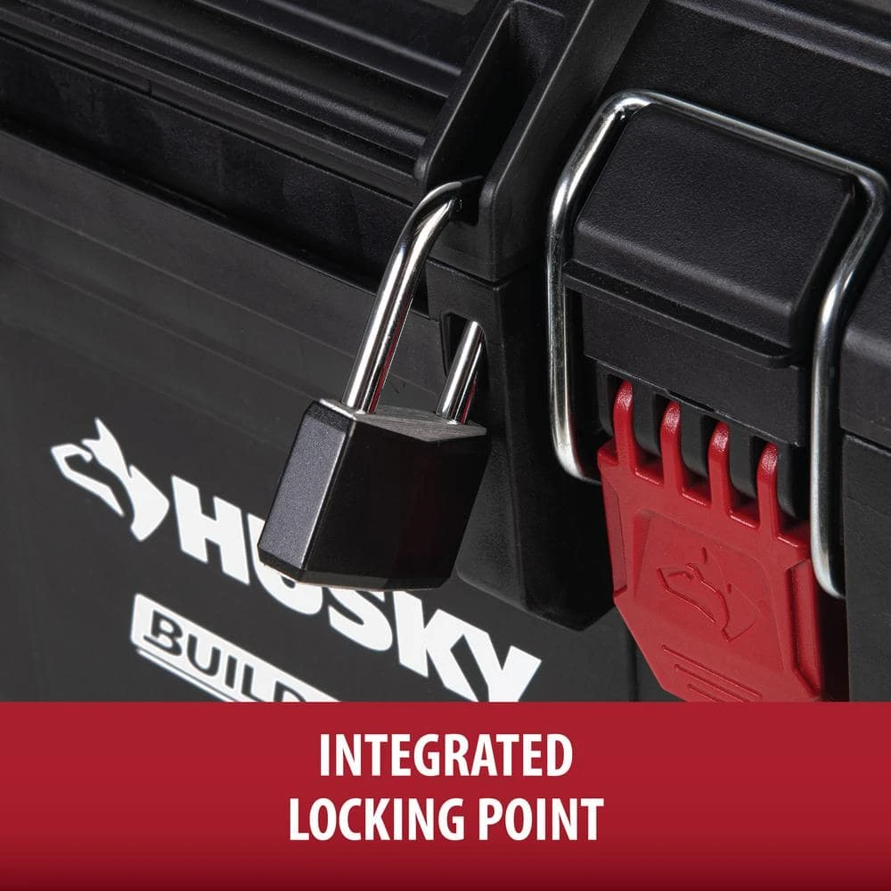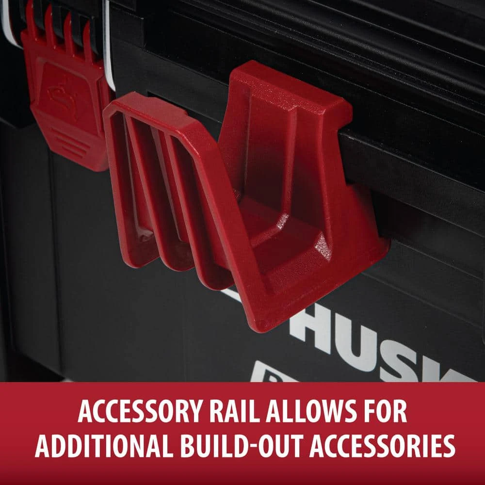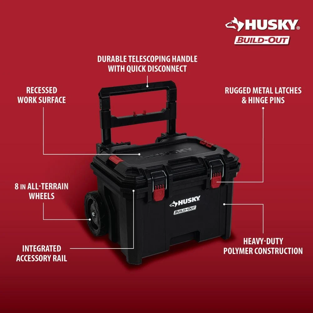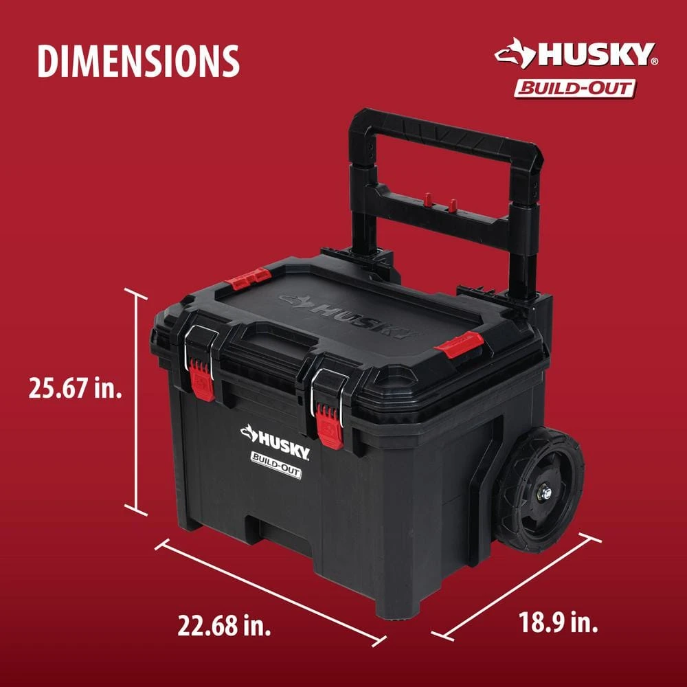 The Husky Build-Out Rolling Tool Box is designed to transport your heaviest equipment with ease. Constructed with impact-resistant polymers and 8-inch all-terrain wheels, it’s built to withstand even the harshest jobsite conditions. Secure additional organizers and tool cases on top of the rolling tool box with the dual lock & release stacking mechanism. Expand your storage system by connecting hooks and other accessories to the integrated accessory rail. The Husky Build-Out system creates customizable modular storage that gets you and your tools to the job site faster. The system includes tool boxes, organizers, crates, and accessories, all designed to seamlessly secure together in many different configurations.