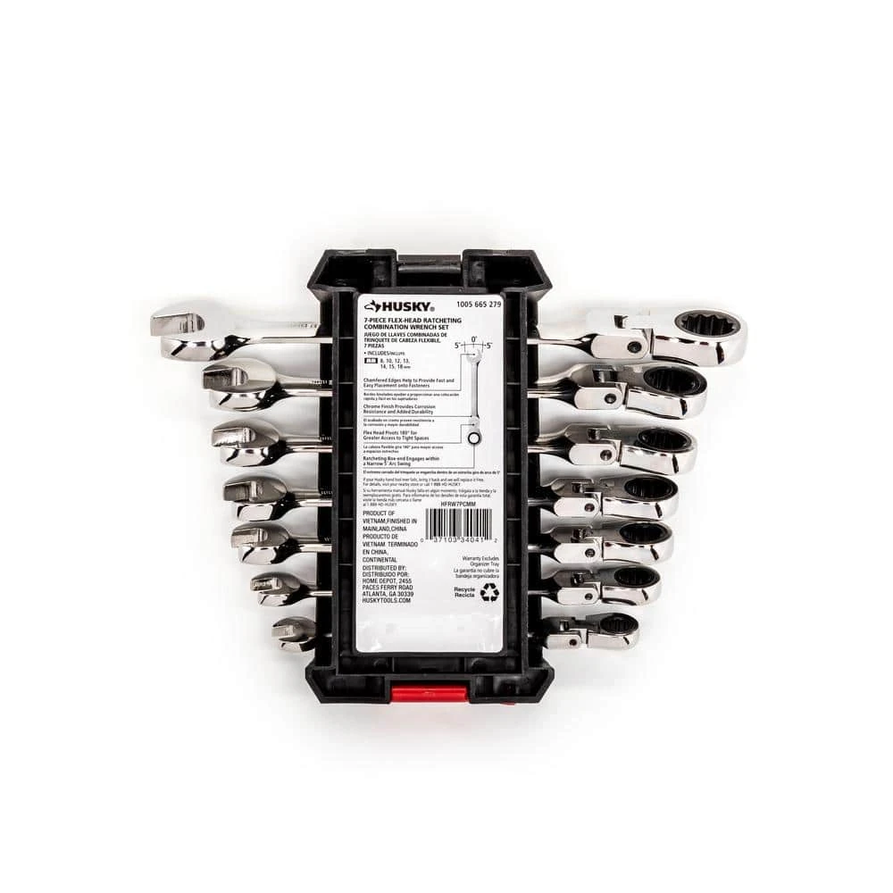 The versatile design of the 180° flexible head on these Husky ratcheting wrenches allows you to reach even the most troublesome fasteners. Their ratcheting box end design needs only 5° of rotation to engage fasteners and apply torque. Each wrench has a knurled side to its beam for easy identification of the ratcheting direction so you will know exactly if you are tightening or loosening the fastener.