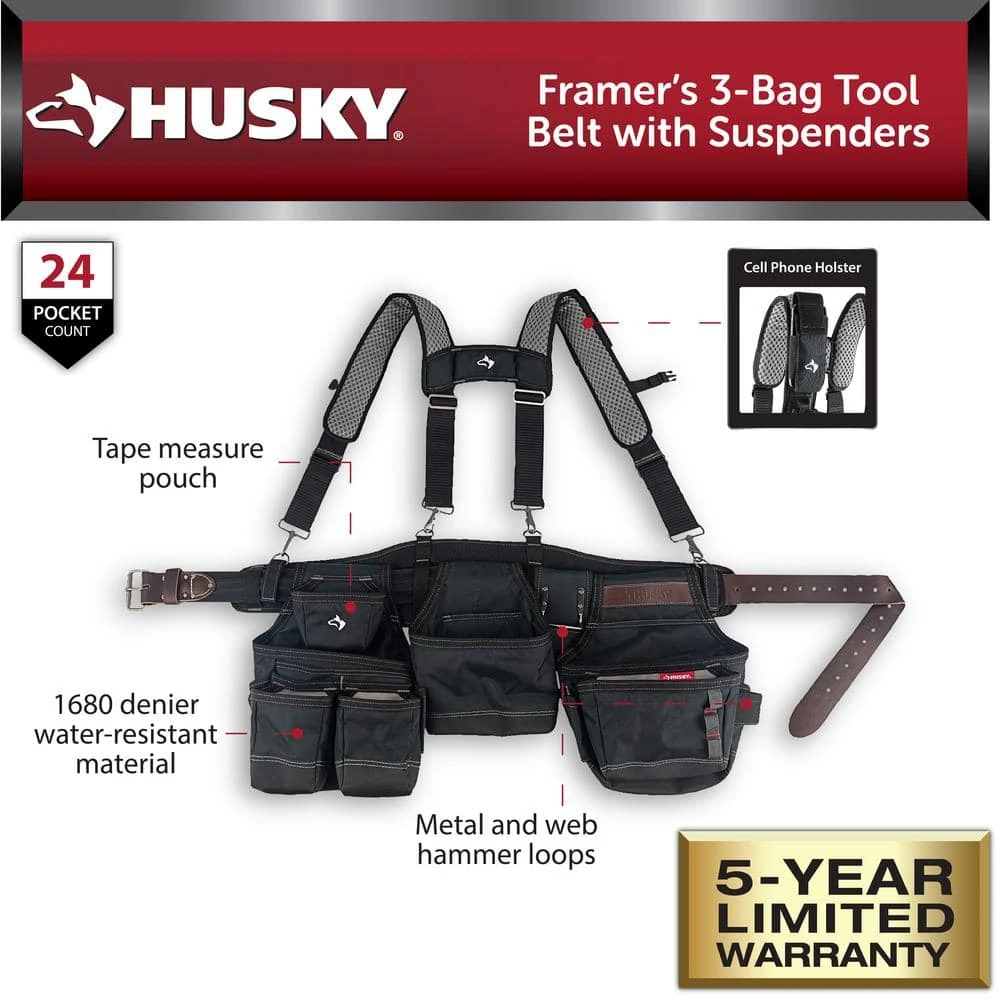 Husky continues its legacy of excellence on the jobsite with the all-new Heavy Duty Husky Framer’s Three Bag Tool Belt with Suspenders-a must-have for professionals. This tool belt is engineered with premium features and materials to ensure durability over time, offering an optimal configuration for efficient tool storage on any jobsite. Enhanced leather components on the belt ensure longevity and a polished appearance. The padded suspenders are breathable, designed to wick away moisture for added comfort during extended wear. Experience unparalleled quality with this exceptional tool belt from Husky. Upgrade your toolkit today with the Heavy Duty Husky Framer’s Three Bag Tool Belt and elevate your jobsite performance.