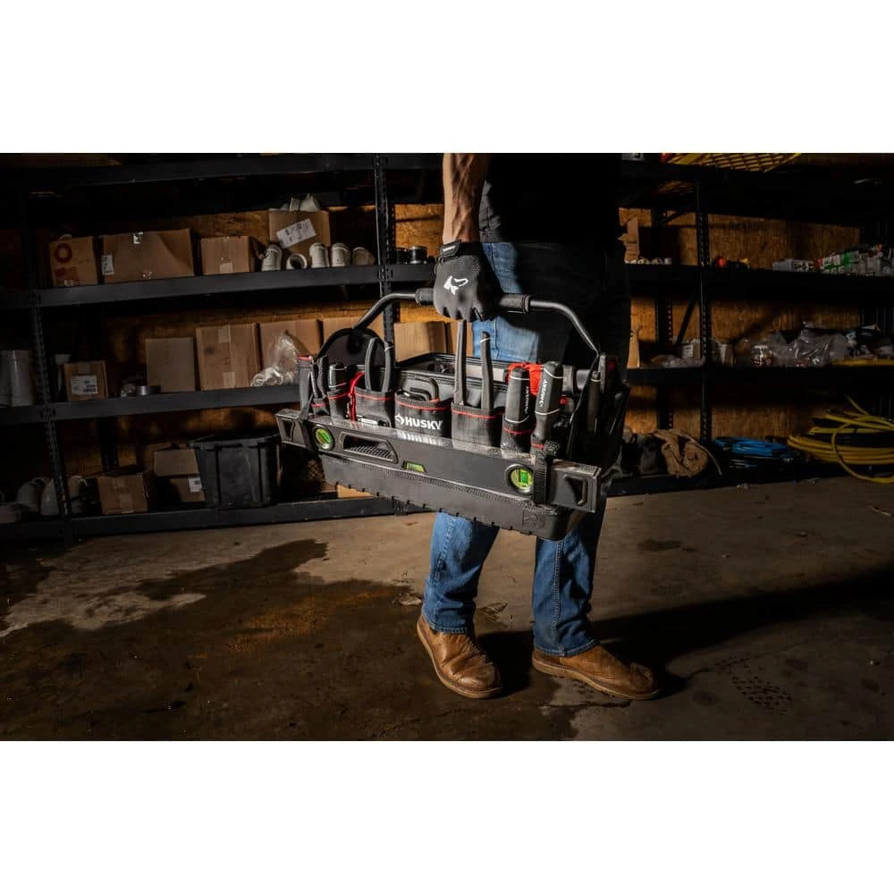 Built for the PRO, the 20 in. All-Trade Tool Tote is constructed of durable 1680D Polyester, reinforced ripstop pockets and waterproof hard base to withstand everyday jobsite usage. The 20 in. opening, removable wall and quick-disconnect handle allow for visibility and easy access to your tools. The 20 in. Tool Tote includes an easy-access tape clip, tape roll tether, and 31 total pockets to organize a variety of tools.