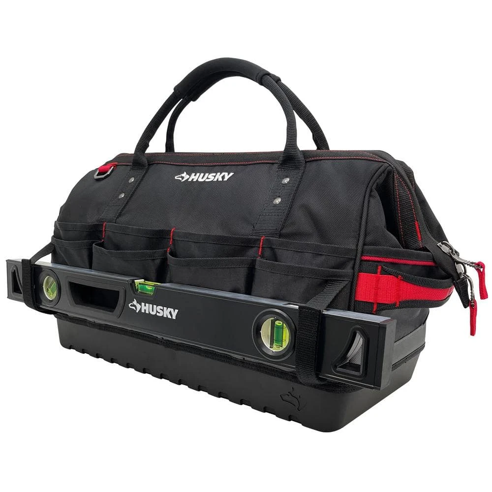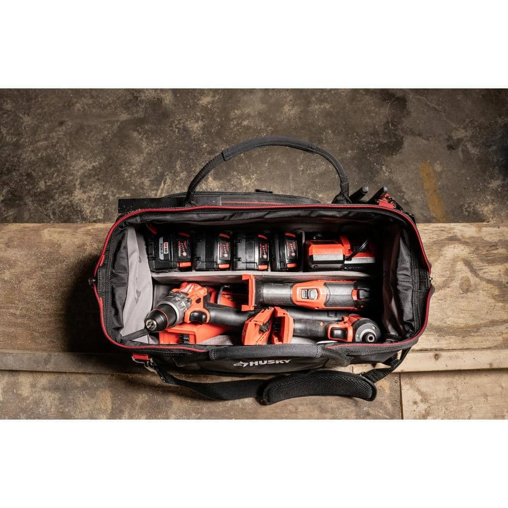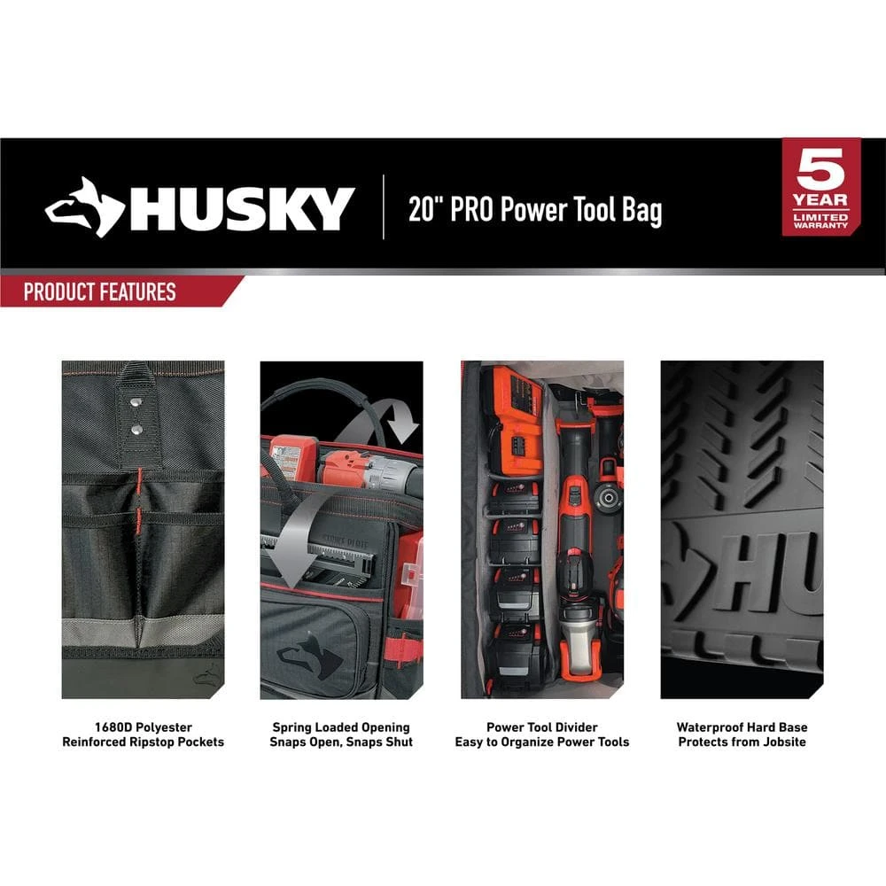 Built for the PRO, the 20 in. Power Tool Bag is constructed of durable 1680D Polyester, reinforced ripstop pockets and waterproof hard base to withstand everyday jobsite usage. The innovative spring-loaded large mouth holds the bag open for full access and holds shut securing items without having to be zipped. Modular internal dividers create customizable spaces for power tool organization. The 20 in. Power Tool Bag includes an easy-access tape clip, tape roll tether, and 14 total pockets to organize a variety of tools.