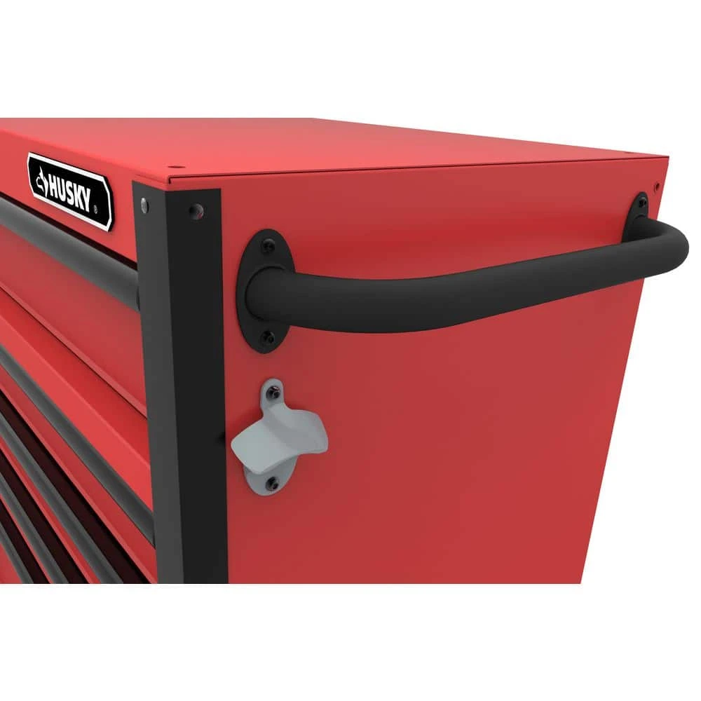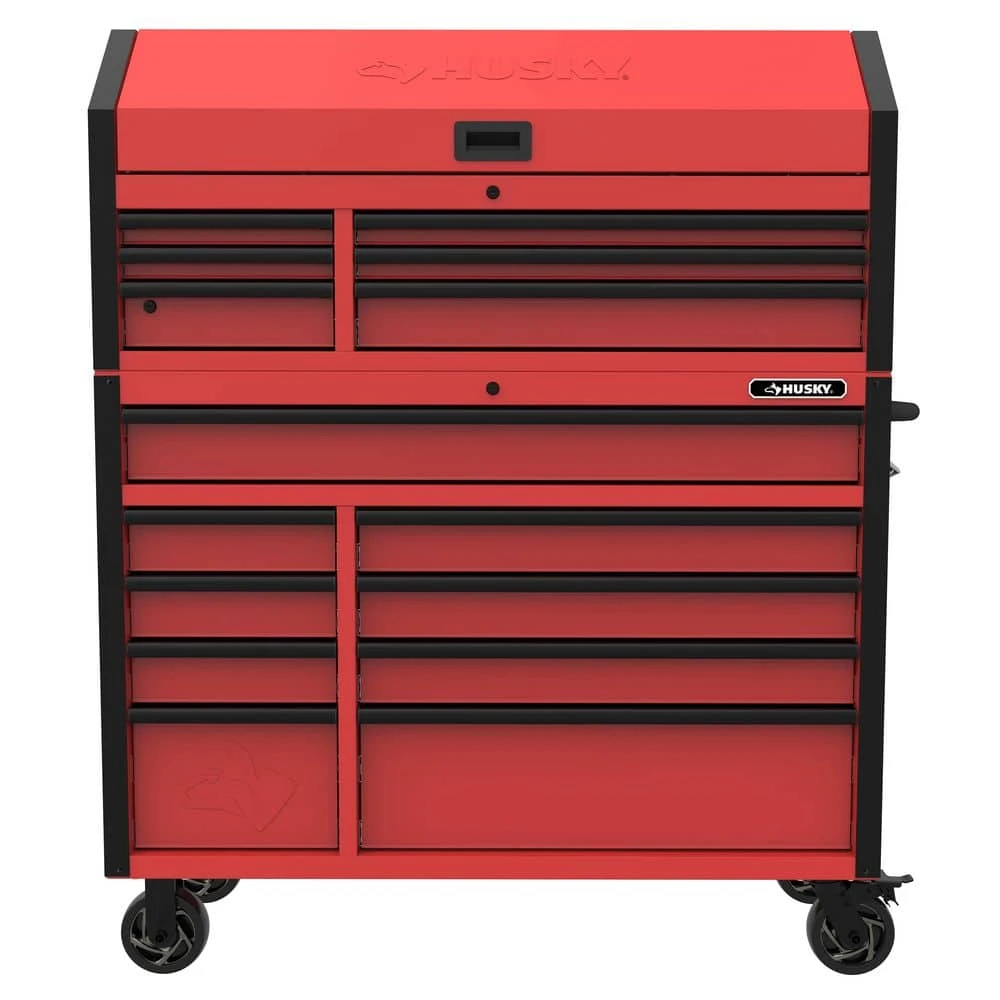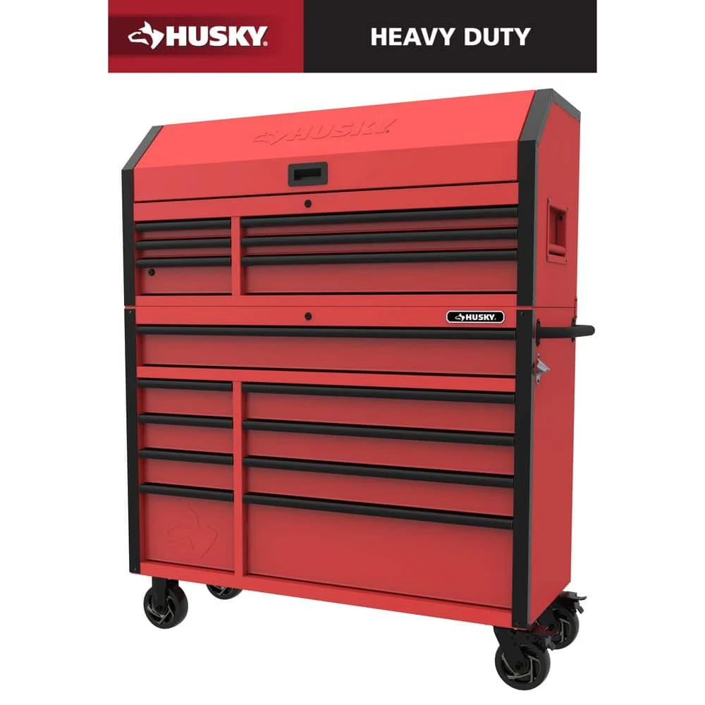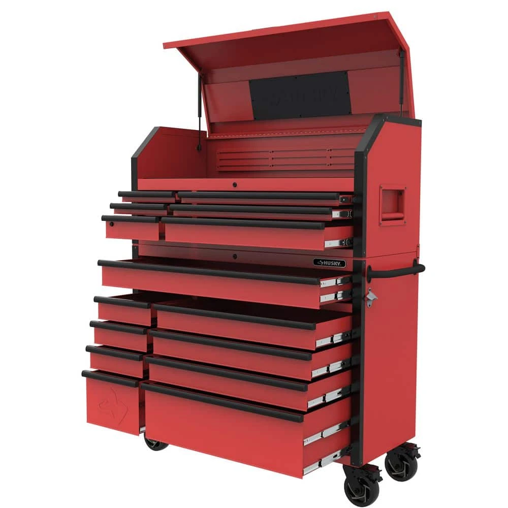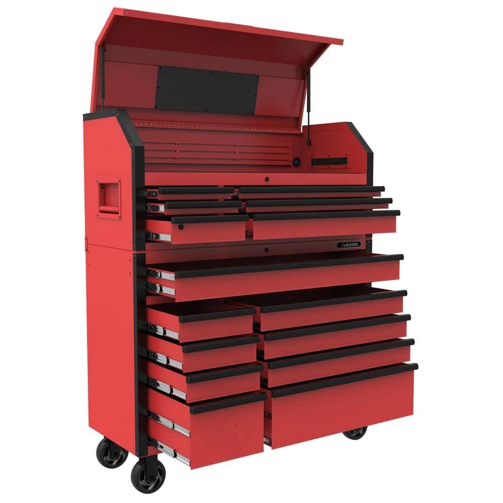 The latest generation of the Husky Heavy-Duty 52 in. W 15-Drawer Matte Red Steel Rolling Tool Chest Combo has arrived. The chest is built to last with all-welded 19-Gauge steel construction and is finished with a tough, industrial textured red powder-coat finish. All drawers are full-extension and glide on ball bearing slides that can support up to 120 lbs. These slides also have a soft-close retention system that pulls drawers closed and ensures that they are secured. An additional set of slides has been added to the full-width drawer and bottom deep drawers to accommodate heavier loads. The reinforced top lid is supported by gas struts, which make it easier to open and close, while the back of the top till has a large magnetic plate that provides storage and quick access to frequently used tools. Also, inside the lid are 6 electrical outlets and 2 USB ports that allow you to securely charge tools and portable devices while unit is locked. The casters have been upgraded to an even heavier-duty 6 in. x 2 in. size and moving the cabinet around your workplace is easy with the ergonomic tubular handle.