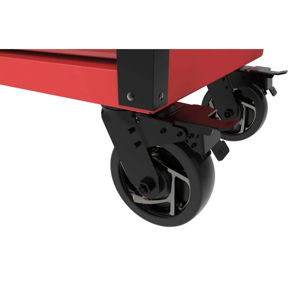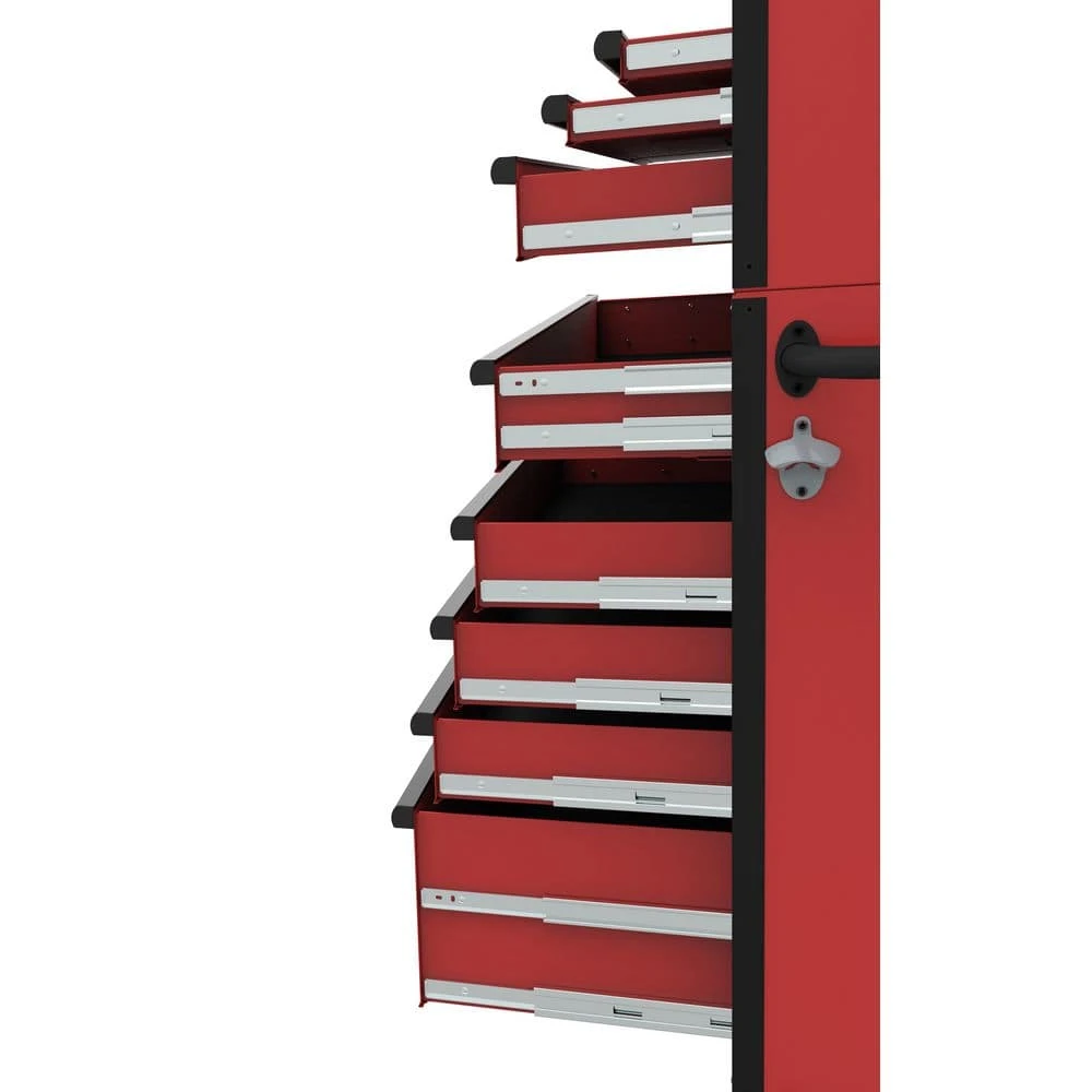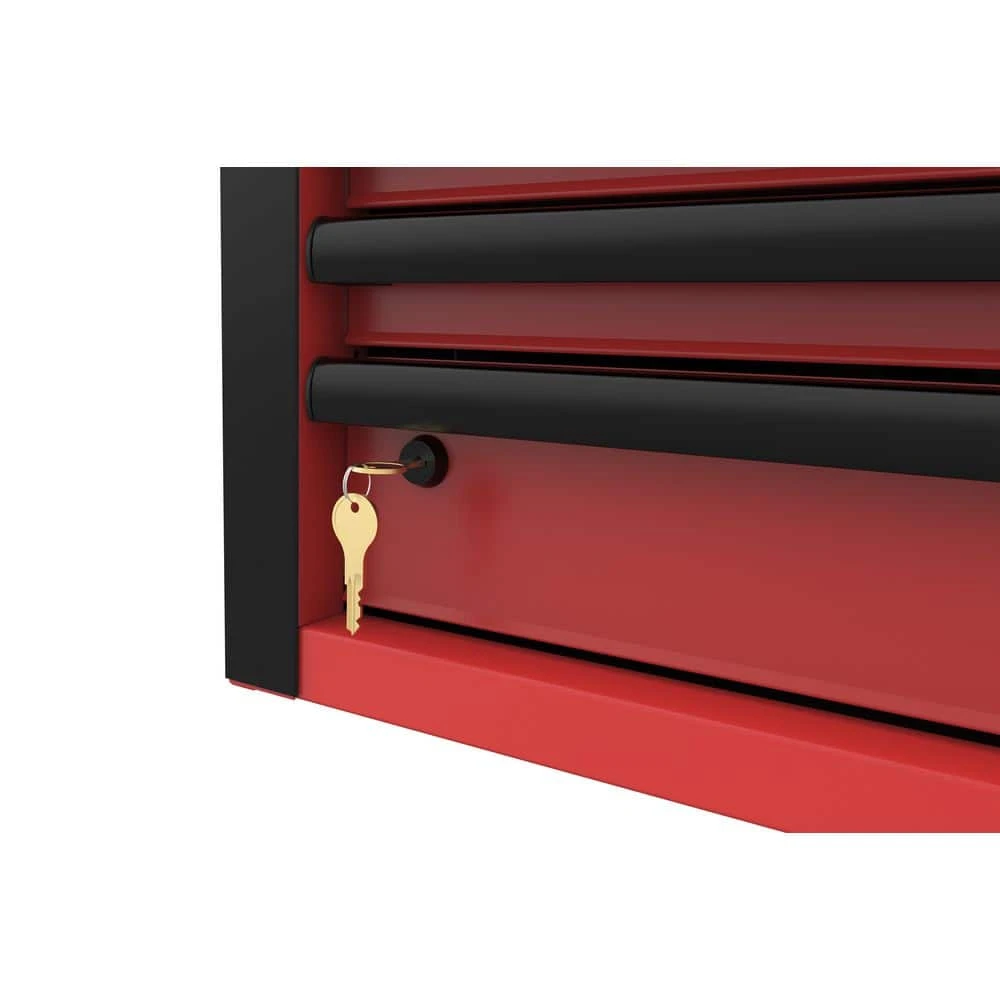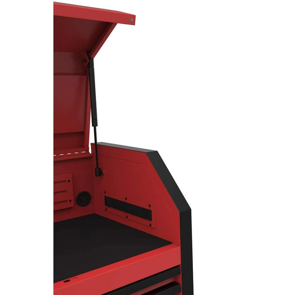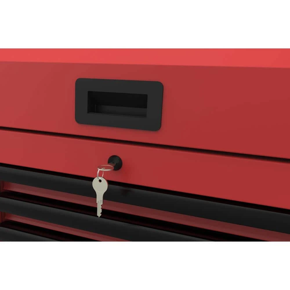 The latest generation of the Husky Heavy-Duty 52 in. W 15-Drawer Matte Red Steel Rolling Tool Chest Combo has arrived. The chest is built to last with all-welded 19-Gauge steel construction and is finished with a tough, industrial textured red powder-coat finish. All drawers are full-extension and glide on ball bearing slides that can support up to 120 lbs. These slides also have a soft-close retention system that pulls drawers closed and ensures that they are secured. An additional set of slides has been added to the full-width drawer and bottom deep drawers to accommodate heavier loads. The reinforced top lid is supported by gas struts, which make it easier to open and close, while the back of the top till has a large magnetic plate that provides storage and quick access to frequently used tools. Also, inside the lid are 6 electrical outlets and 2 USB ports that allow you to securely charge tools and portable devices while unit is locked. The casters have been upgraded to an even heavier-duty 6 in. x 2 in. size and moving the cabinet around your workplace is easy with the ergonomic tubular handle.