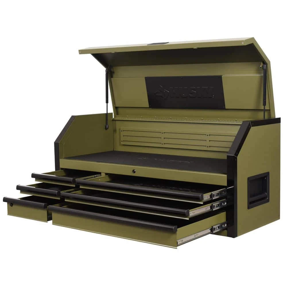 Latest generation of the Husky Industrial 52 in. W x 21.5 in. D 6-Drawer Tool Chest has arrived. The chest is built to last with all-welded steel construction and is finished with a tough, industrial matte army green powder-coat finish. All drawers are full-extension and glide on ball bearing slides that can support up to 120 lbs. These slides also have a soft-close retention system that pulls drawers closed and ensures that they are secured. The reinforced top lid is supported by gas struts, which make it easier to open and close, while the back of the top till has a large magnetic plate that provides storage and quick access to frequently used tools. Also, inside the lid are 6 electrical outlets and 2 USB ports that allow you to securely charge tools and portable devices while unit is locked. Pair this chest with the coordinating 9-drawer cabinet (Model: H52TR9HDV4) to create the ultimate tool storage solution.