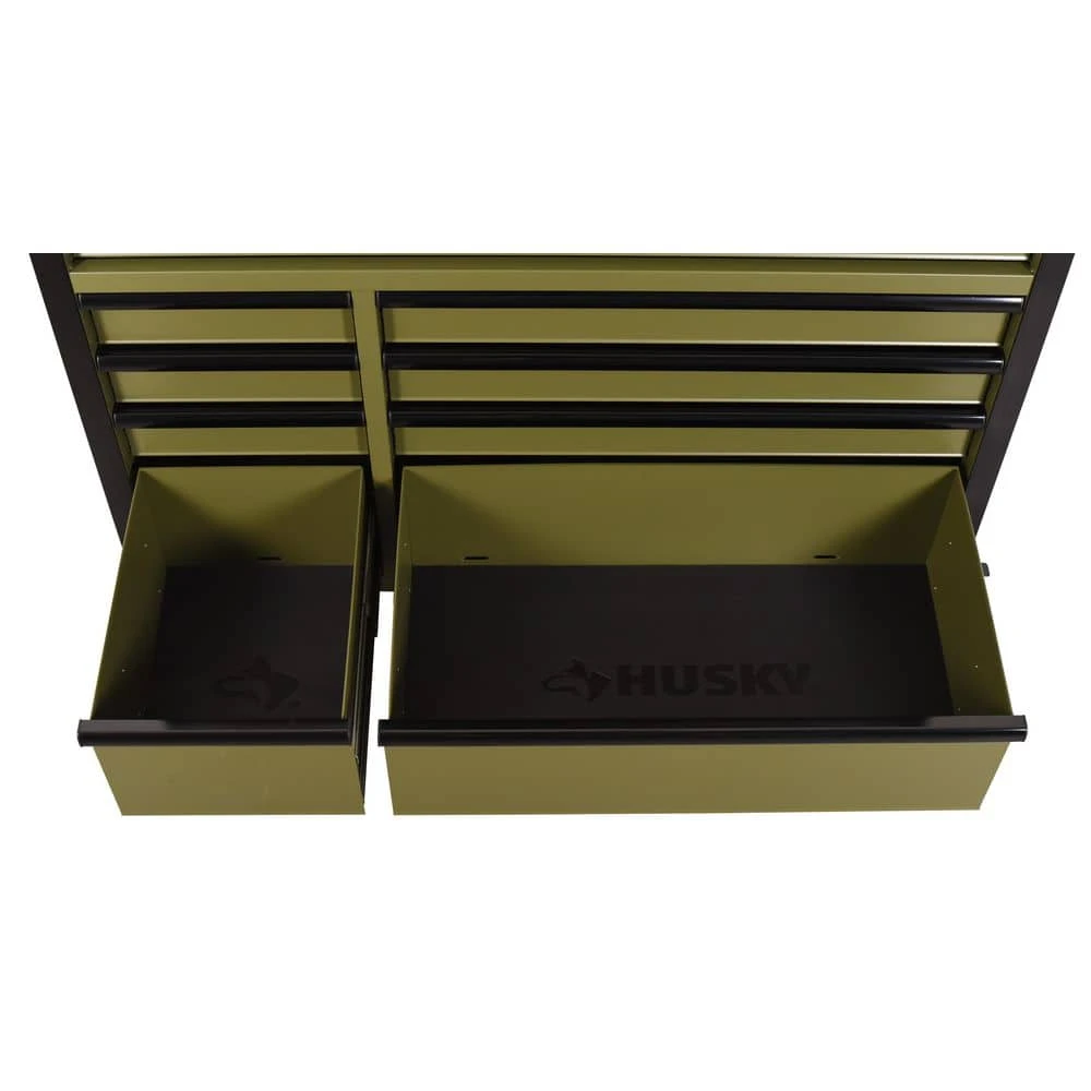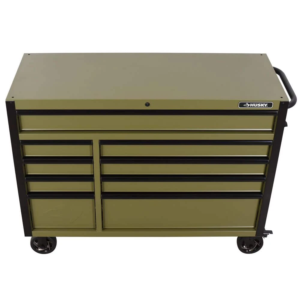 The latest generation of the Husky Industrial 52 in. W x 21.5 in. D 9-Drawer Rolling Cabinet Tool Chest has arrived. This cabinet adds some exciting new features to an already popular design. An additional set of slides has been added to the full-width drawer to accommodate heavier loads. The casters have been upgraded to an even heavier-duty 6 in. x 2 in. size. The cabinet is built to last with all-welded steel construction and is finished with a tough, industrial matte gray powder-coat finish. All drawers are full-extension and glide on ball bearing slides that can support up to 120 lbs. These slides also have a soft-close retention system that pulls drawers closed and ensures that they are secured. Moving the cabinet around your work place is easy with the ergonomic tubular handle. Pair this chest with the coordinating 6-drawer chest (Model: H52CH6HDV4ARMY) to create the ultimate tool storage solution.