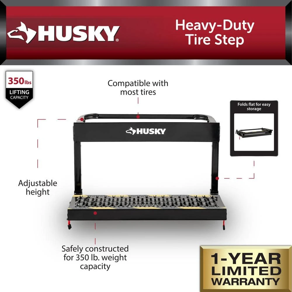 The Husky Heavy-Duty Tire Step is a highly durable tire-mounted step designed for use with trucks and SUVs. Easy to attach and secure to the tire of most vehicles. Provides the user with extra height to work on engines, clean hard to reach areas, replacing the wiper blades and accessing the roof racks. The weight capacity is up to 350 lbs. The Husky Heavy-Duty Tire Step is a must have for any auto enthusiast.