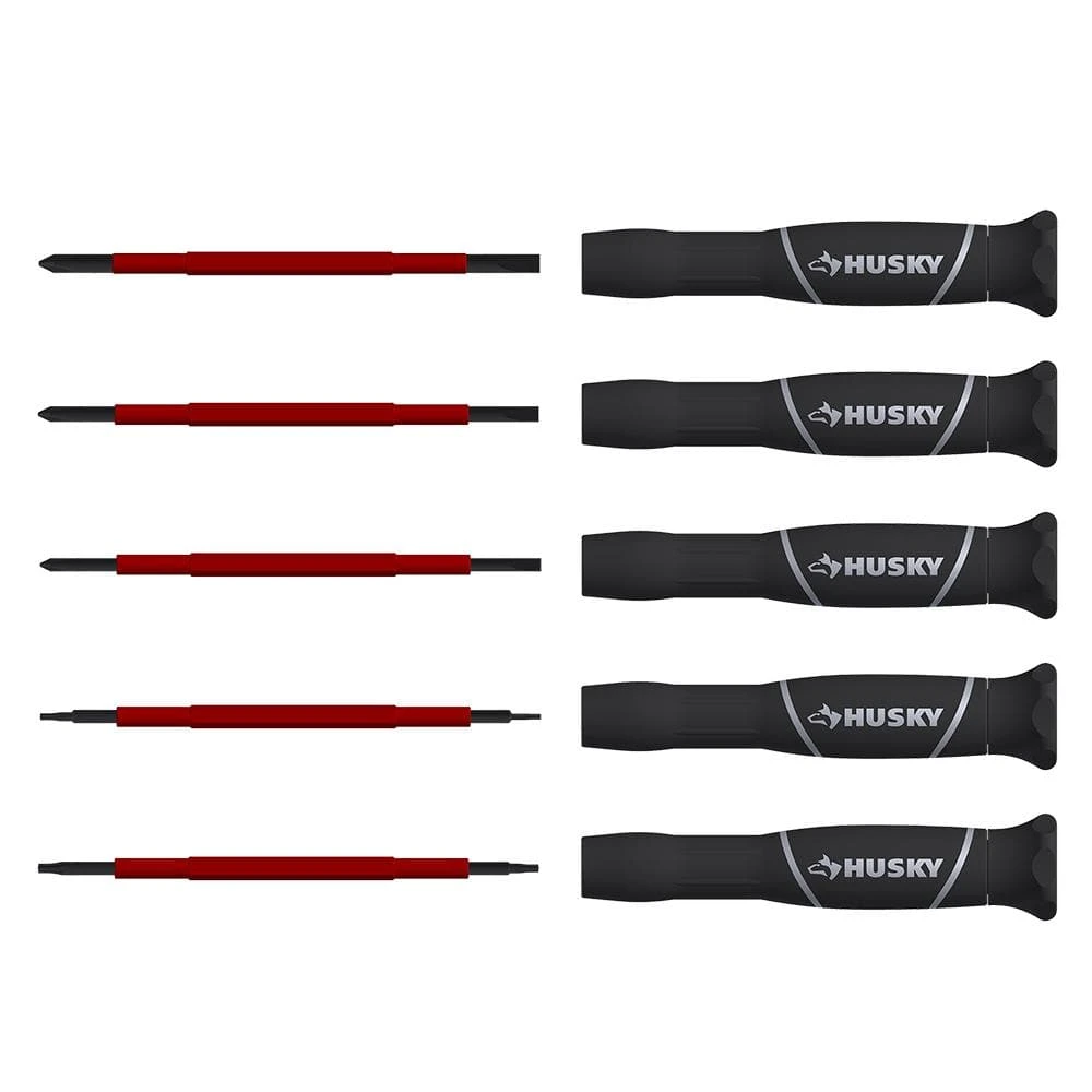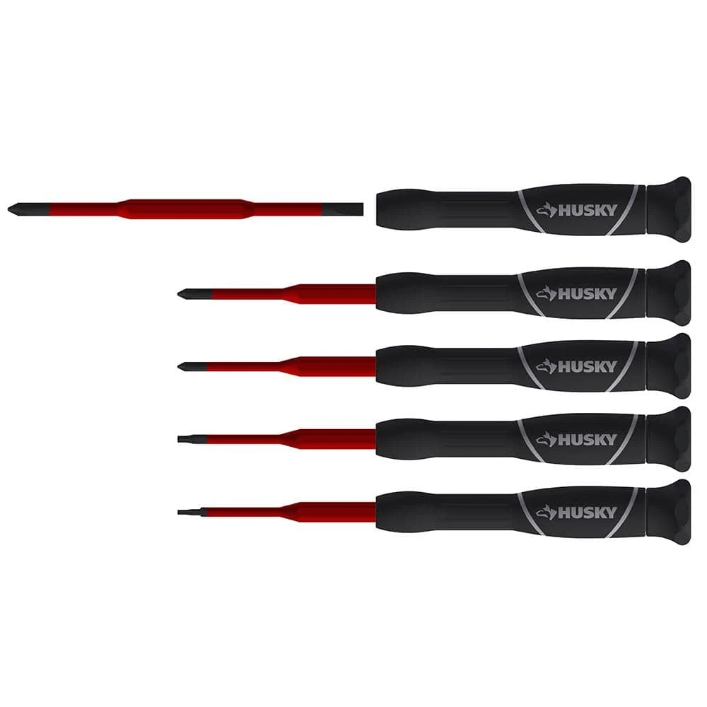 The Husky 5-Piece Insulated Precision Screwdriver Set includes Slim-Tip double ended interchangeable blades with PH #00 and ST 1/8 in., PH #0 and ST 3/32 in., PH #1 & ST 1/16 in., Square #0 and ST 5/64 in., TORX T6 &and T8. This tool set is individually tested and certified to insulated tool standards IEC 60900, ASTM F1505 to ensure safe working. The handle is new designed dual material handle to provide greater torque and increased comfort. New designed insulation material is perfect for electric insulation and fire resistance. S-2 tool steel interchangeable blades are great for durability and are heat treated for strength and the precision formed tips ensure an accurate fit to limit cam-out.